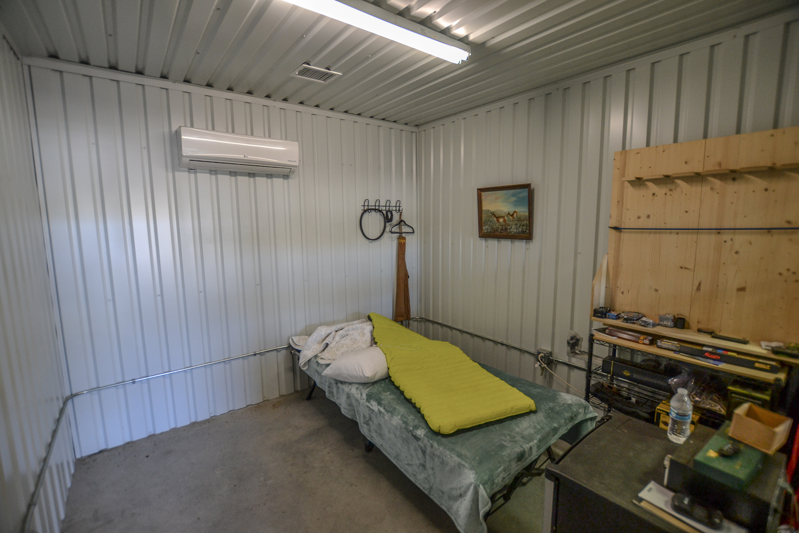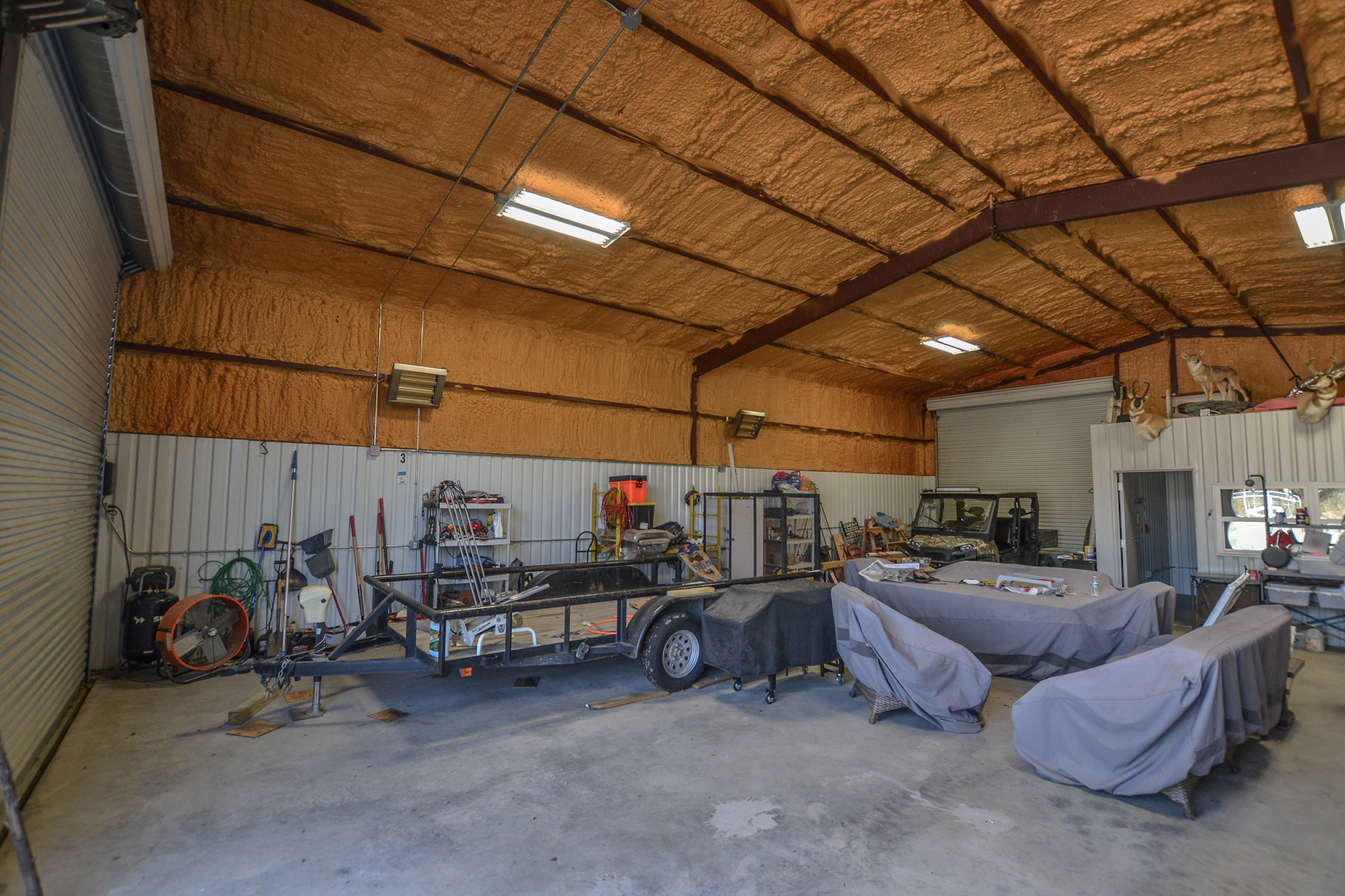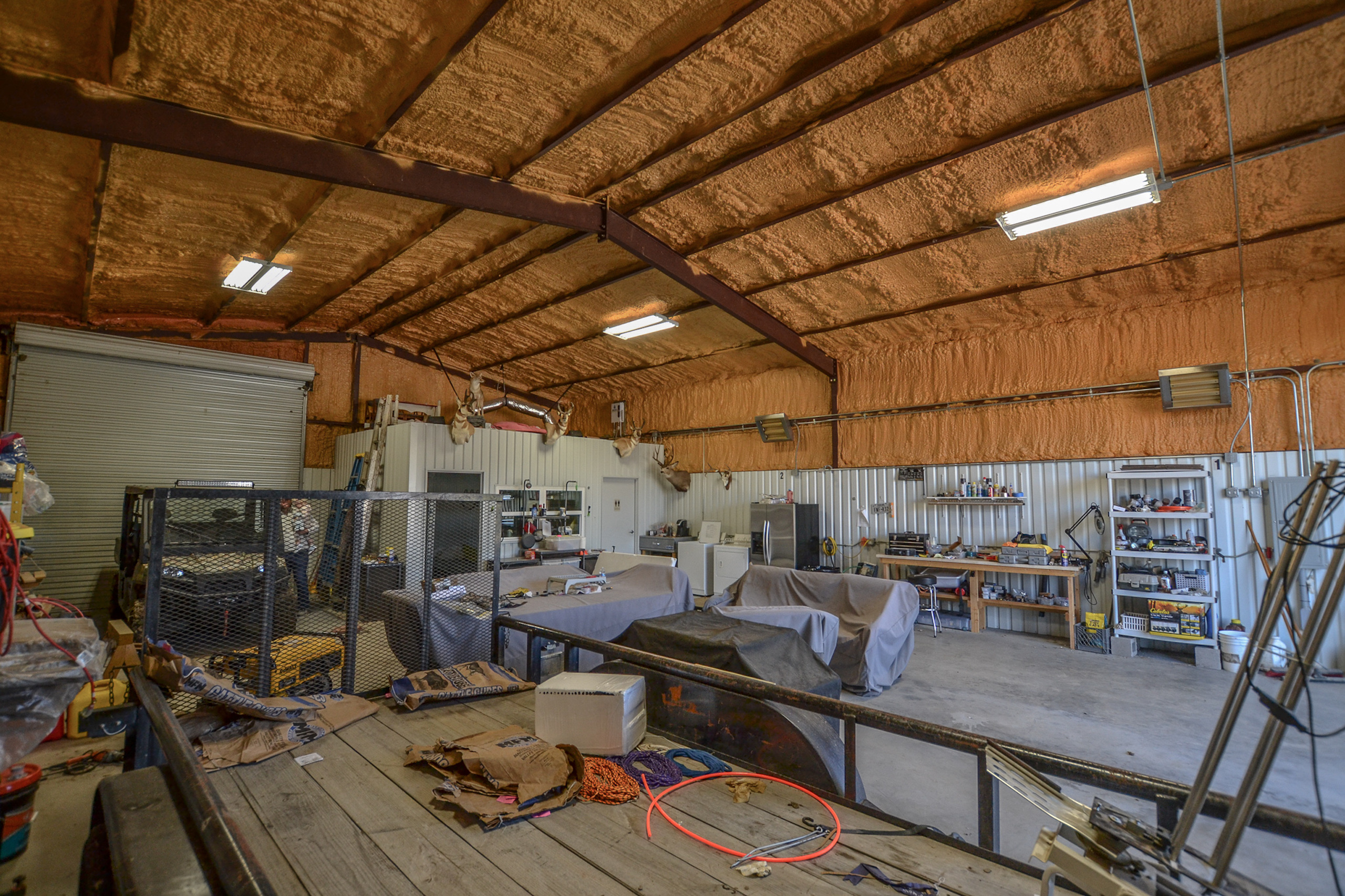 - Spray foam insulated Barndominium on-site with water and electric, living space, storage, bathroom and shower, bunkroom, and more