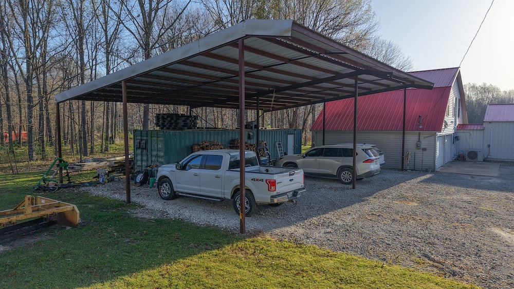 Additional improvements include a garage and a large covered parking area suitable for vehicles, equipment, or recreational storage. The property offers space for further development of trails, food plots, or additional structures, depending on buyer preferences and intended use.