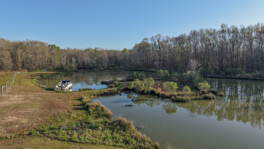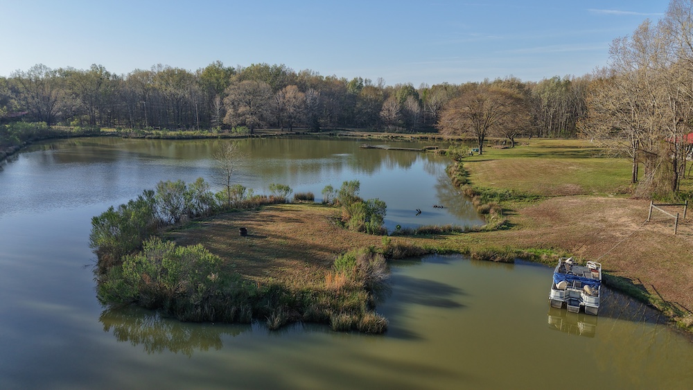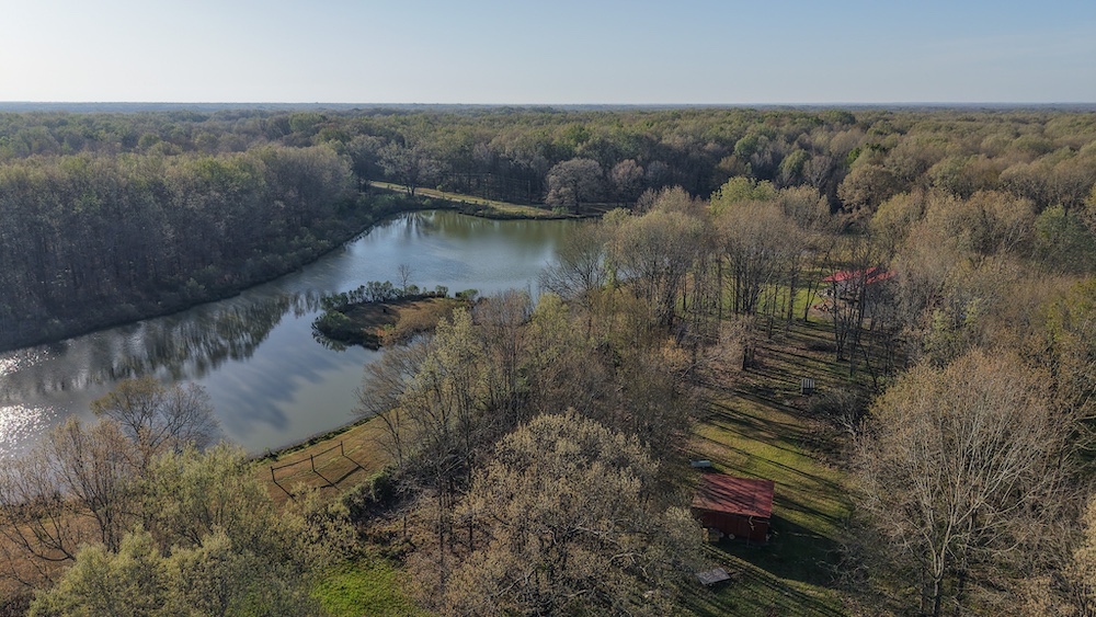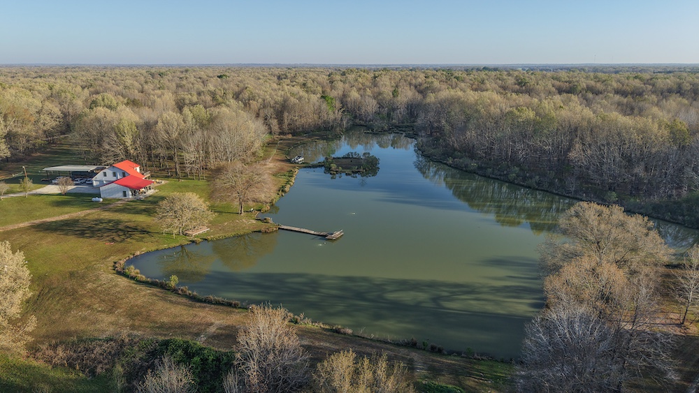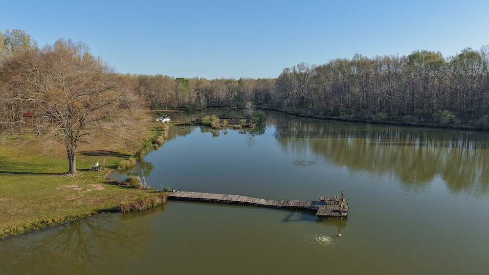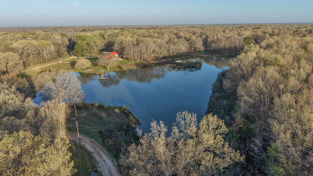The pond is a central feature of the property and provides opportunities for fishing and seasonal waterfowl activity. The pond is reported to contain bass and is large enough to support consistent use. The surrounding terrain includes hardwood timber with a mix of mature trees, contributing to wildlife habitat and natural cover.