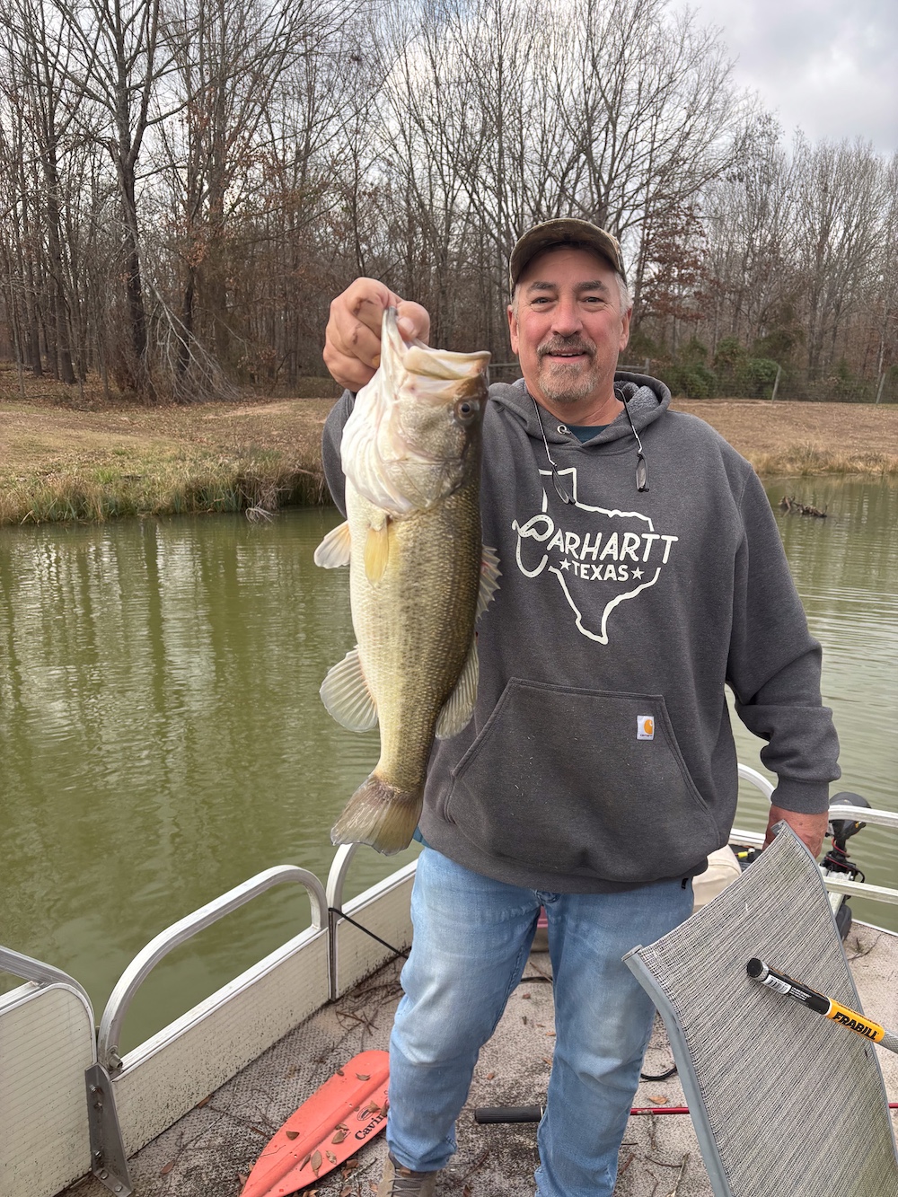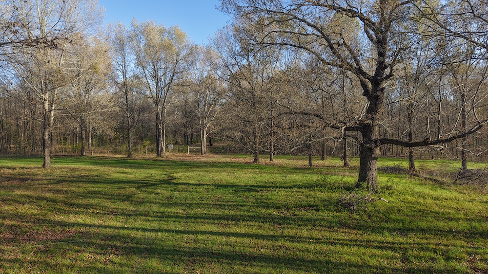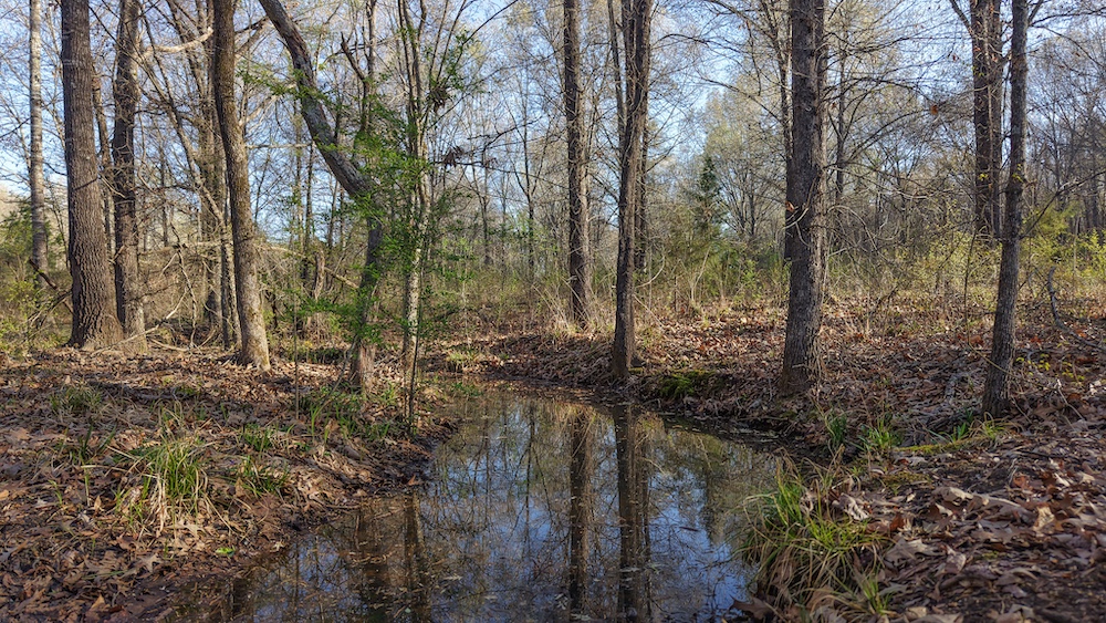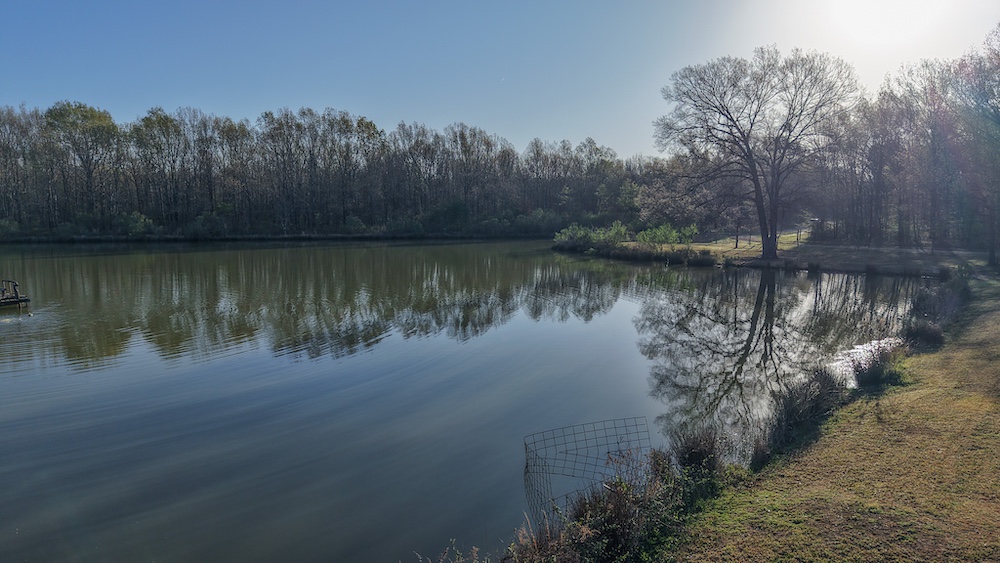 The pond is a central feature of the property and provides opportunities for fishing and seasonal waterfowl activity. The pond is reported to contain bass and is large enough to support consistent use. The surrounding terrain includes hardwood timber with a mix of mature trees, contributing to wildlife habitat and natural cover.