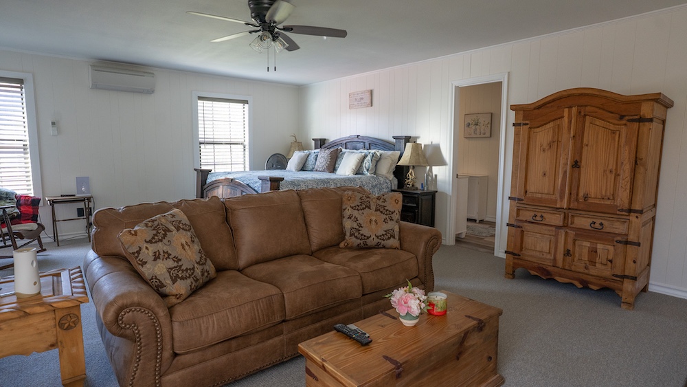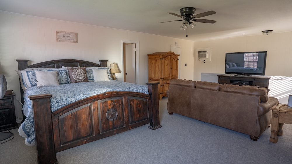 Improvements include a two-bedroom, two-bathroom home positioned to overlook the pond. The home features a large great room with a fireplace and windows that provide views of the water. The layout is designed to maximize visibility of the surrounding landscape while maintaining a functional interior space. Two covered porch areas and an upstairs balcony off the bedroom provide exceptional views and great place to spend the day.