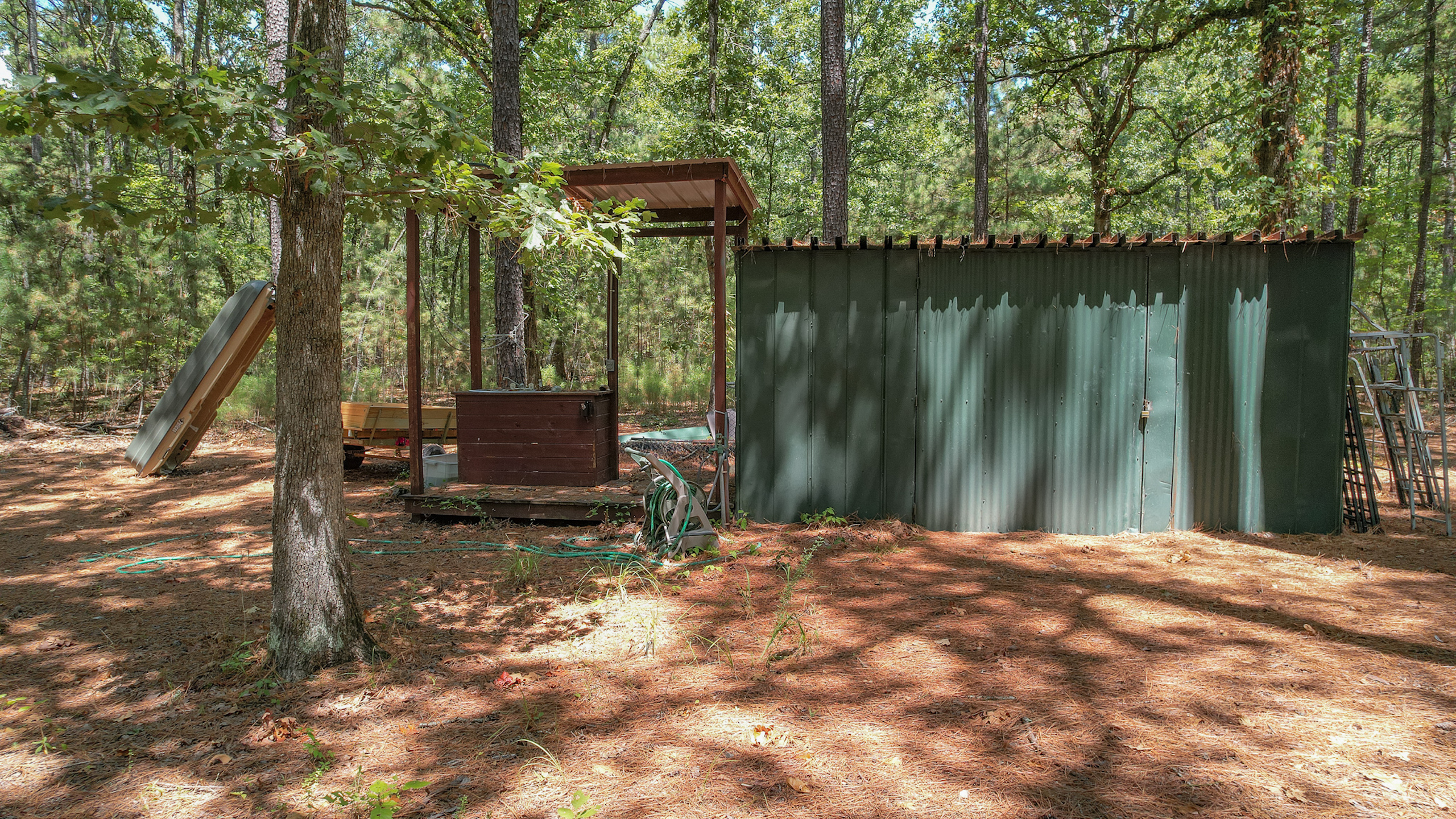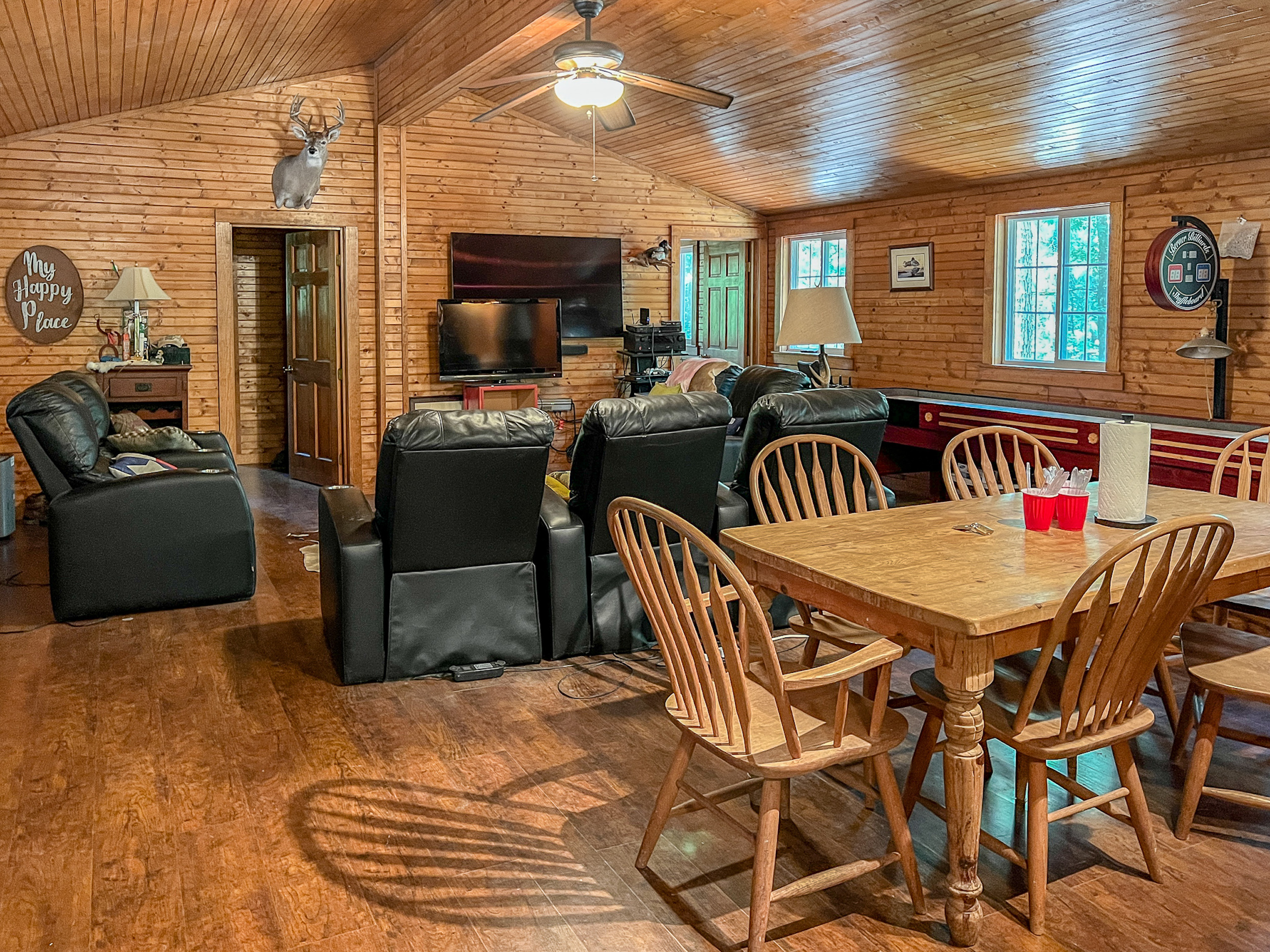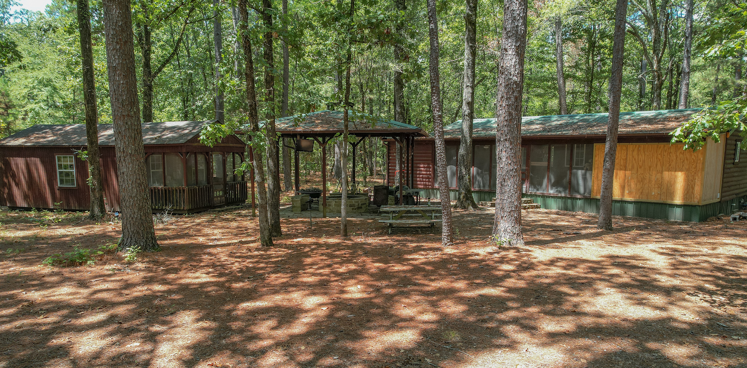 This property has a lot to offer! The two-bedroom cabin sits back off the road, surrounded by towering oaks and pines. It has a large screened-in porch with a storage room and a laundry room on either end. Inside, you will find a large living area that is great for entertaining and even has a shuffleboard table! Outside there is a covered firepit area with a large flagstone paved area, a bunk house for extra sleeping, several storage buildings, and a game/fish cleaning area. The bass pond is around three acres and is a short walk back from the cabin. It’s a great place to relax and catch some fish and is complete with a covered dock. There are miles of trails on this property to take you around to all of the great hunting locations. Multiple food plot areas with fiberglass tower blinds and feeders are spread across the property to maximize the hunting potential. The woods and ground cover are ideal habitats for the healthy deer and hog populations the property holds. Don’t miss out on this one! Call today to schedule a private showing!