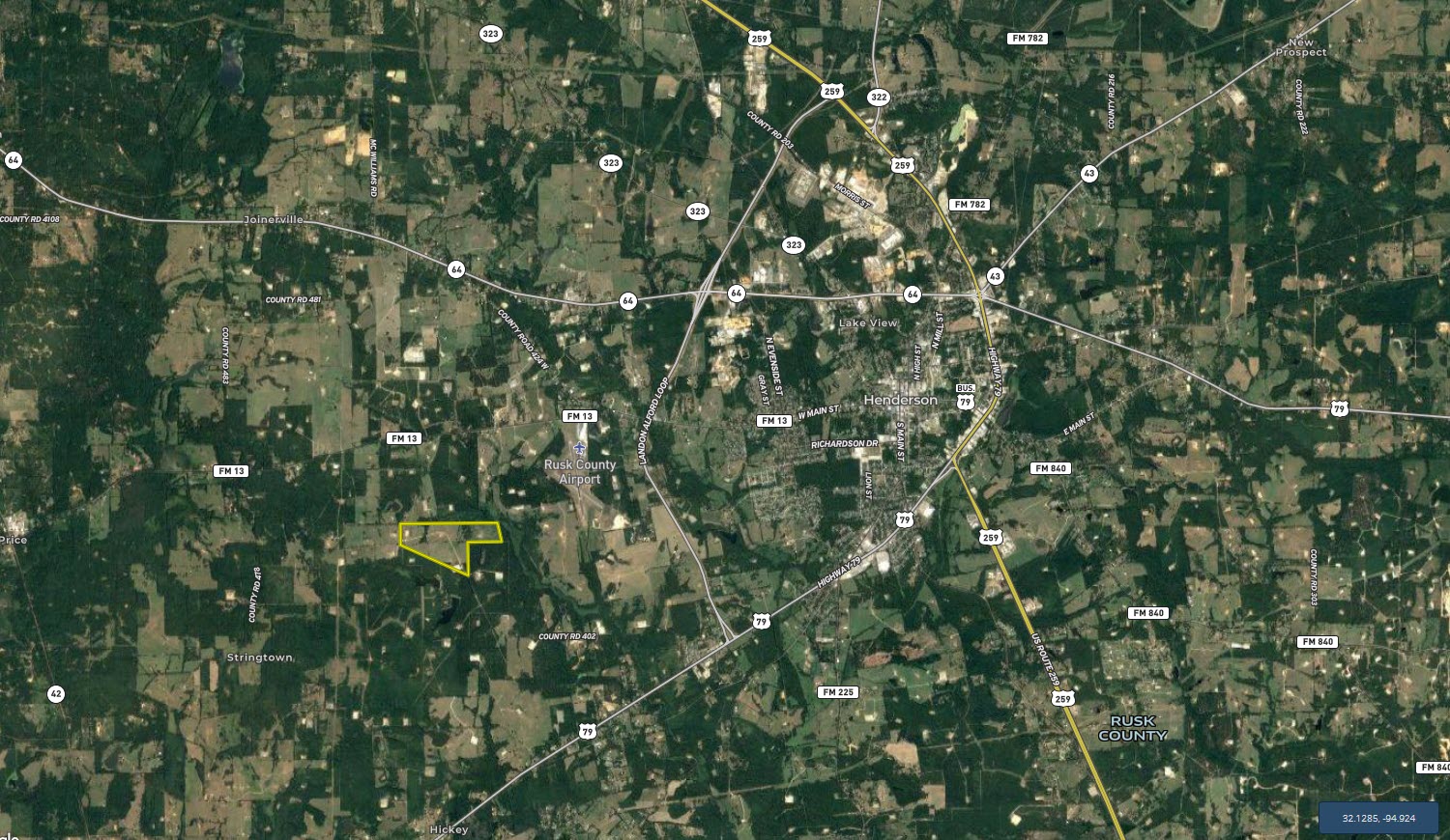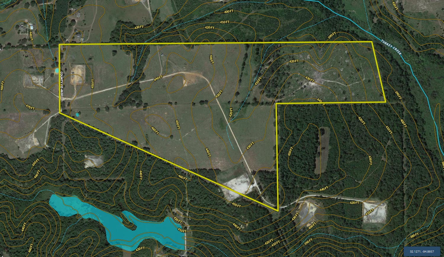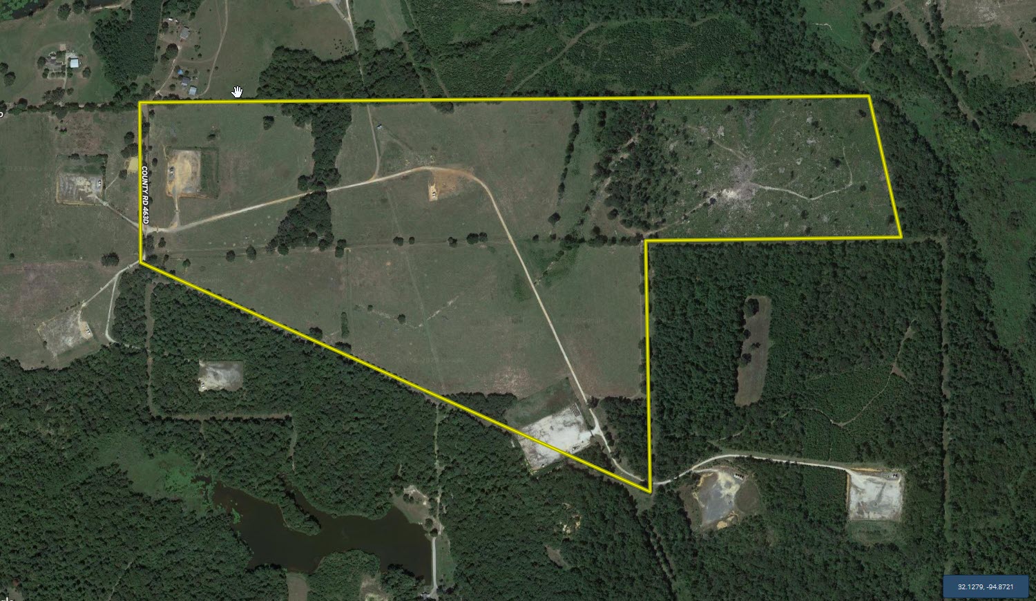 Location: This tract is located near the dead end of CR 463D, just west of the City of Henderson. The entrance to the property is located along the eastern boundary of the county road, more specifically at: 32.134, -94.8799.