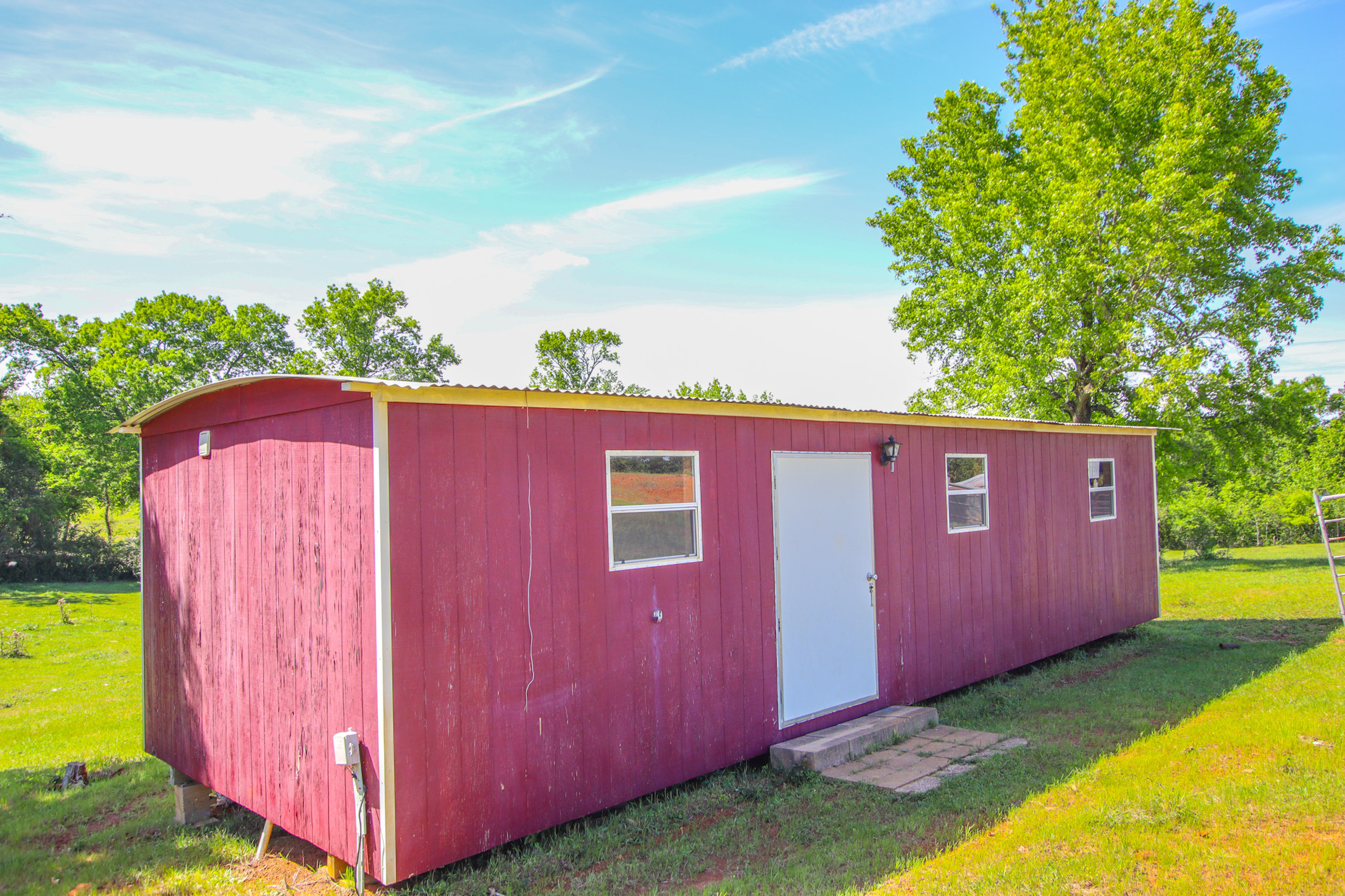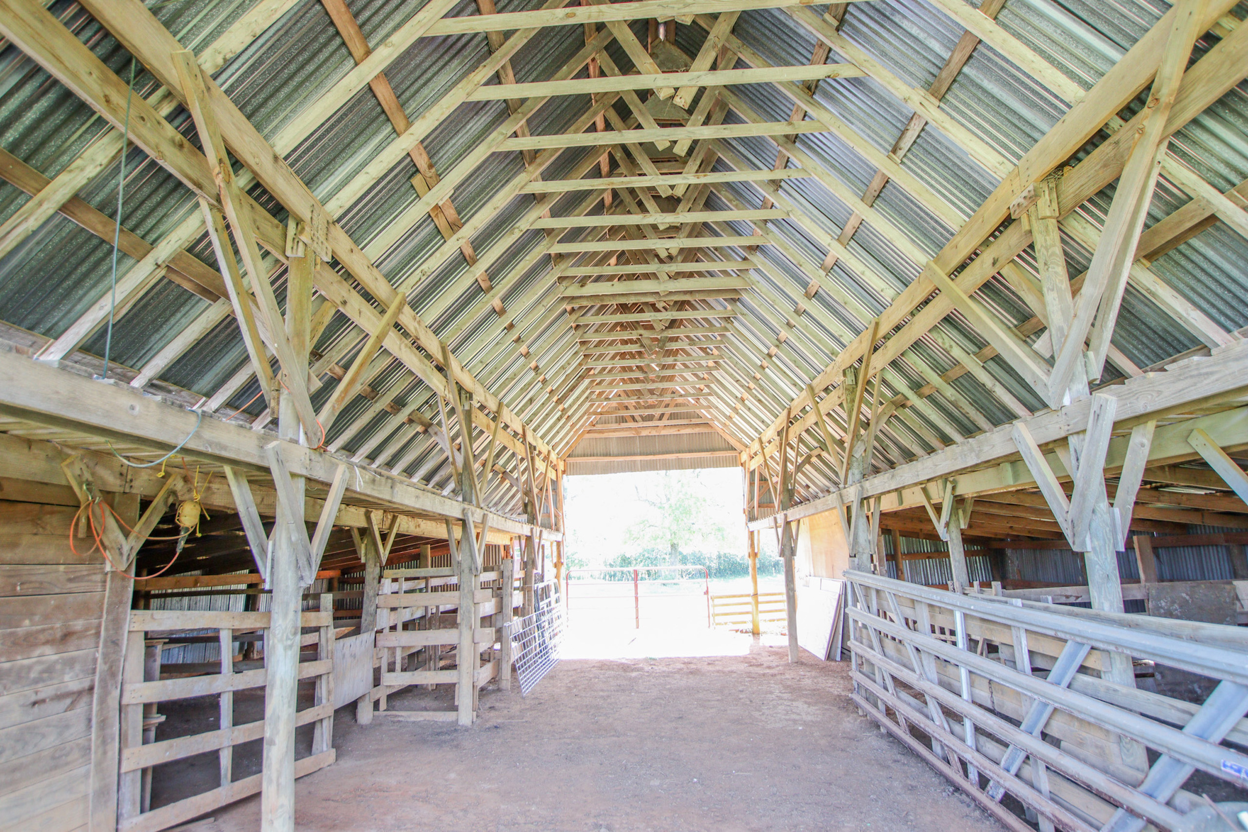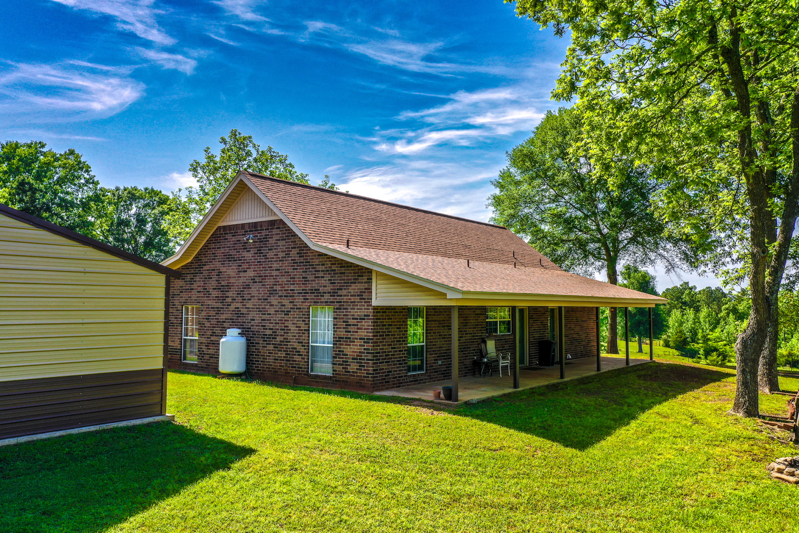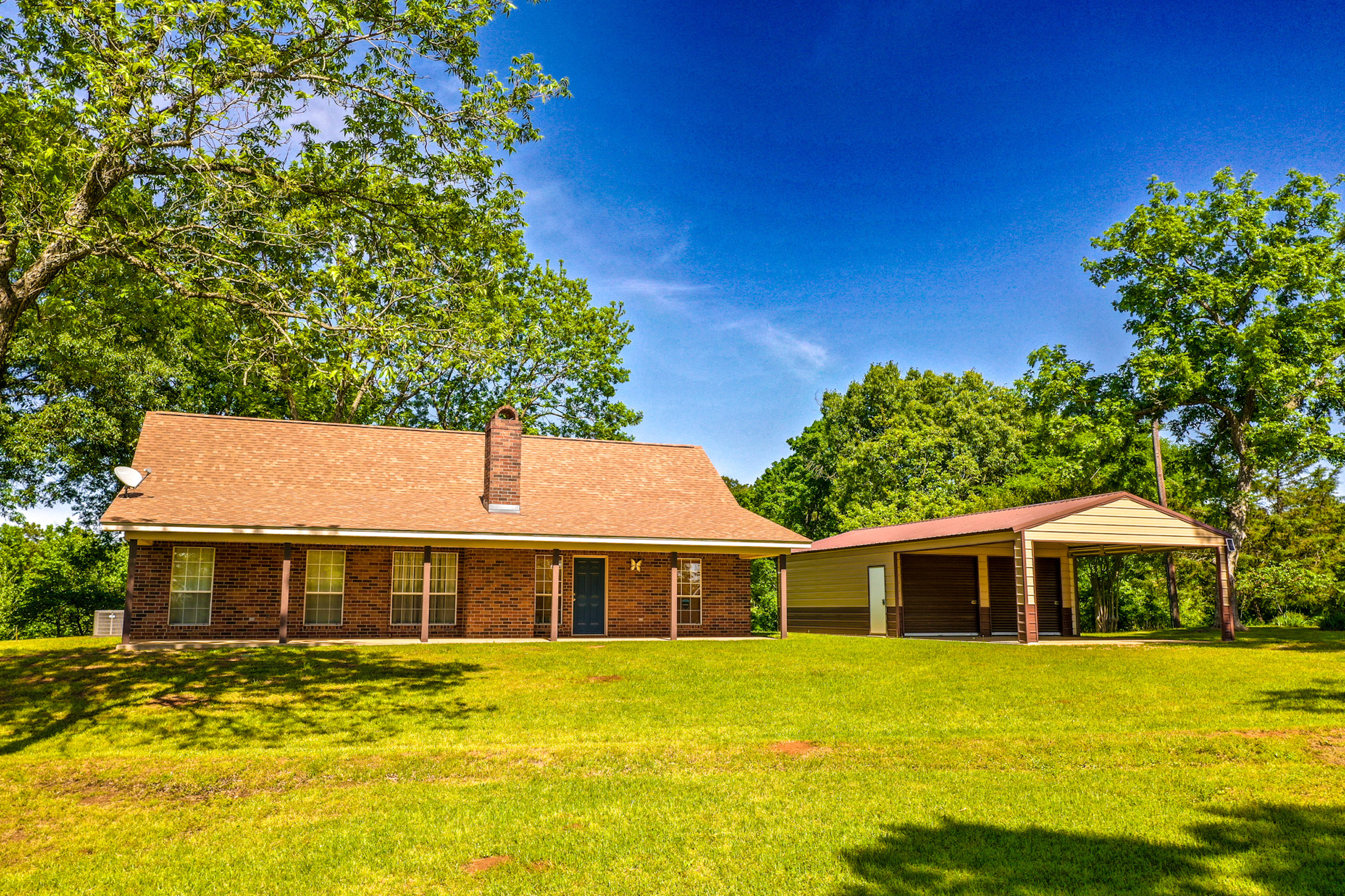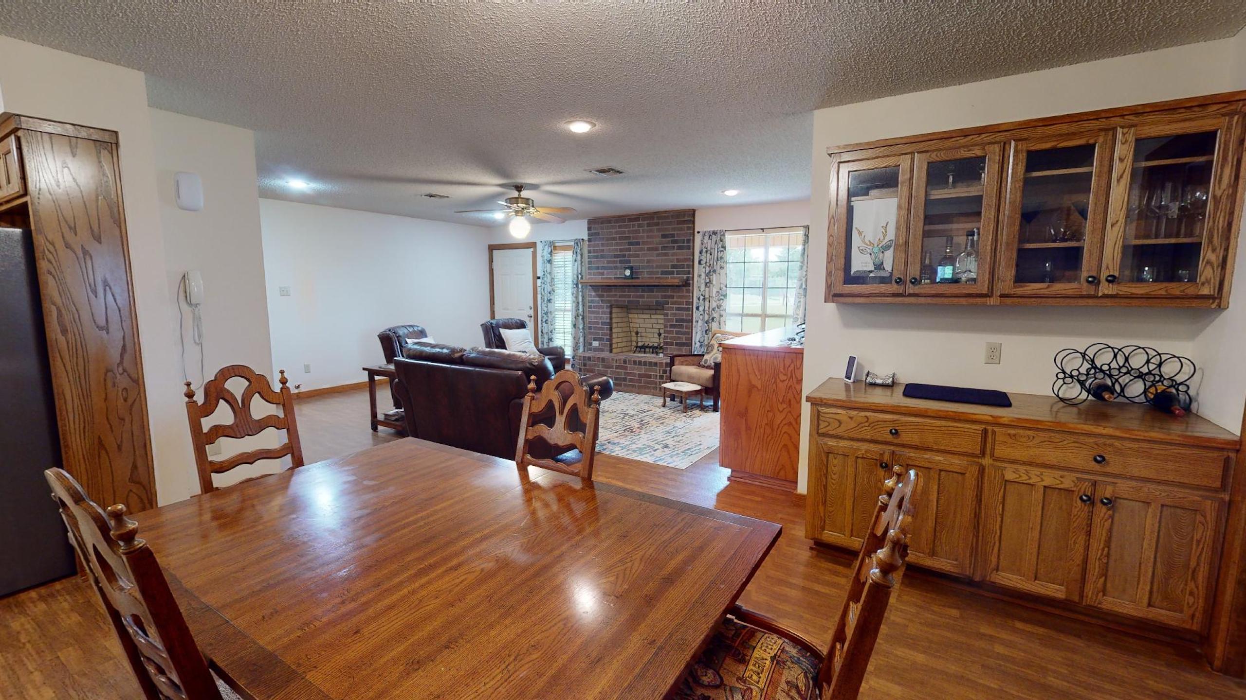 Improvements: The residence is reported by the appraisal district to have approximately 1,581 square feet of gross living area and features a very flexible and efficient design. With large front and rear covered porches, the central focus of the home is the large open living area that features a brick wood-burning fireplace, a built-in entertainment cabinet and conveniently transitions into the dining area with a custom built-in buffet / bar. Adjacent to the dining room is the large well-appointed kitchen with new appliances. Convenient backyard access is made through the laundry / mud room as well as the kitchen. The north portion of the home houses the spacious Master Suite, featuring a his and her bathroom with a double sink vanity, a separate private tub/shower and toilet area with a large adjoining walk-in closet with ample space and shelving. The three large master bedroom windows offer excellent views of your own piece of heaven. The south side of the home has two bedrooms, one on each side of the second full bath with ample linen storage. Over the previous two years, the current owner has replaced the kitchen appliances, plumbing fixtures and installed a new composition roof. The home also features a heat pump central air/heat system so there is very little to no deferred maintenance for the next owner. Located adjacent to the home is a newly constructed metal garage and carport that was constructed on a concrete slab. Other improvements include a pole barn, equipment storage building and an additional storage building with electricity and plumbing. The barn is reported to be approximately 2,160 SF with galvanized tin siding, built-in stalls and a feed room. The equipment shed is approximately 500 SF with galvanized tin roof and siding on three sides with a dirt floor. The storage building is approximately 385 SF with wood siding, a metal roof and is constructed with a wood floor on wood beams and has electricity and plumbing in place (3/4 bath). With some work, this would make a great guest house, craft workshop or office.