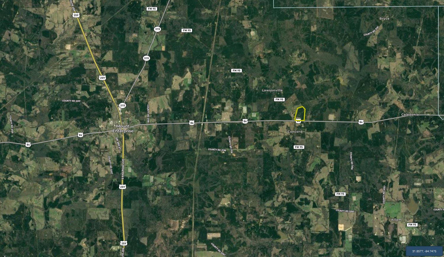 Location: Located just 5.6 miles east of the US Hwy 84 / US Hwy 259 intersection (Mt Enterprise), this property is roughly equidistant between the cities of Henderson to the North and Nacogdoches to the South. This location provides easy access to both cities and all the amenities they offer, while providing a serene escape from the hustle and bustle of city life. Coordinates to the entrance are: 31.9217; -94.5871