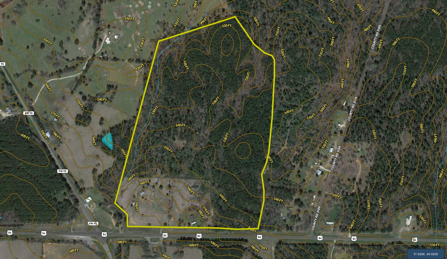 Land Characteristics: The property is slightly irregular in shape, being slightly deeper than wide. The southern portion of the property is the highest elevation and has long frontage along US Hwy 84 (over 1,400 feet). The property slopes down from the high of approximately 590’ ASL to an approximate low of 500’ ASL which is in the northernmost portions of the property. The property gently slopes from front to rear but also offers multiple draws that along with the mature stand of timber offer unique visual appeal when touring the timber portion. The topo map details a spring that runs from south to north in the western portion of the property. There are multiple areas along this stretch of the property where springs and seeps are evident. These areas would likely be suitable for the development of a pond or ponds. The southwestern portion of the property is a fenced pasture area of just over 10 acres with the remainder being mixed, mature timber. Many of the ridges throughout the property are predominantly Pine timber which has marketable value. The bulk of the draws and valleys have excellent, mature hardwood timber with a fully developed canopy that offers a relatively clean understory in most areas. Multiple trails have been cut through the wooded portions of the property and two feeders and feed pens are in place, so the property is ready to hunt. The most impressive features that must been seen to be appreciated are the dozens of mature White Oak and other mast bearing trees that deer hunters everywhere love to see.