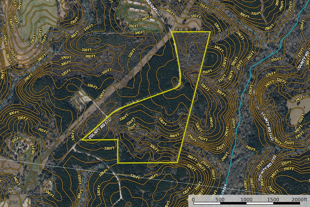 The land consists of a diverse timber profile, including approximately 15 acres of plantation pine estimated to be around 15 years old. Roughly five acres are classified as SMZ area, while the remaining acreage was harvested approximately six to eight years ago and has been allowed to naturally regenerate. This regrowth creates varied cover, edge habitat, and future management flexibility. Topography is gently to moderately rolling, with elevations ranging from an approximate low of 260 feet above sea level to a high of approximately 370 feet, offering several areas with attractive views across the property.