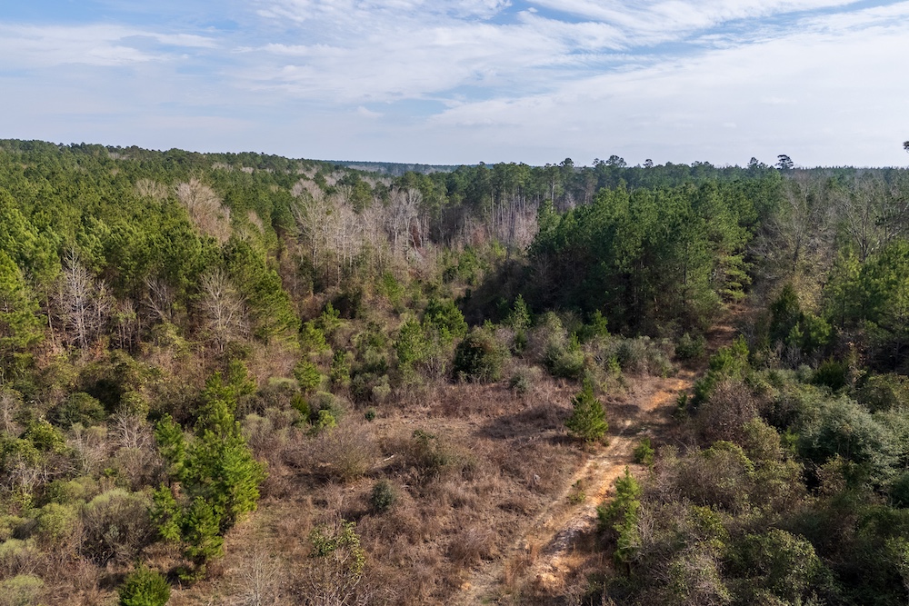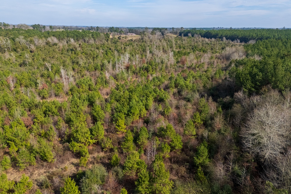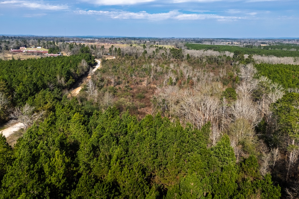 The plantation pine acreage provides a defined timber component, while the naturally regenerated areas reflect early-stage successional growth that may require cleanup or management depending on the buyer’s objectives. The property layout and terrain lend themselves well to recreational use, wildlife habitat improvement, or selective clearing for a homesite. Long county road frontage also provides flexibility for future access improvements.