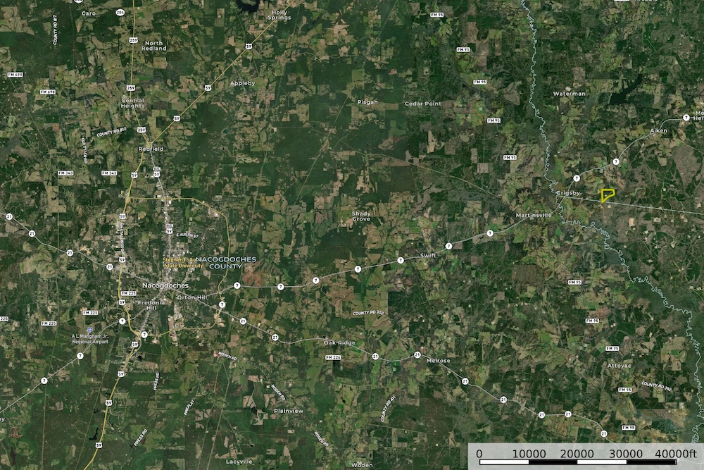The property is located at approximately 31.653, -94.365 in East Texas and lies in close proximity to the SH 7 corridor. This location offers a balance of accessibility and privacy, with convenient travel routes while remaining surrounded by rural timberland.
