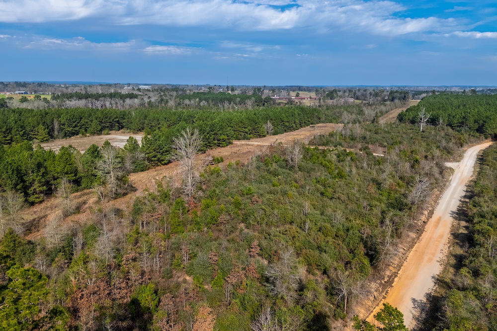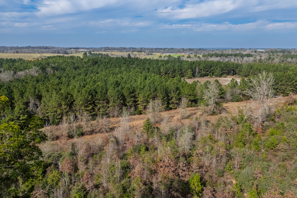 The property consists of rolling topography with usable elevation relief that enhances both drainage and views. Timber cover includes planted pine estimated to be approximately 15 years old, along with native regeneration estimated to be approximately 10 years old across portions of the tract. The property appears to be entirely upland, with no floodplain noted, and includes a small creek or natural drainage located in the northwest portion of the property.