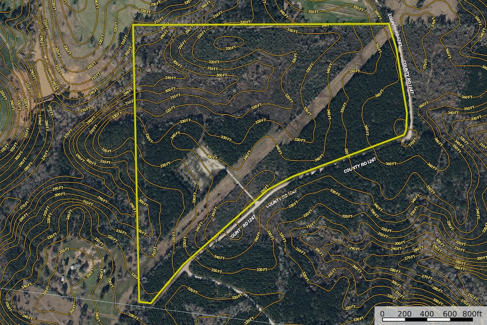 - Rolling East Texas terrain with elevations from approximately 280' to 370' ASL