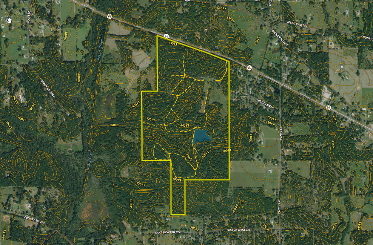 LAND: The property is reported to be 219.87 acres which is irregular in shape and has long frontage along SH 64. It has good rolling topography with no flood zone and elevations ranging from an approximate low of 400’ ASL to an approximate high of 530’ ASL. The tract is almost entirely wooded with a mixture of native stands of mixed hardwoods and some planted pine timber in the extreme southern portion of the property. It has a small pond that is centrally located in the property. The topography appears to be suitable for the possibility of enlarging this pond and creating a more significant water feature. Overall, this tract offers many desirable features that are hard to find in such close proximity to Tyler.