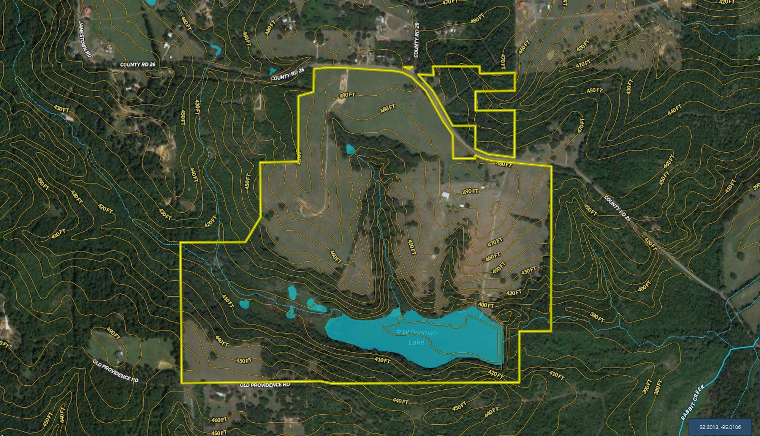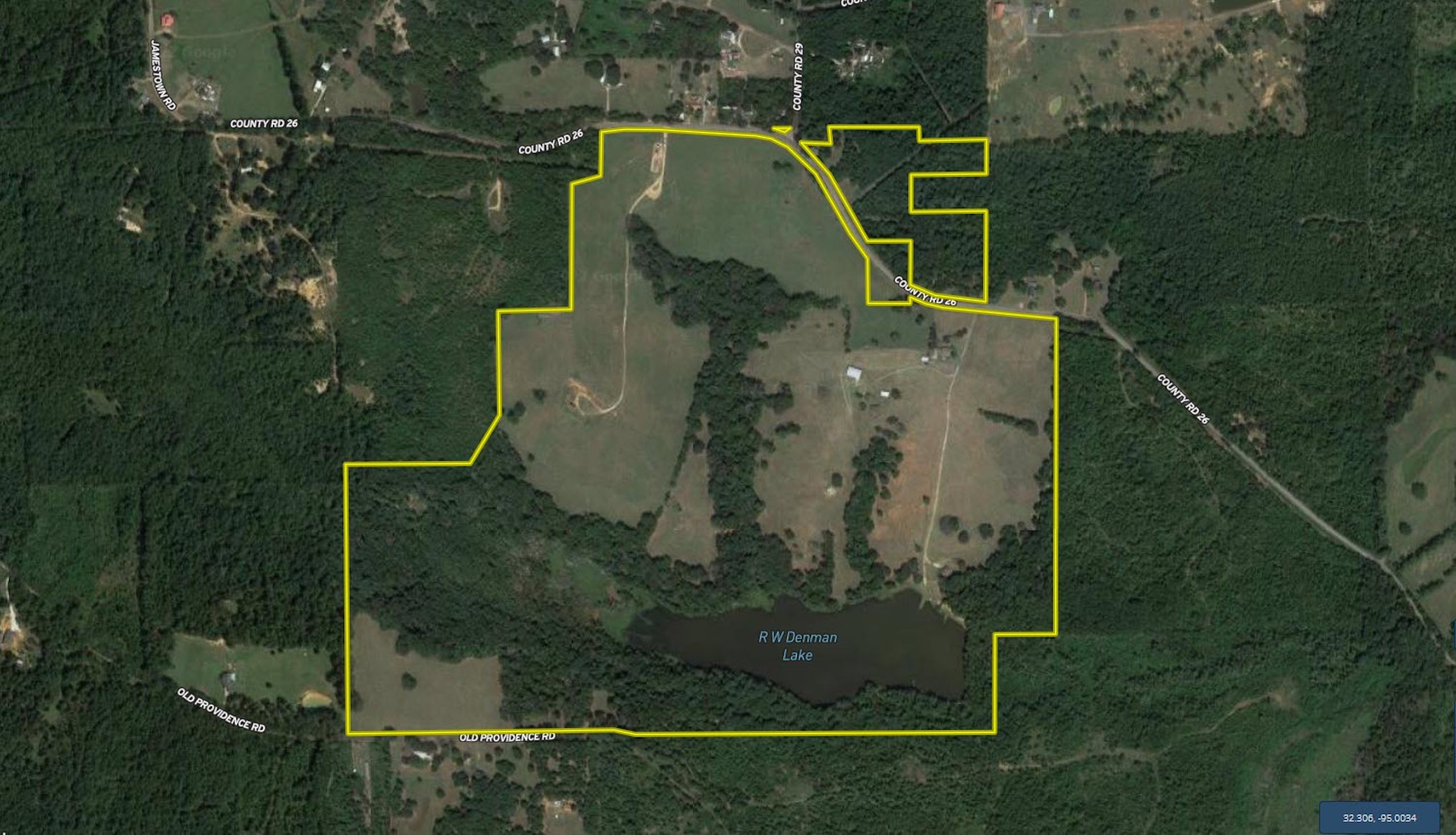 Location: The property is located approximately 25 minutes east of Tyler with frontage along CR 26 and Old Providence. Coordinates to the front gate along CR 26 are: 32.3091; -95.0045