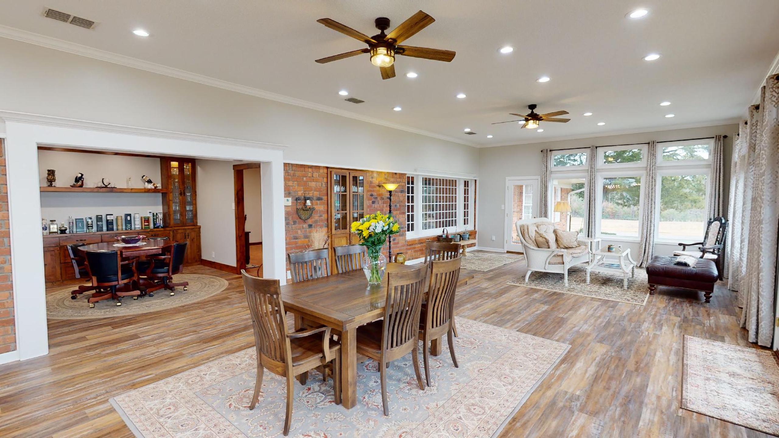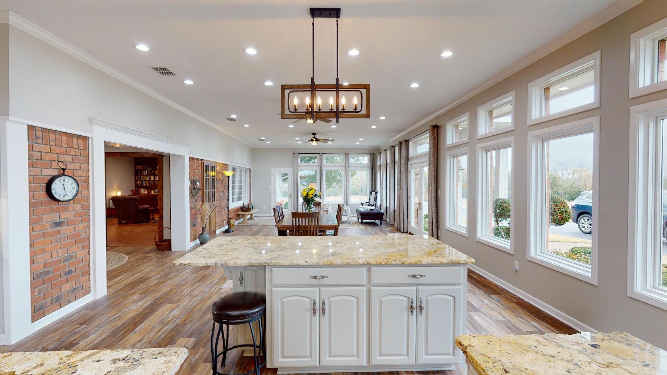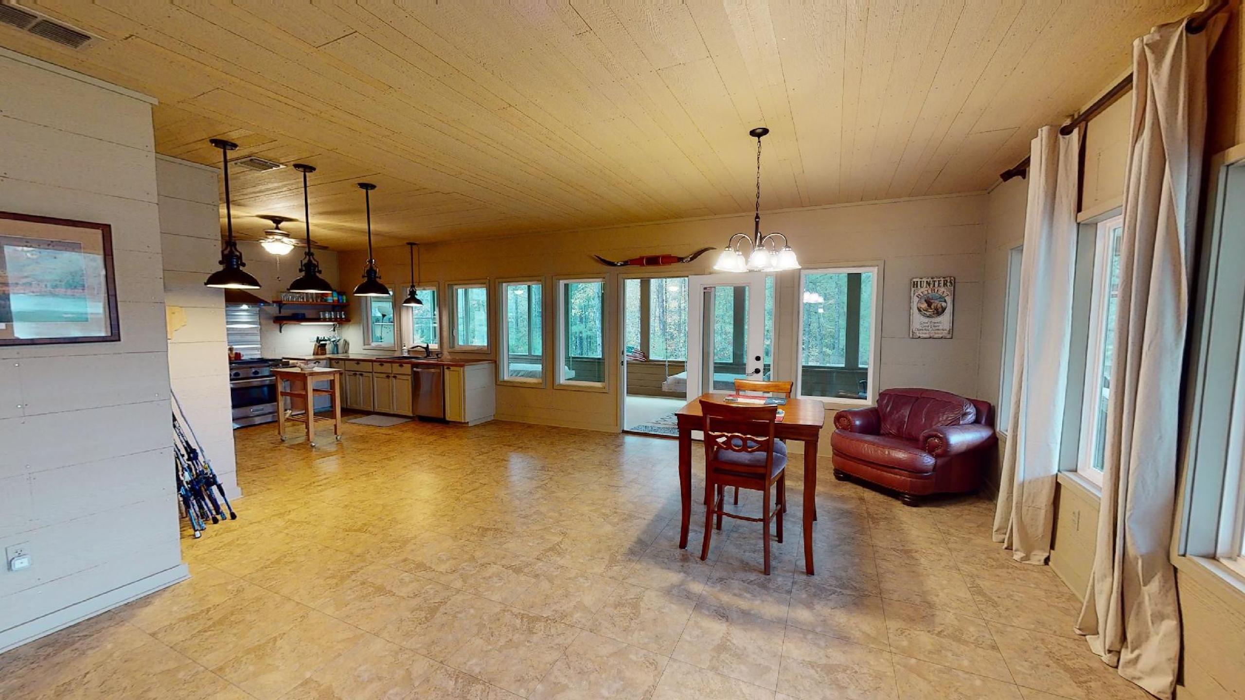 - Large open-concept kitchen / dining area with a wall of windows for natural light and terrific views of the property