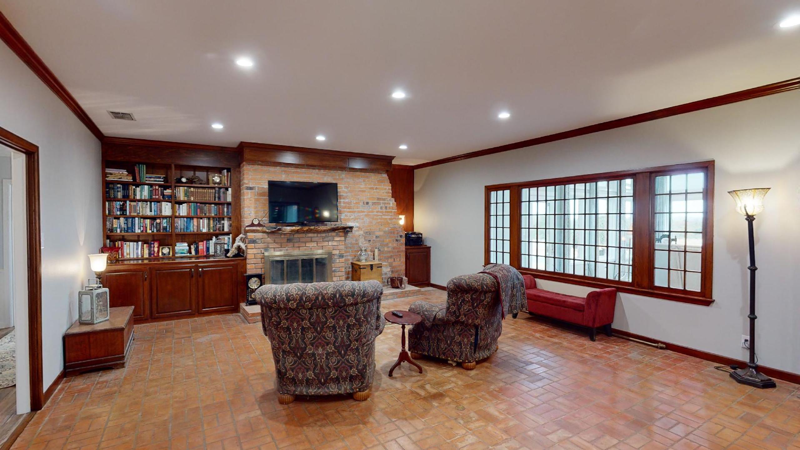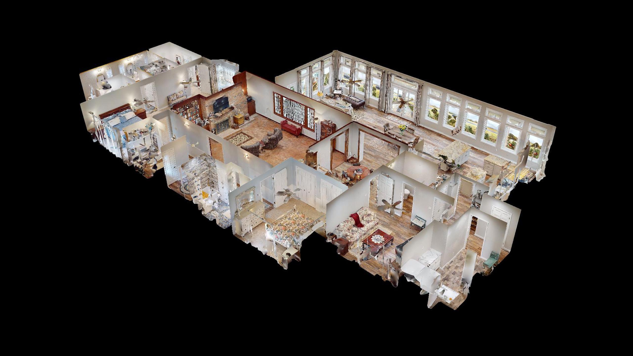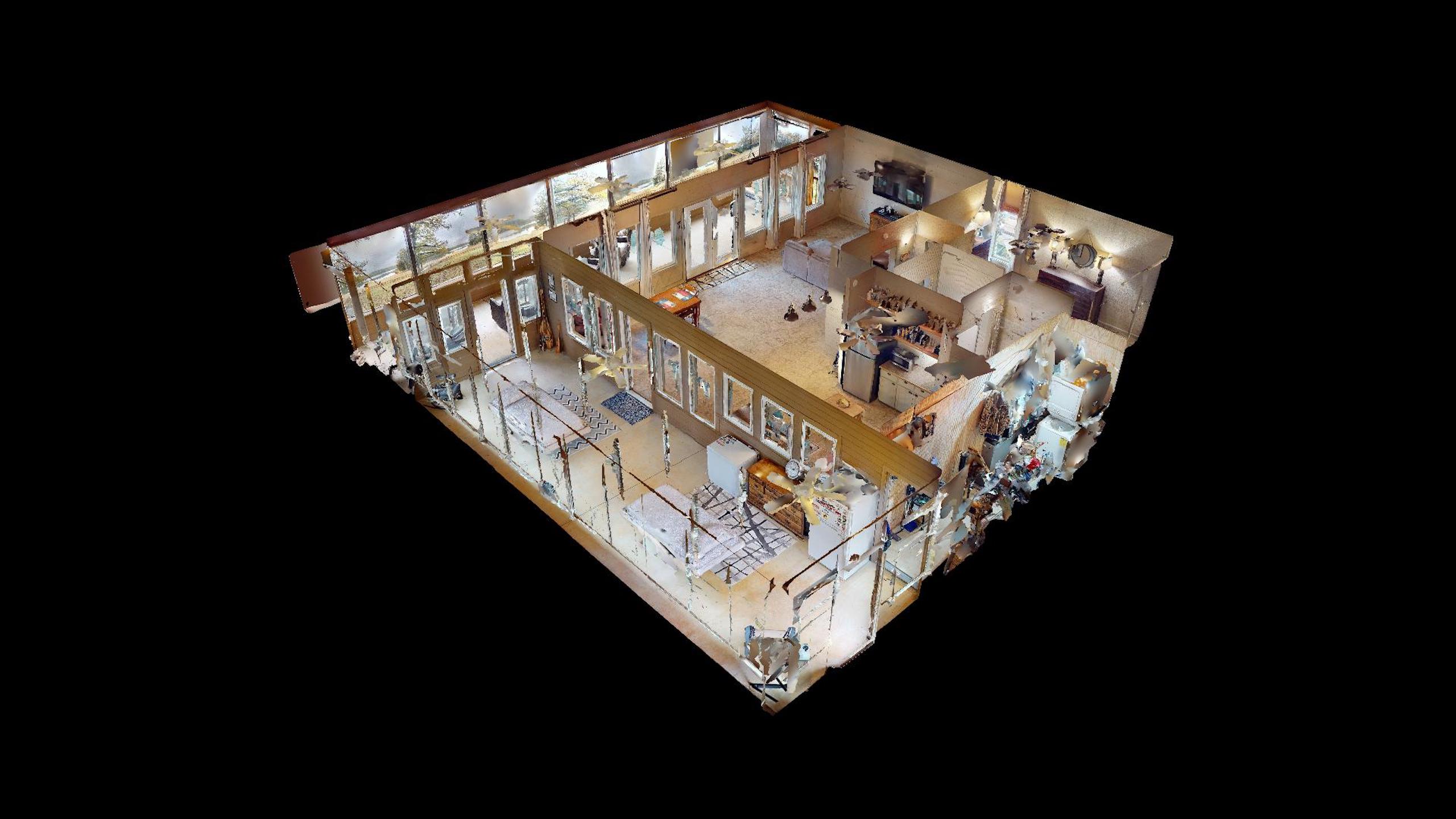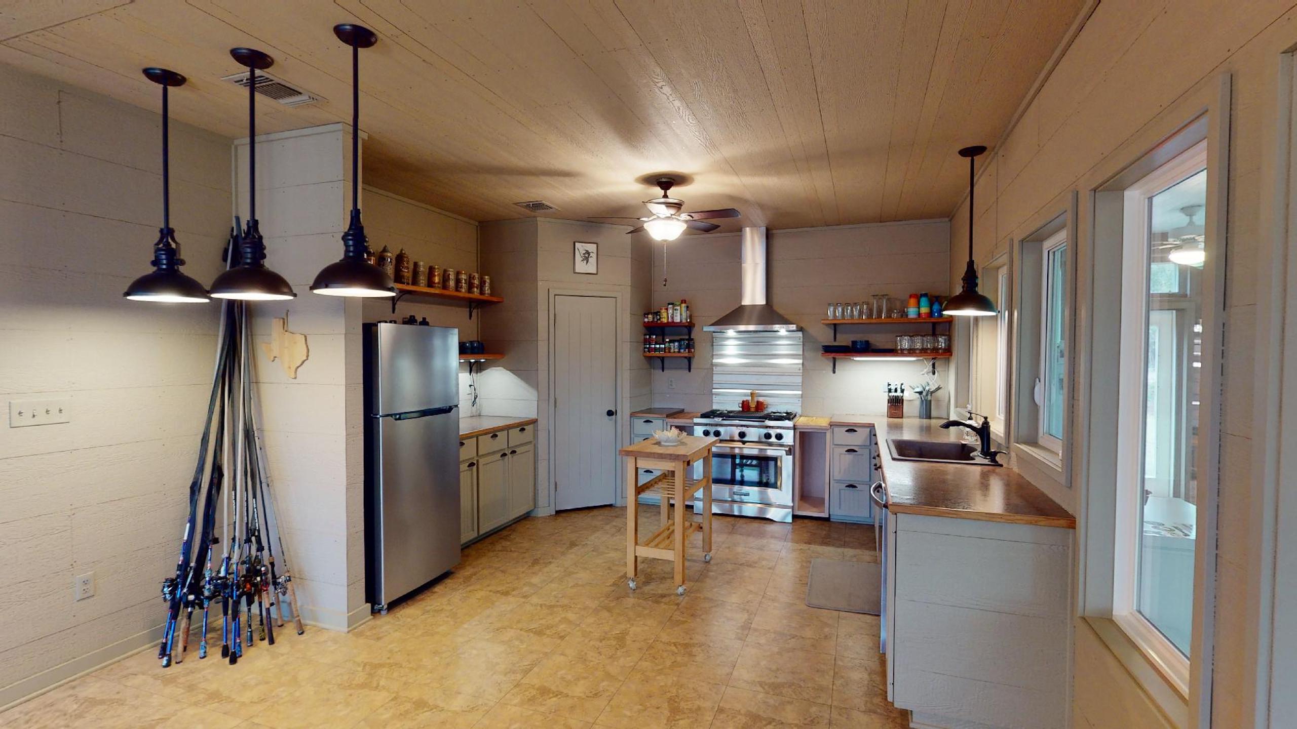 - Large open-concept kitchen / dining area with a wall of windows for natural light and terrific views of the property