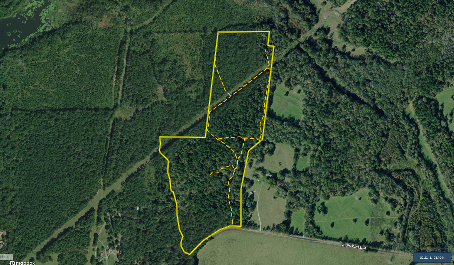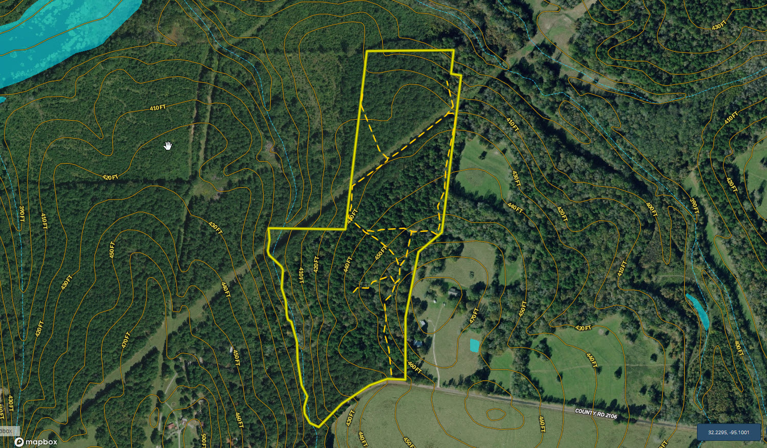 Elevation on the property ranges from an approximate low of 390' ASL to an approximate high of 470' ASL. This gentle roll offers a unique combination of pleasing aesthetics and provides multiple areas with relatively flat topography that could quickly be developed. The property has frontage along CR 2106 on the south and borders City of Tyler land to the north associated with Lake Tyler East. This unique proximity offers recreational appeal as wildlife has a protected bedding area just across the fence.