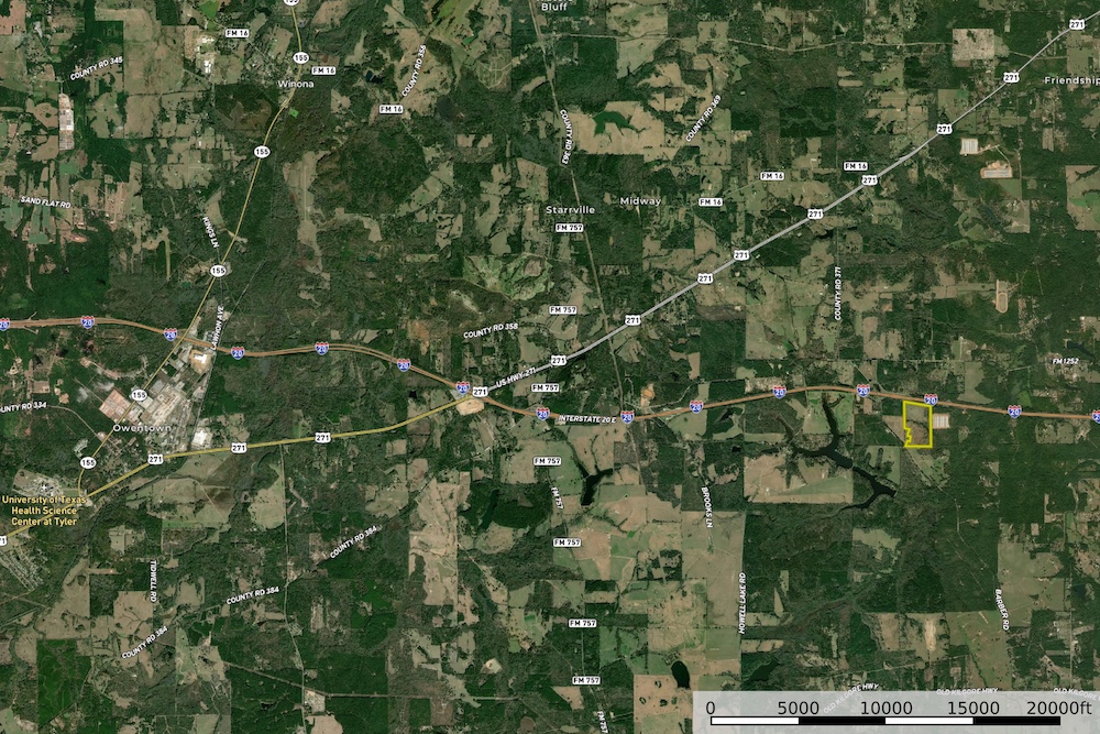 Situated along the south side of Interstate 20 in northeast Smith County, the property offers excellent access to nearby towns and essential services. The proximity to the interstate provides quick connectivity across the region while still offering a rural setting with privacy and space.