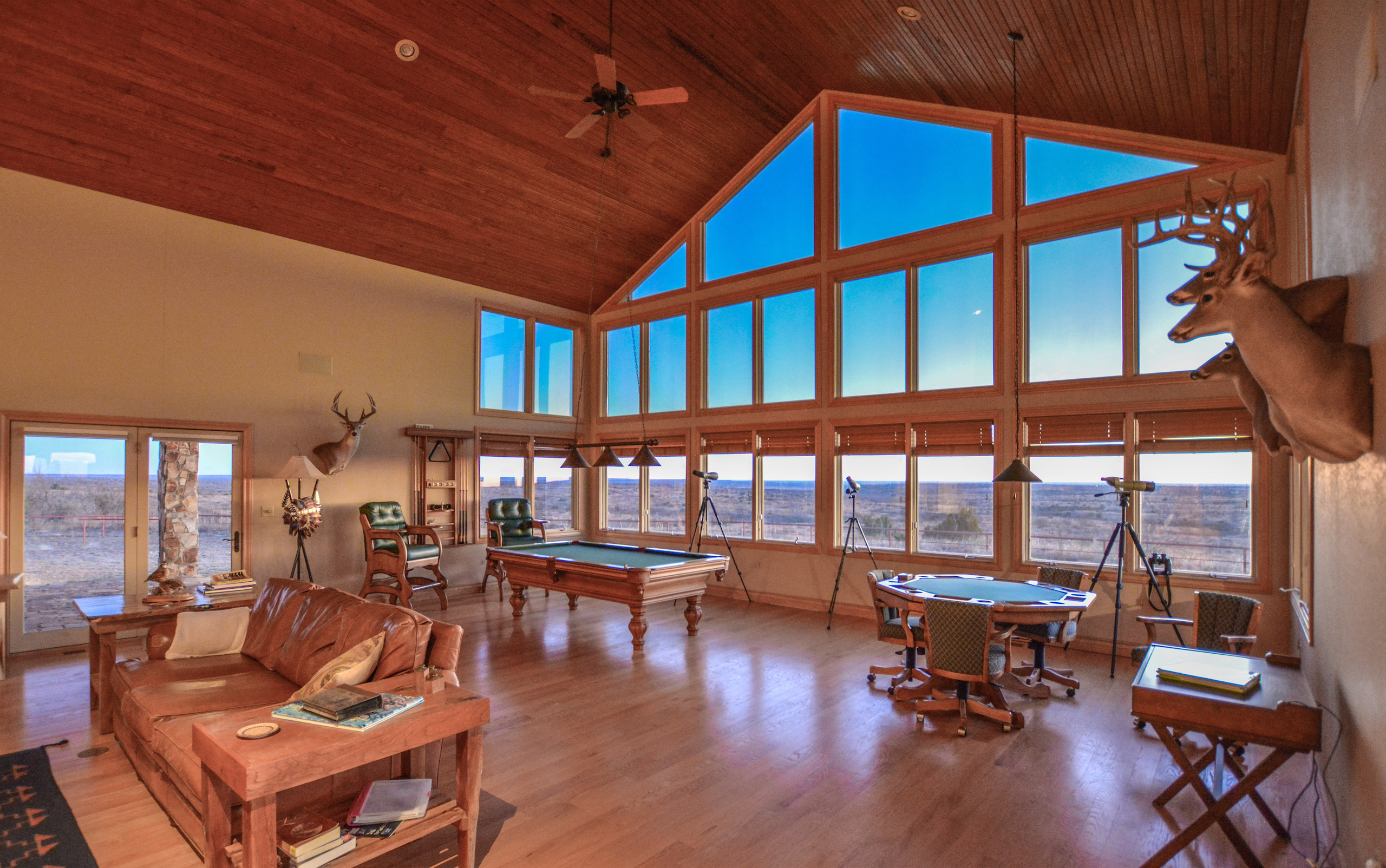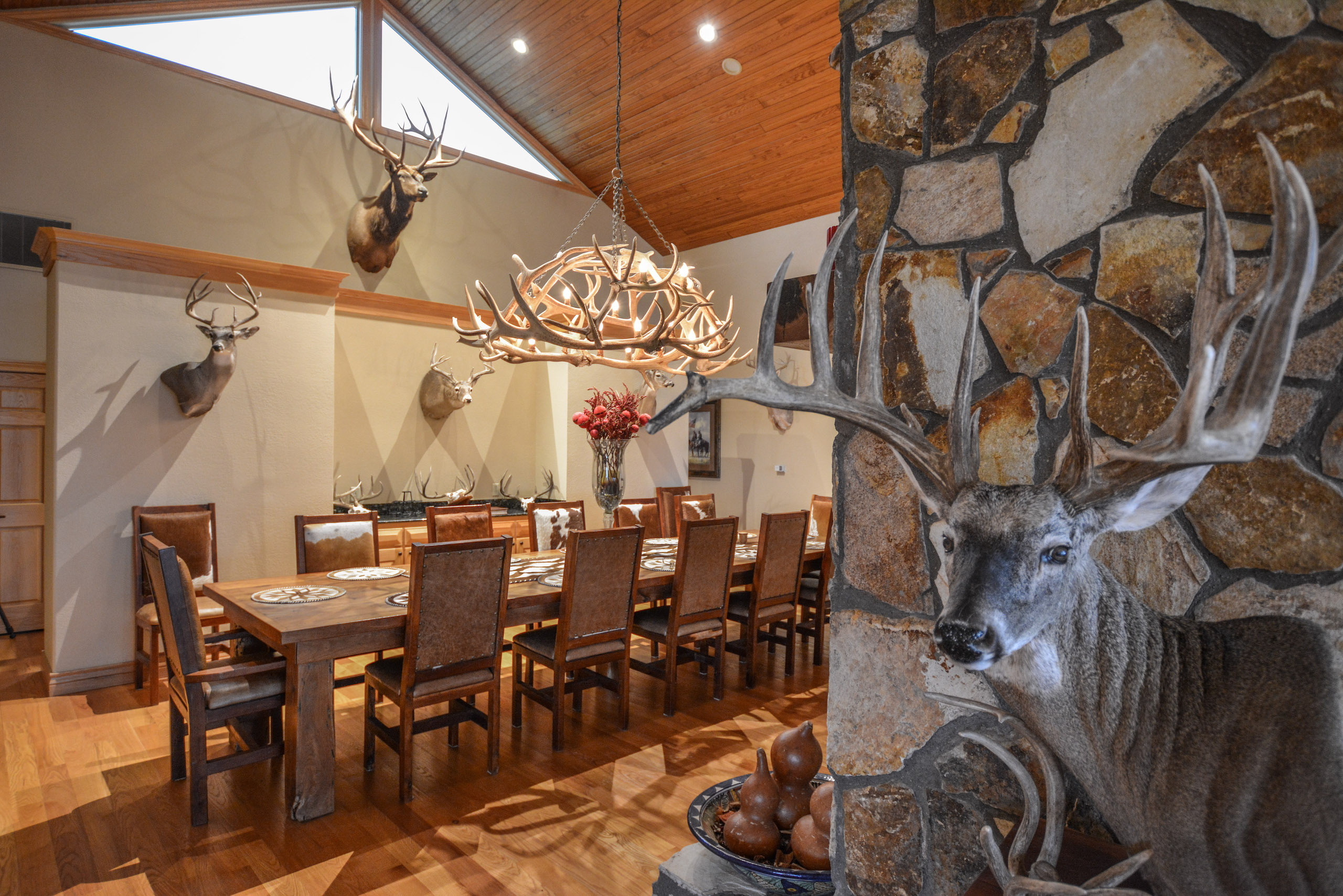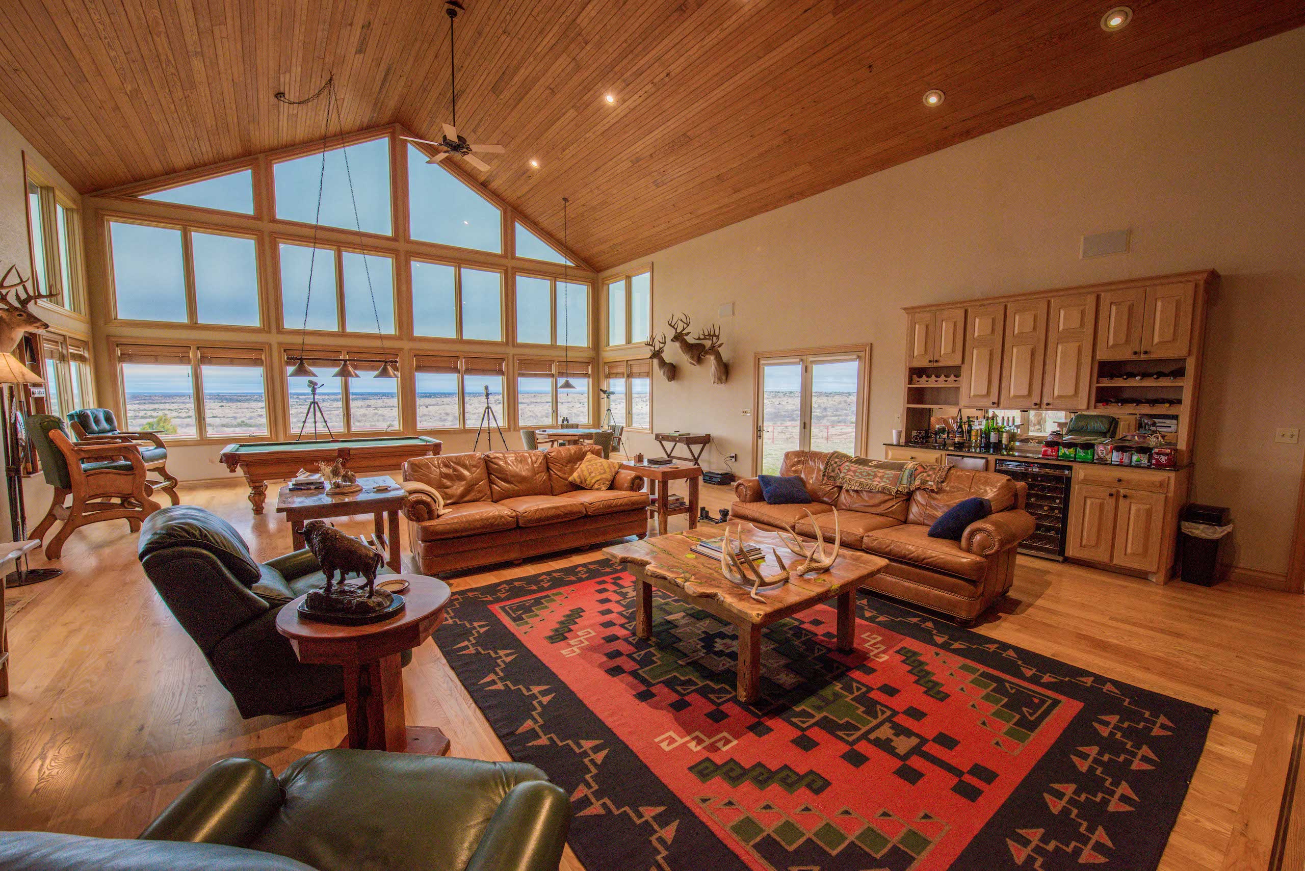 Improvements: The Caloosa Ranch boasts a distinguished 5 bedroom, 5.5 bathroom main lodge built on a prominent high point of the ranch, featuring 4,768 square feet of living space with luxurious accommodations and plentiful space for entertaining. The lodge features spacious common areas and living space, gun room, formal dining, covered porches, and four spacious guest bedrooms and a master suite, each with their own full bathroom with walk-in showers. The interior of the lodge is highlighted with custom mesquite furniture, stained concrete floors, a towering double-sided stone fireplace, vaulted wood ceilings, and absolutely magnificent panoramic views of the ranch through the grand eastern facing windows. The fully-furnished lodge is the perfect accompaniment to the ranch and is ready for immediate enjoyment. The ranch is also complemented by a 2,950 square foot ranch manager’s house, a 21’x30’ game cleaning barn with walk-in cooler and two 45x70 steel Quonset hut barns on concrete slabs.