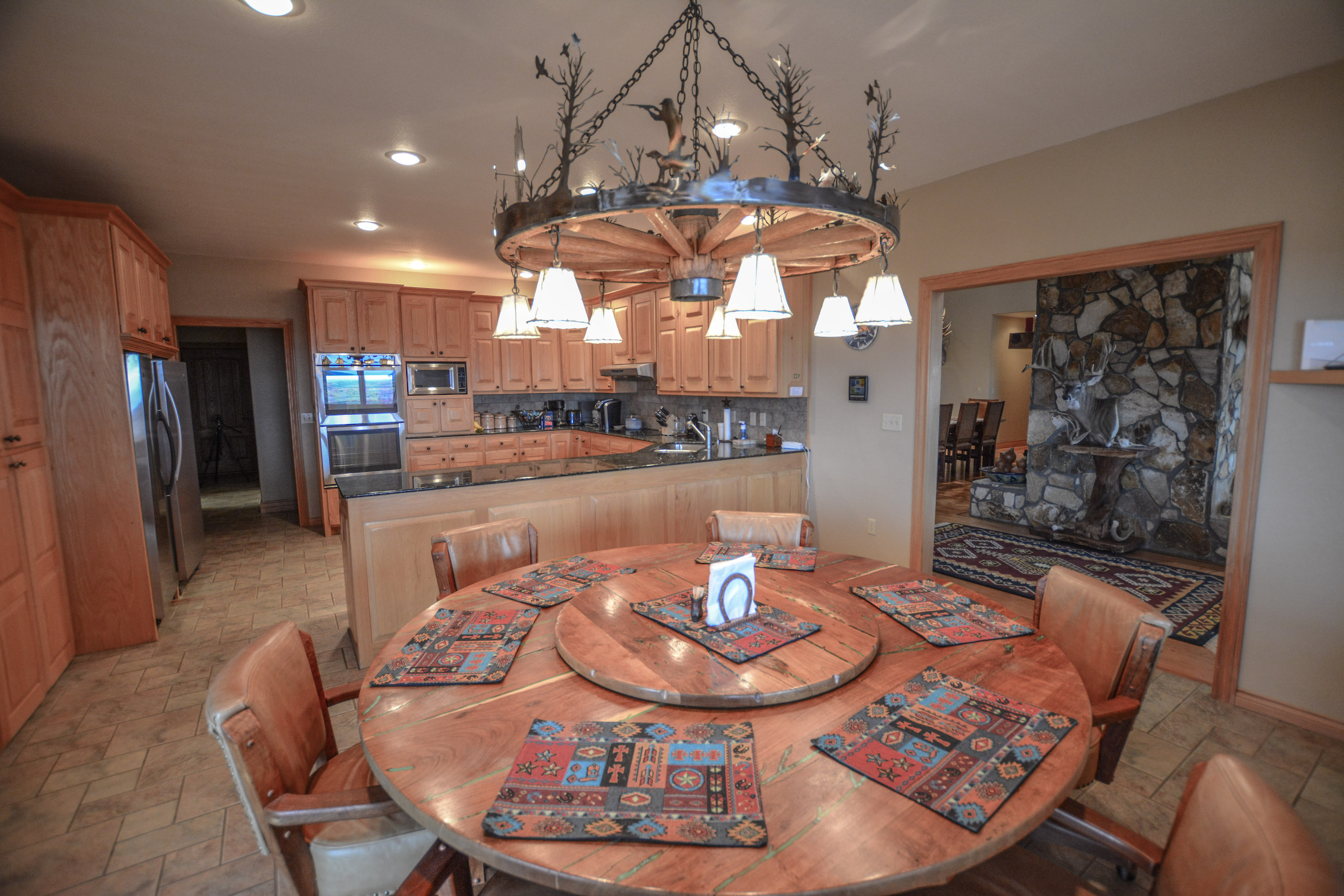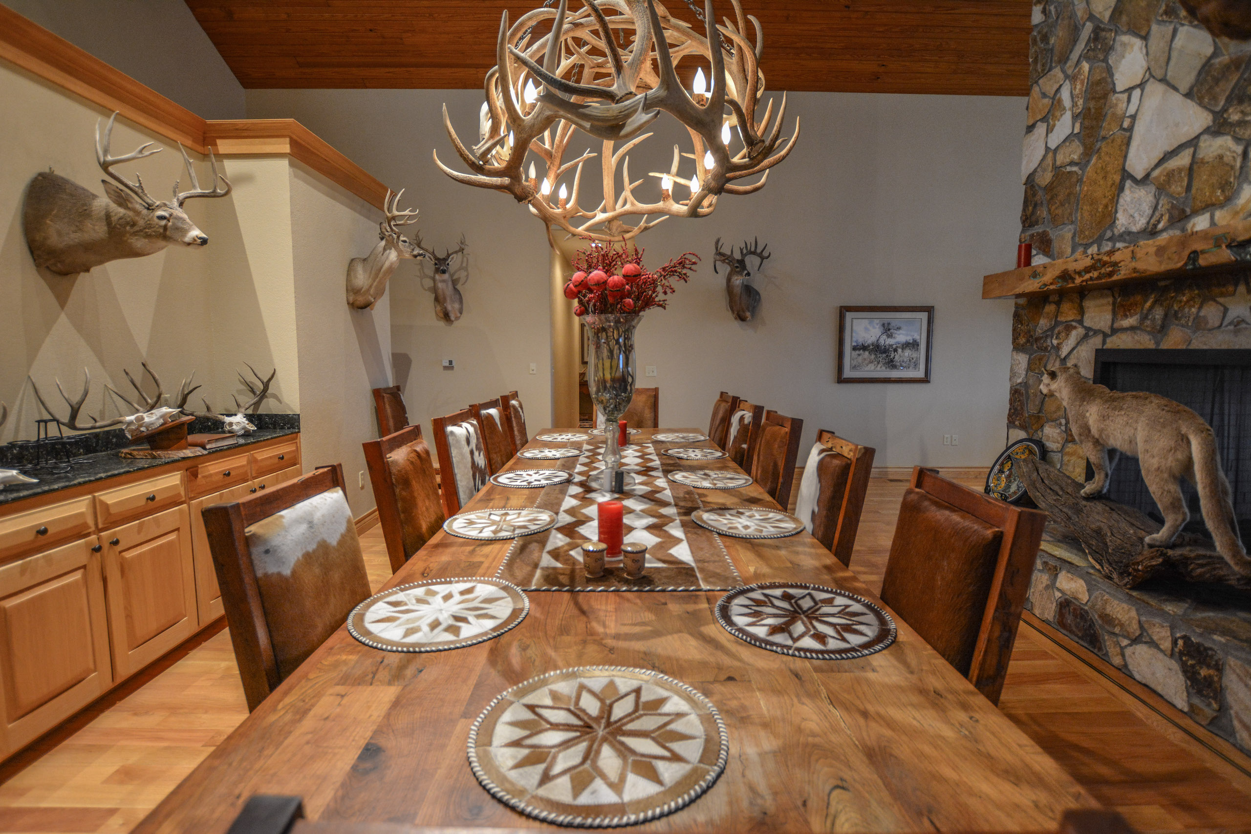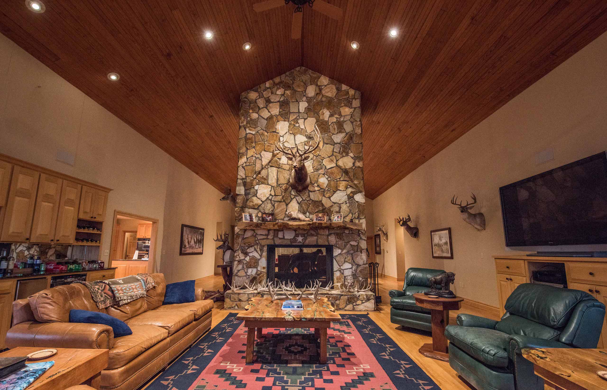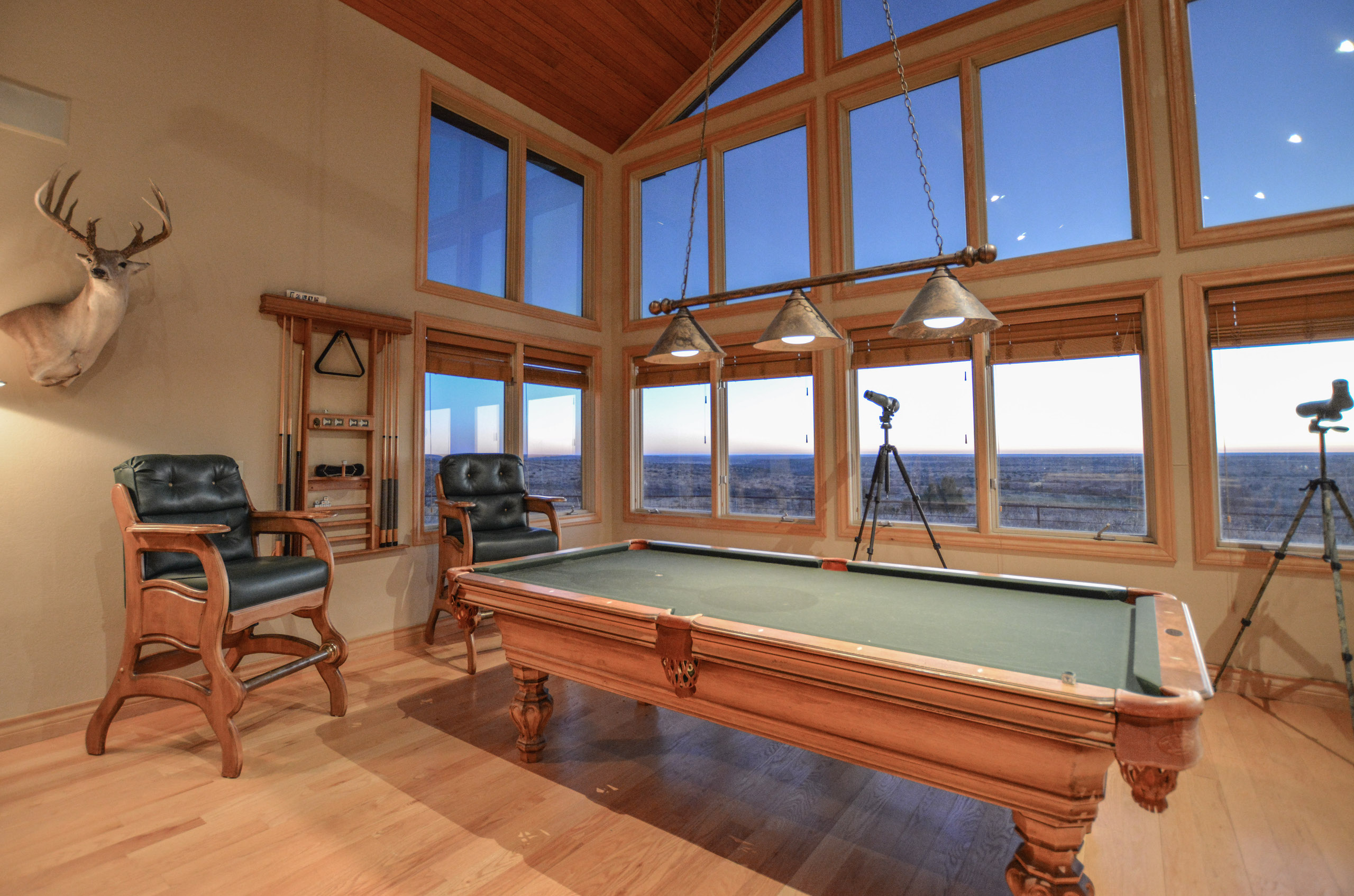 Improvements: The Caloosa Ranch boasts a distinguished 5 bedroom, 5.5 bathroom main lodge built on a prominent high point of the ranch, featuring 4,768 square feet of living space with luxurious accommodations and plentiful space for entertaining. The lodge features spacious common areas and living space, gun room, formal dining, covered porches, and four spacious guest bedrooms and a master suite, each with their own full bathroom with walk-in showers. The interior of the lodge is highlighted with custom mesquite furniture, stained concrete floors, a towering double-sided stone fireplace, vaulted wood ceilings, and absolutely magnificent panoramic views of the ranch through the grand eastern facing windows. The fully-furnished lodge is the perfect accompaniment to the ranch and is ready for immediate enjoyment. The ranch is also complemented by a 2,950 square foot ranch manager’s house, a 21’x30’ game cleaning barn with walk-in cooler and two 45x70 steel Quonset hut barns on concrete slabs.