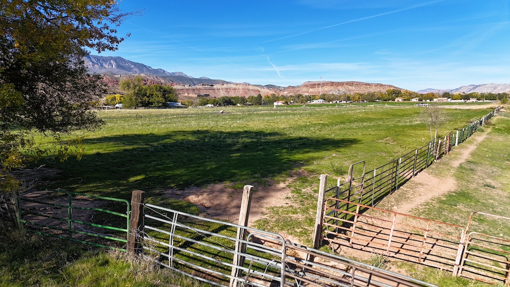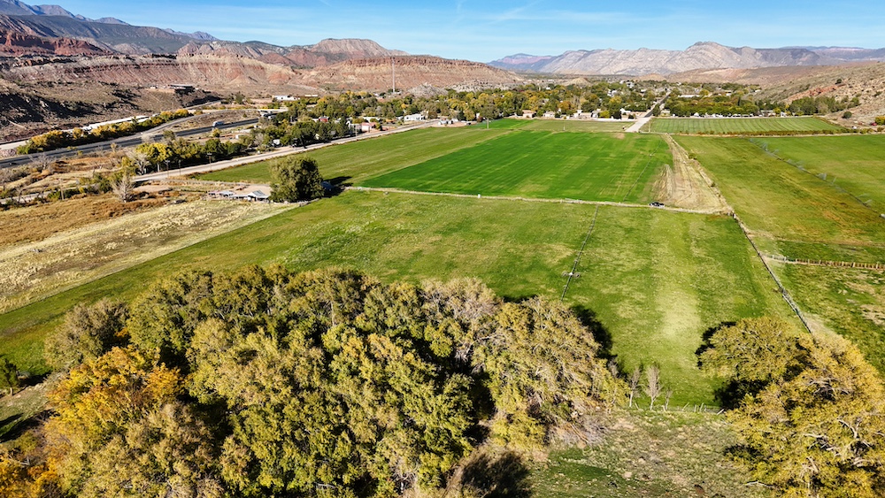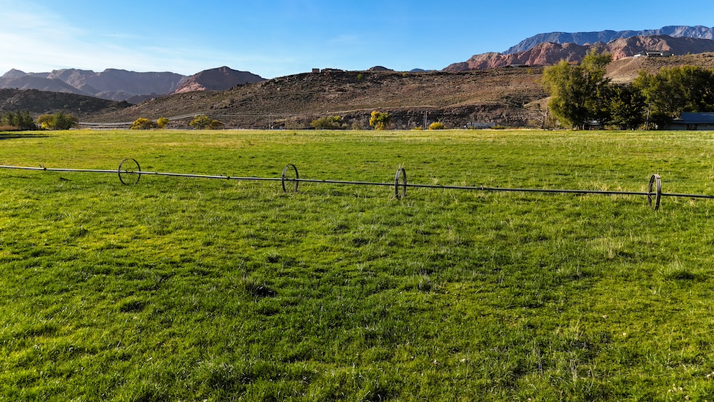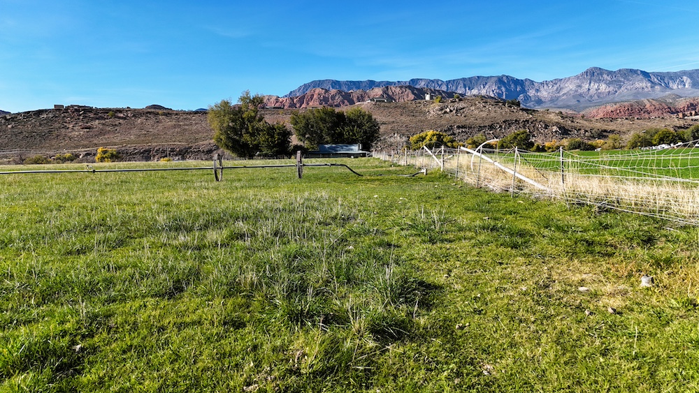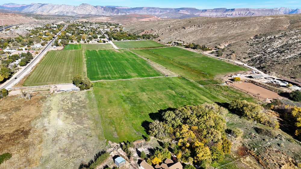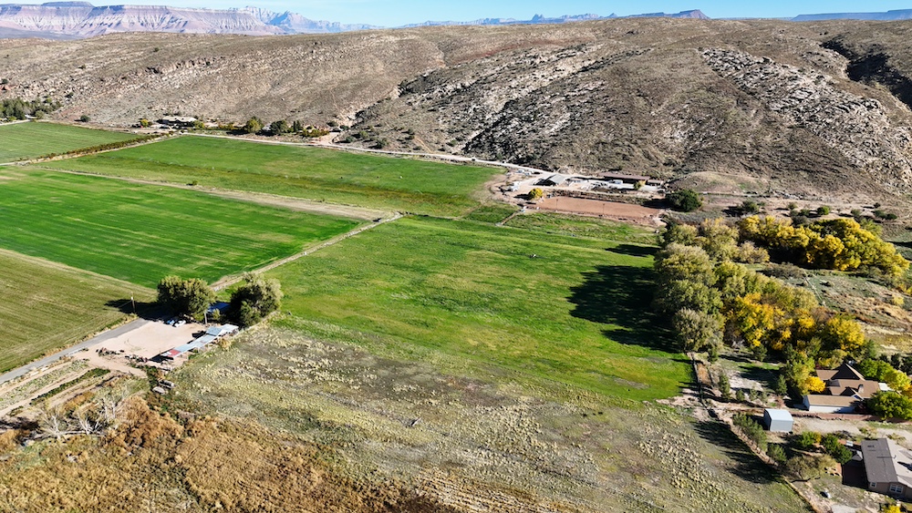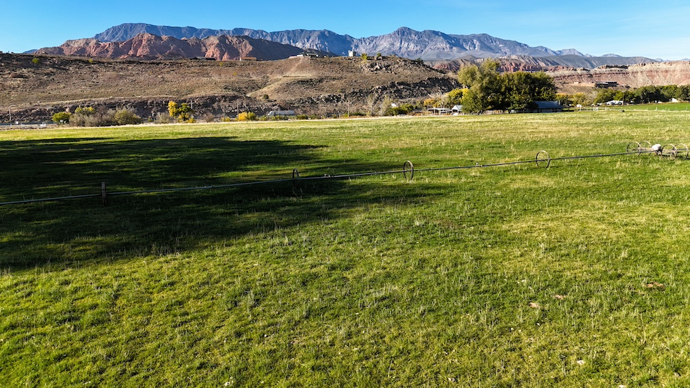 The terrain is primarily level, which may reduce grading needs depending on the intended use. Views from the property include surrounding red rock formations and open skies typical of southwest Utah. The soil quality reflects its agricultural past and may support continued farming, hobby agriculture, or landscaped residential uses where permitted.