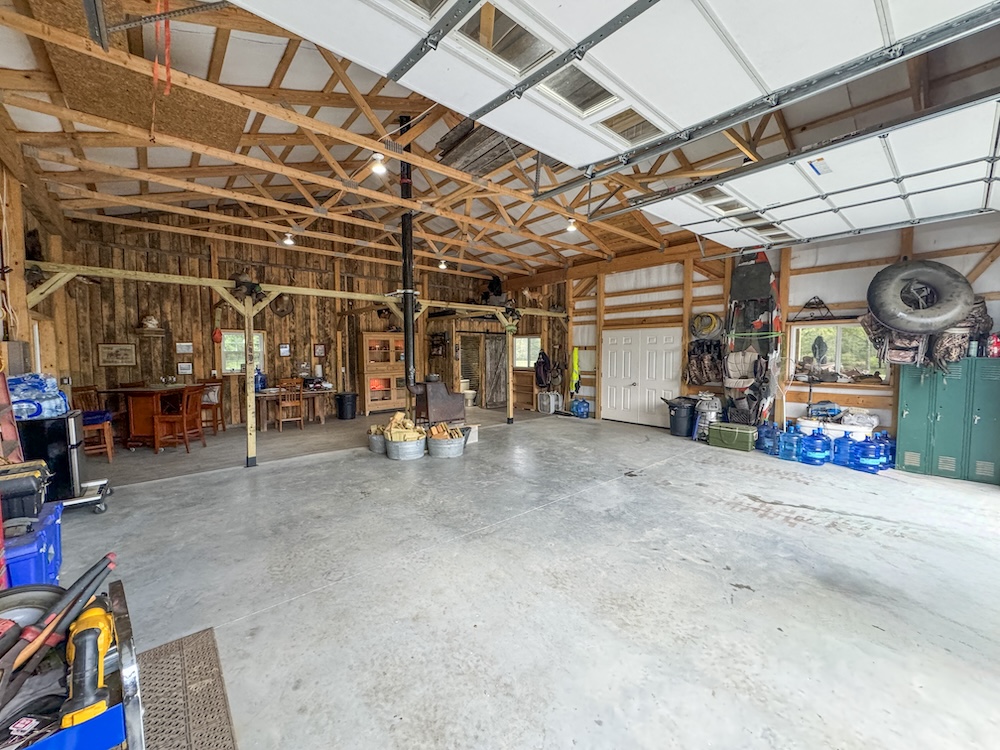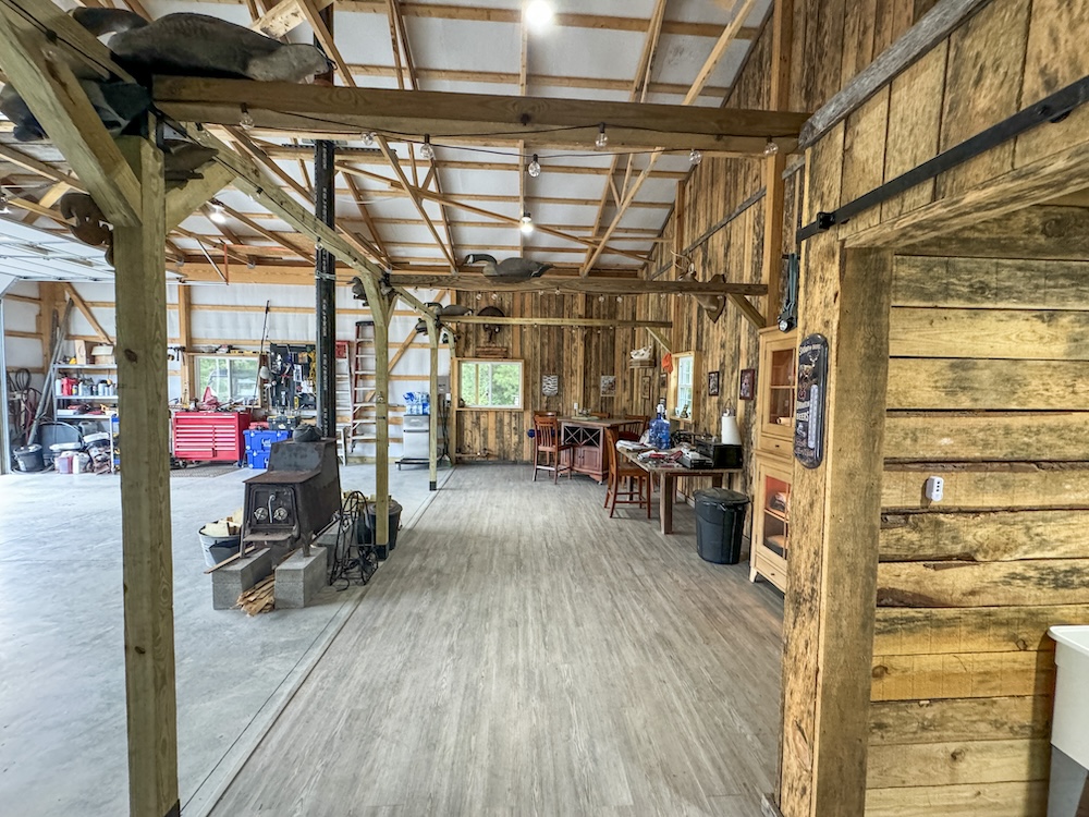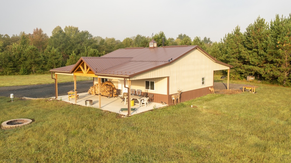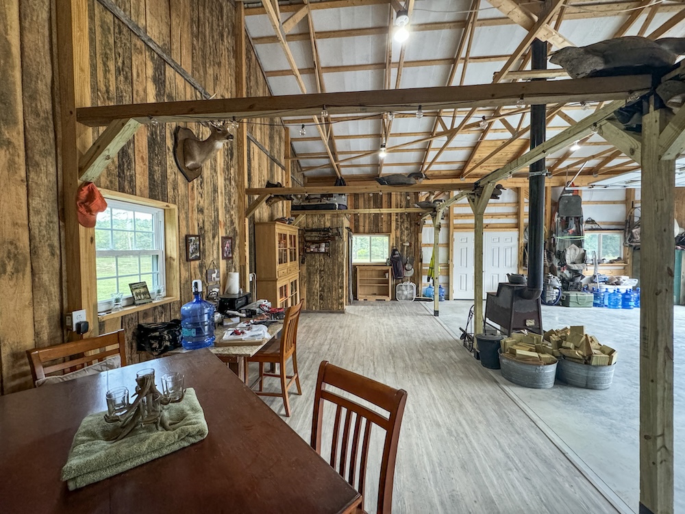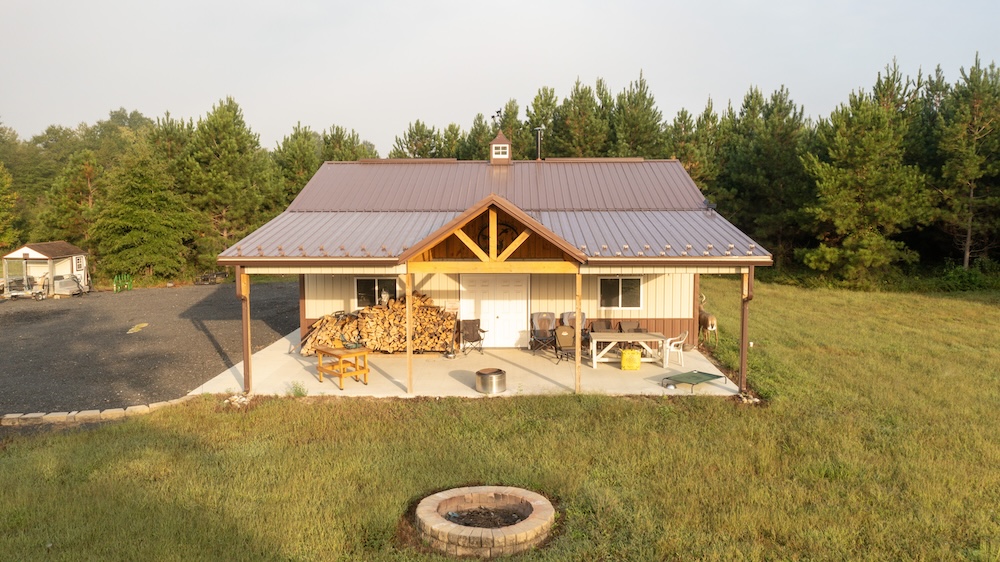 - Newly built 30 x 36 Amish post and beam lodge (2023), solar-powered, with front porch and covered lean-to