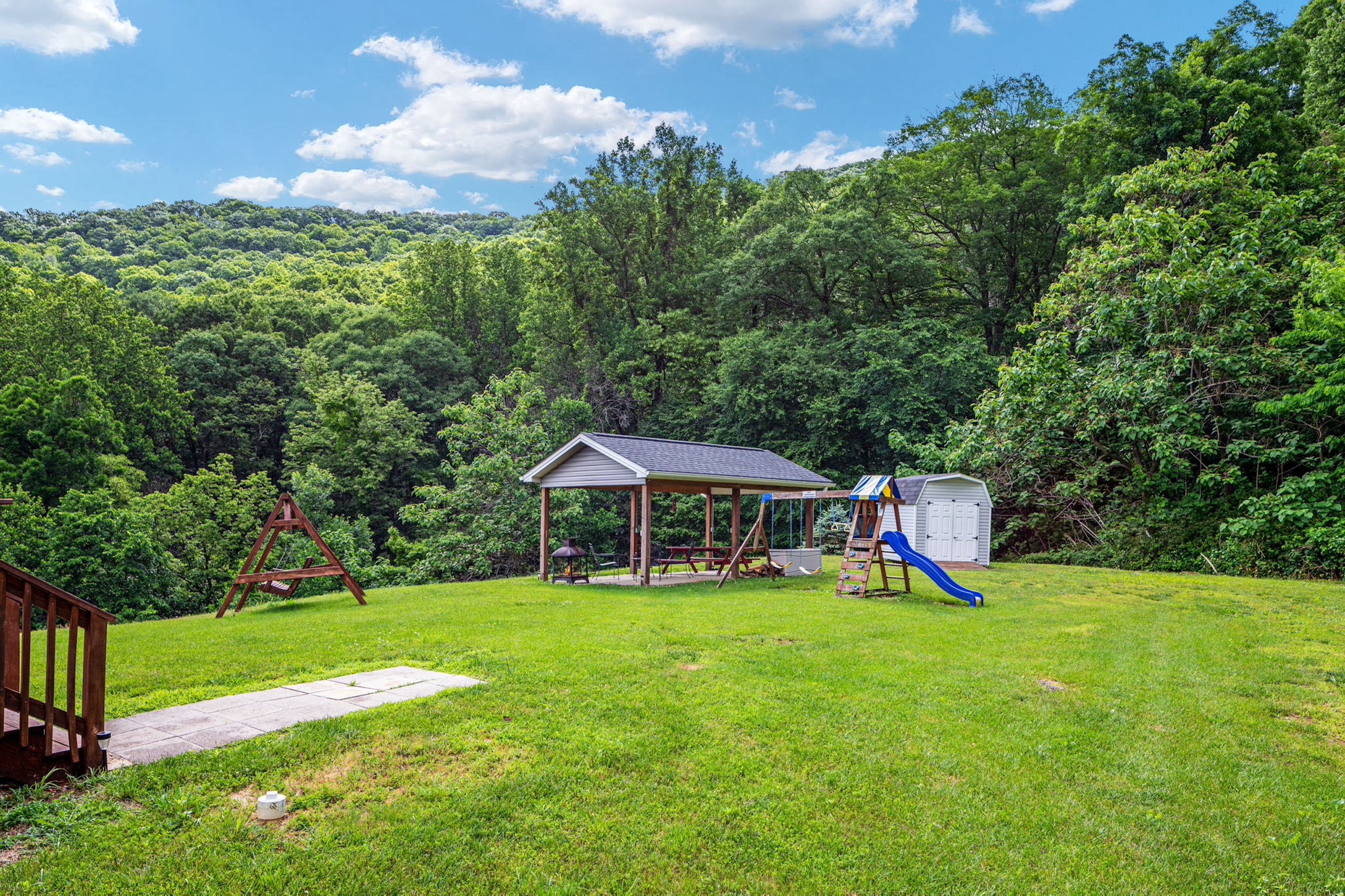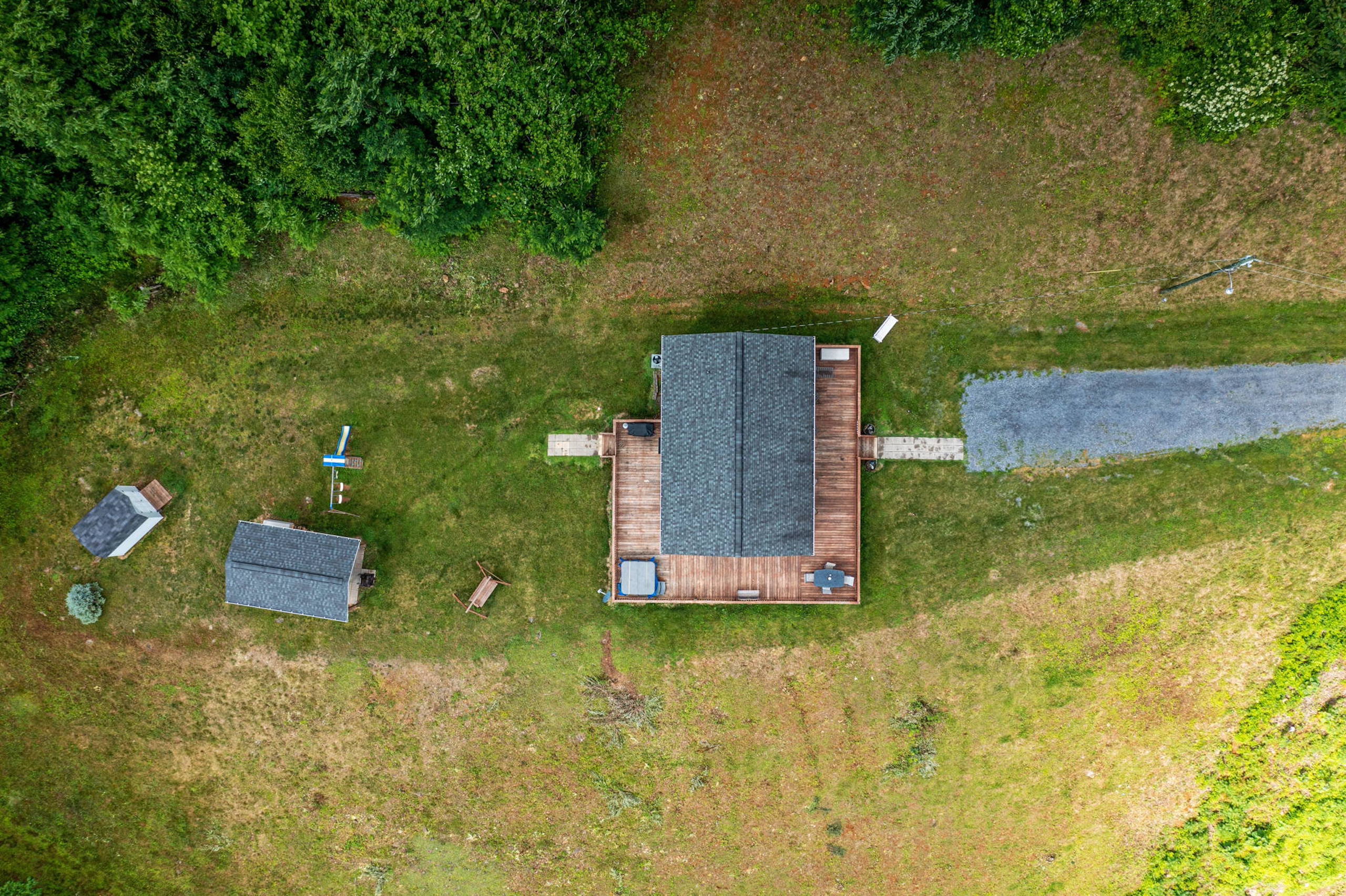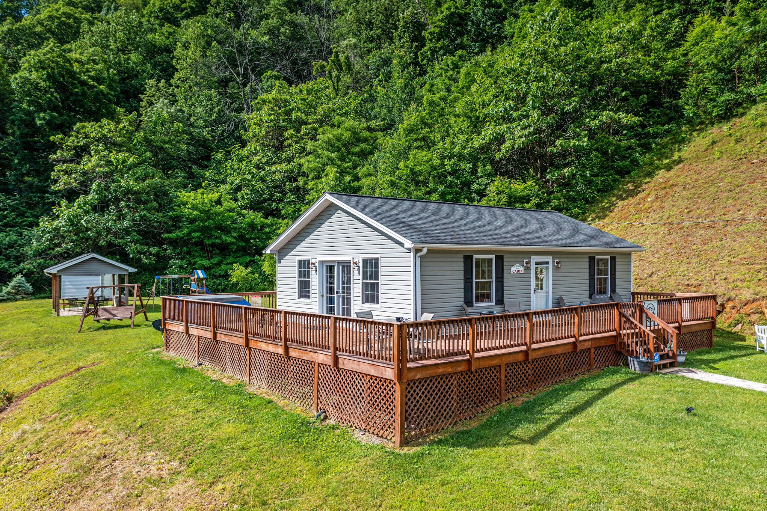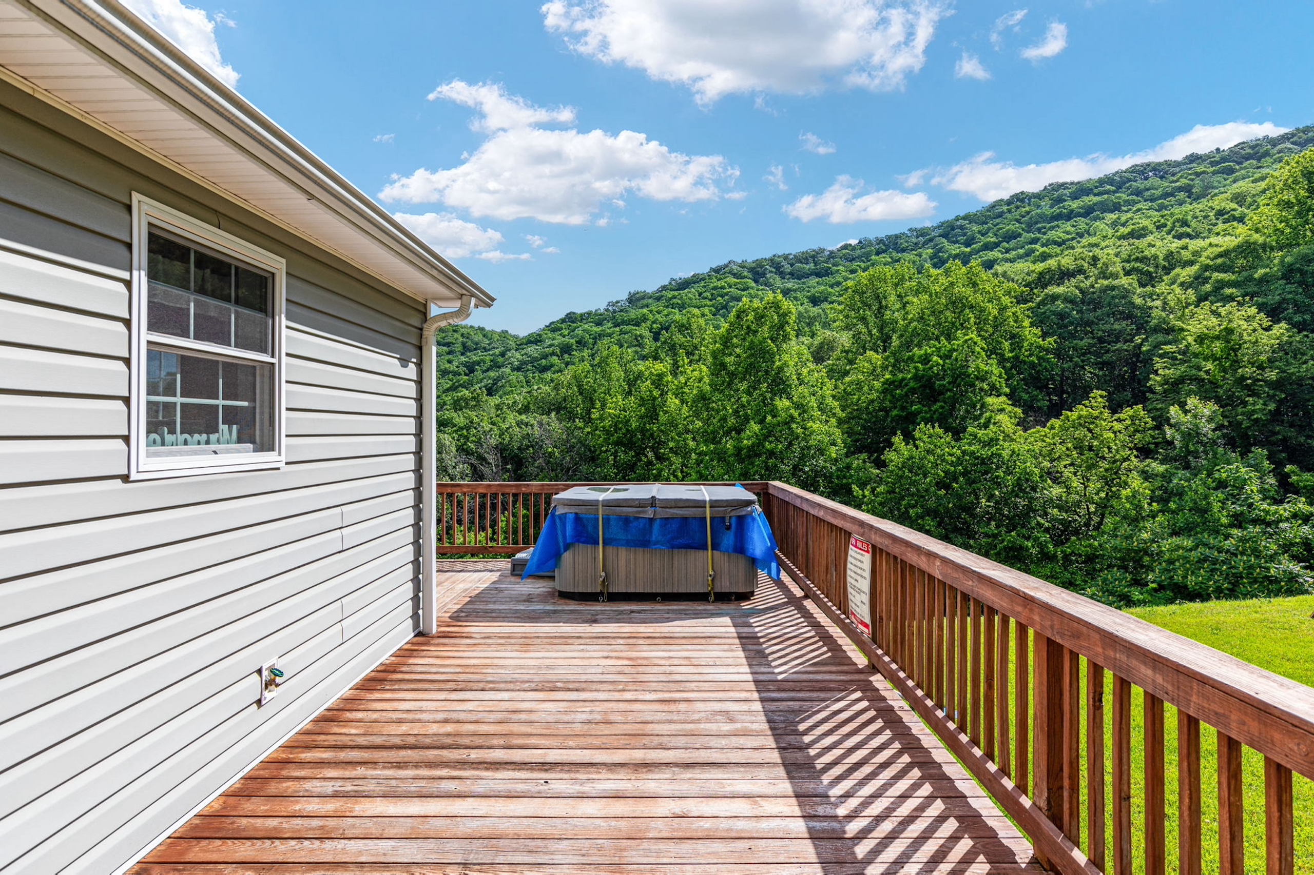 - Wrap-around deck, picnic shelter, storage shed, and hot tub