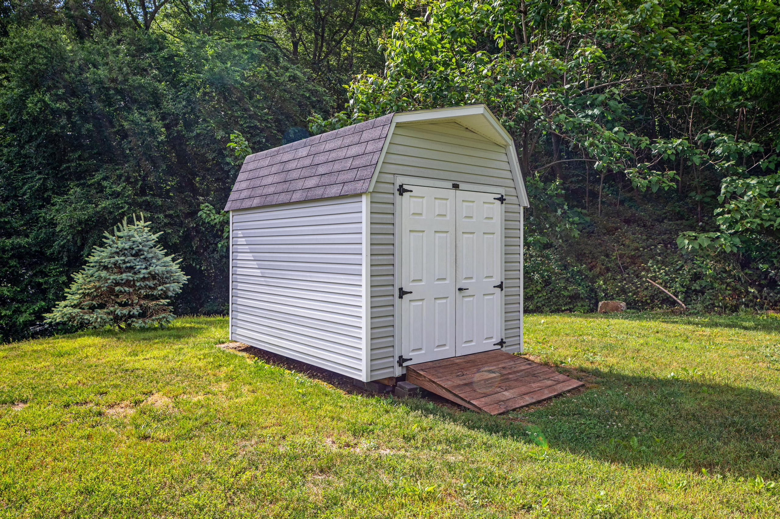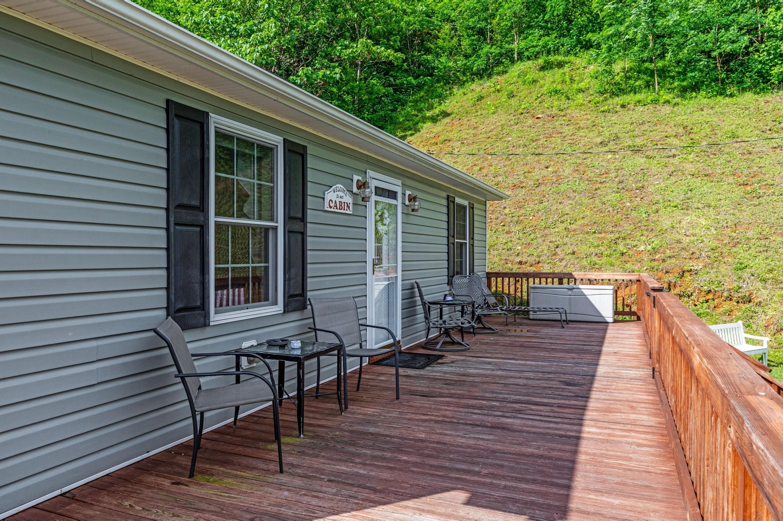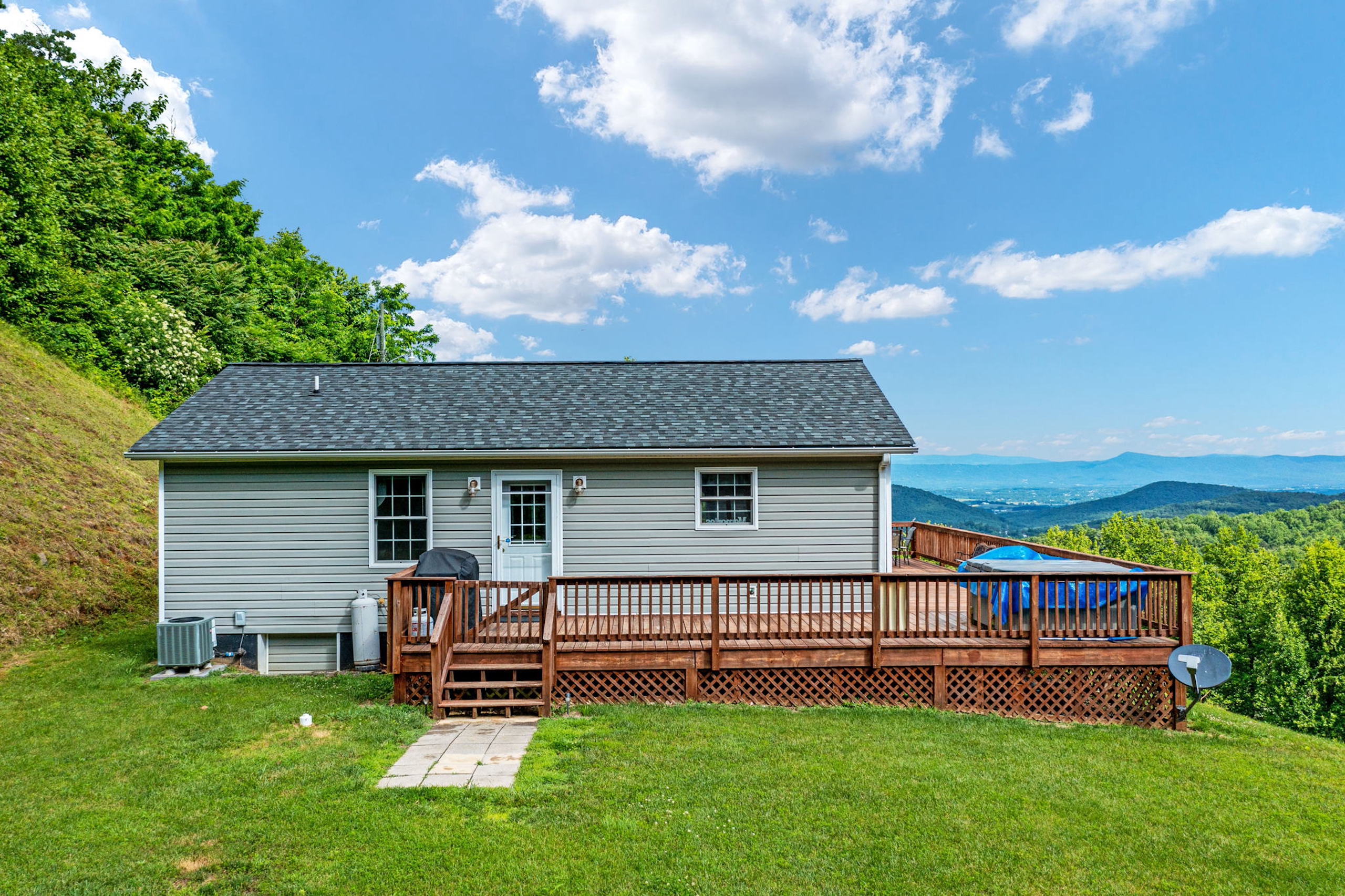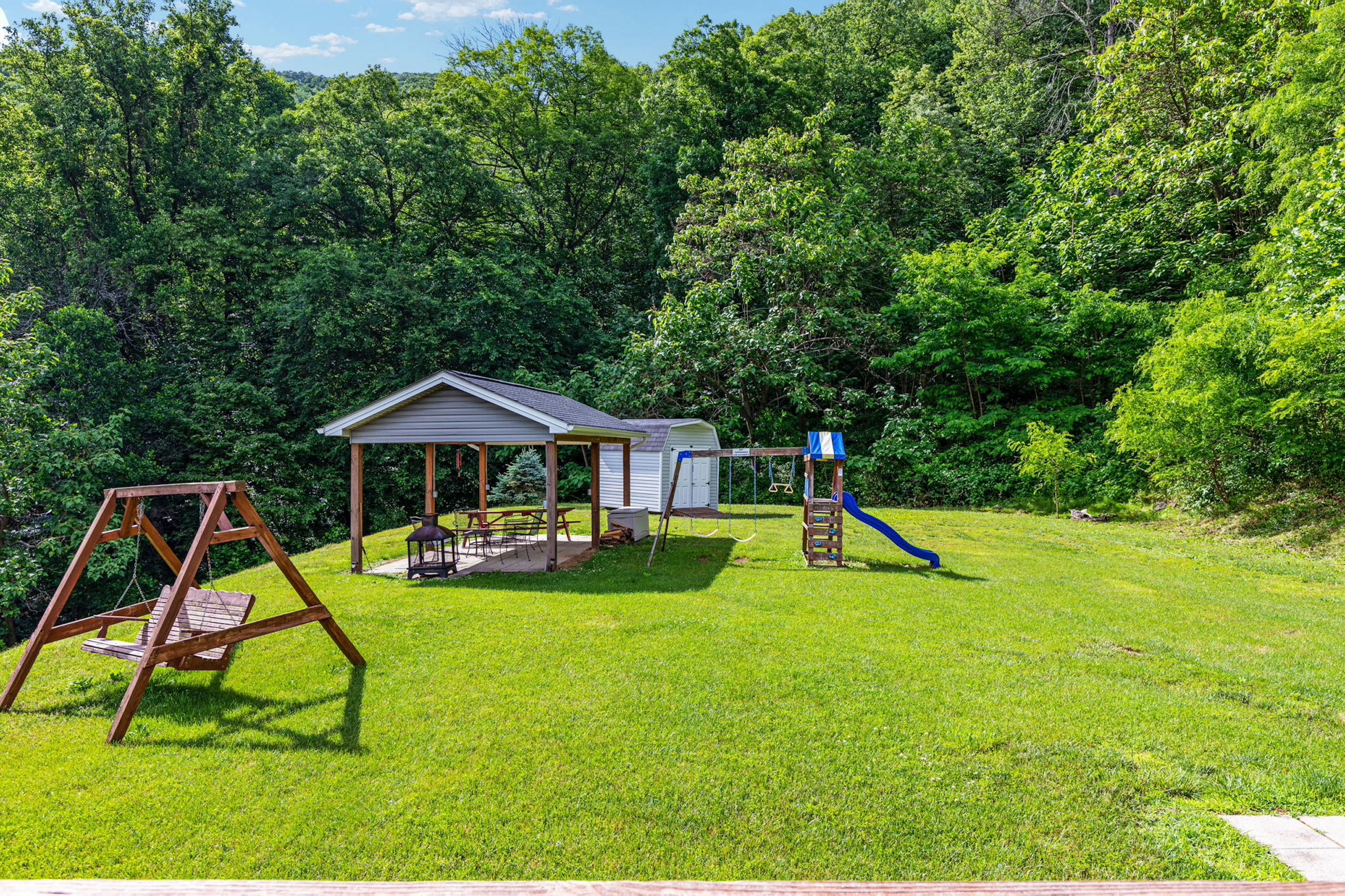 - Wrap-around deck, picnic shelter, storage shed, and hot tub