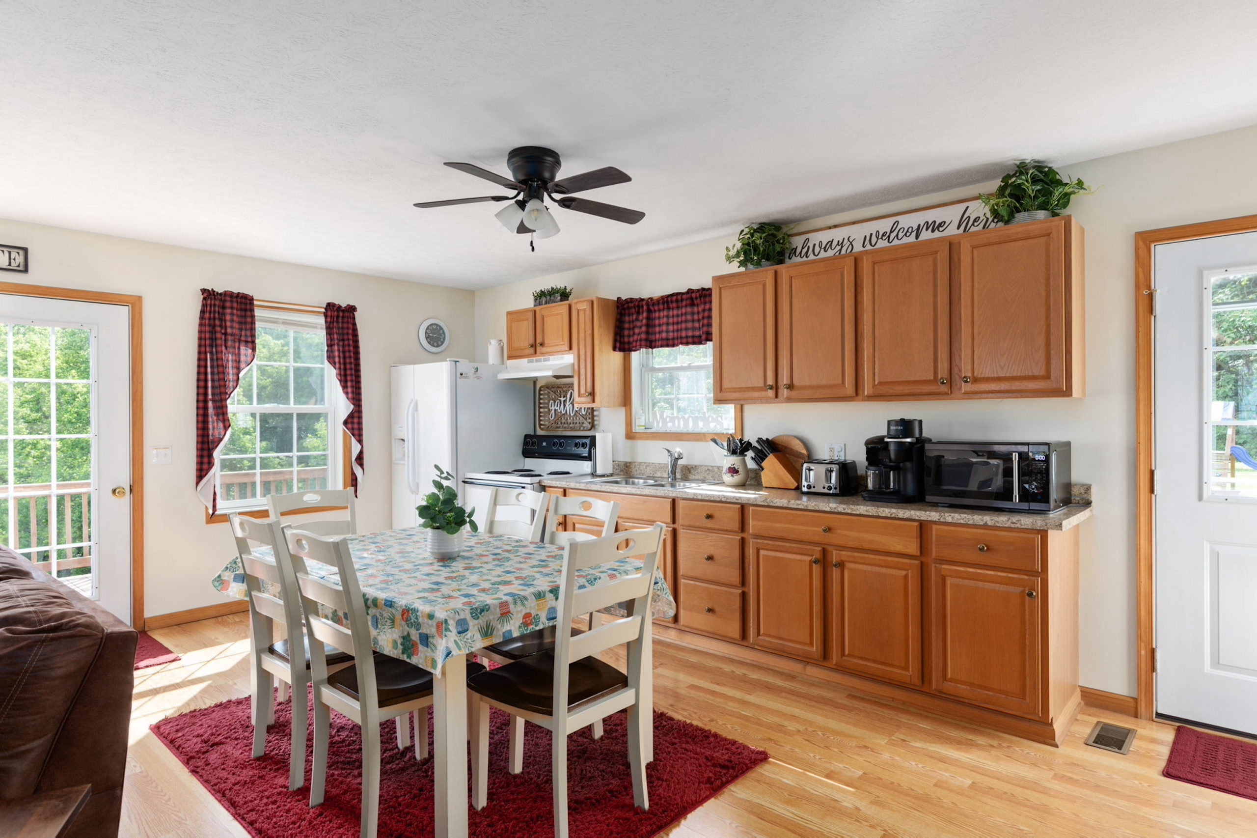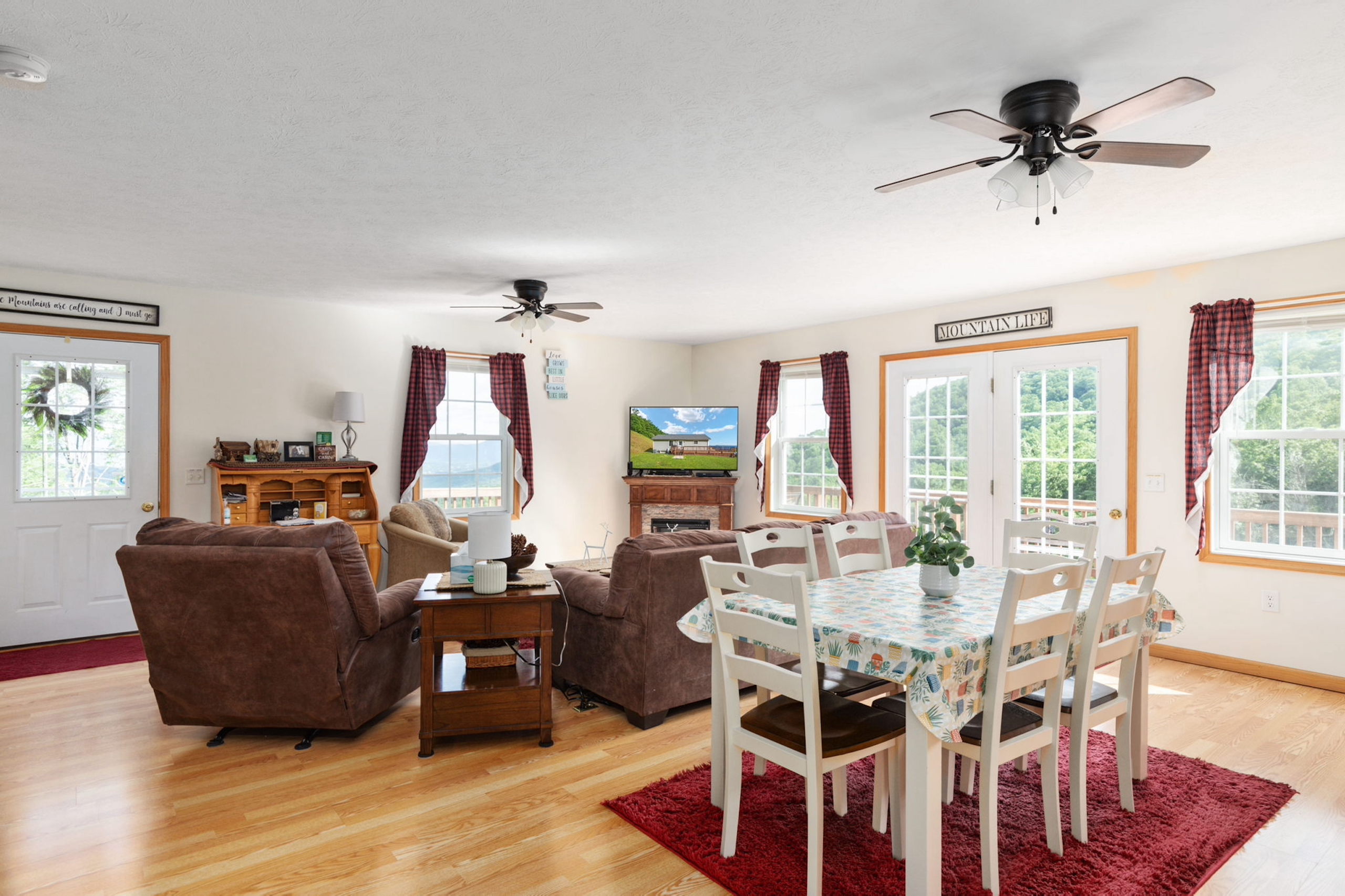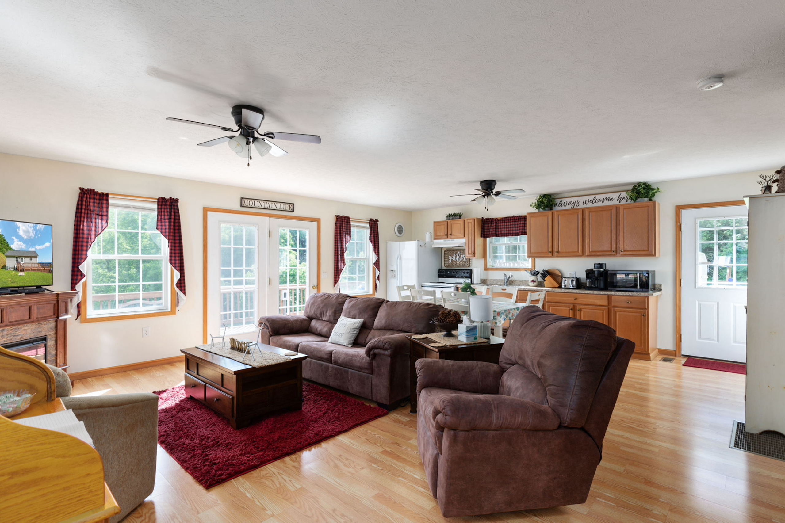 - Featuring a large living room, dining room, and kitchen combo space