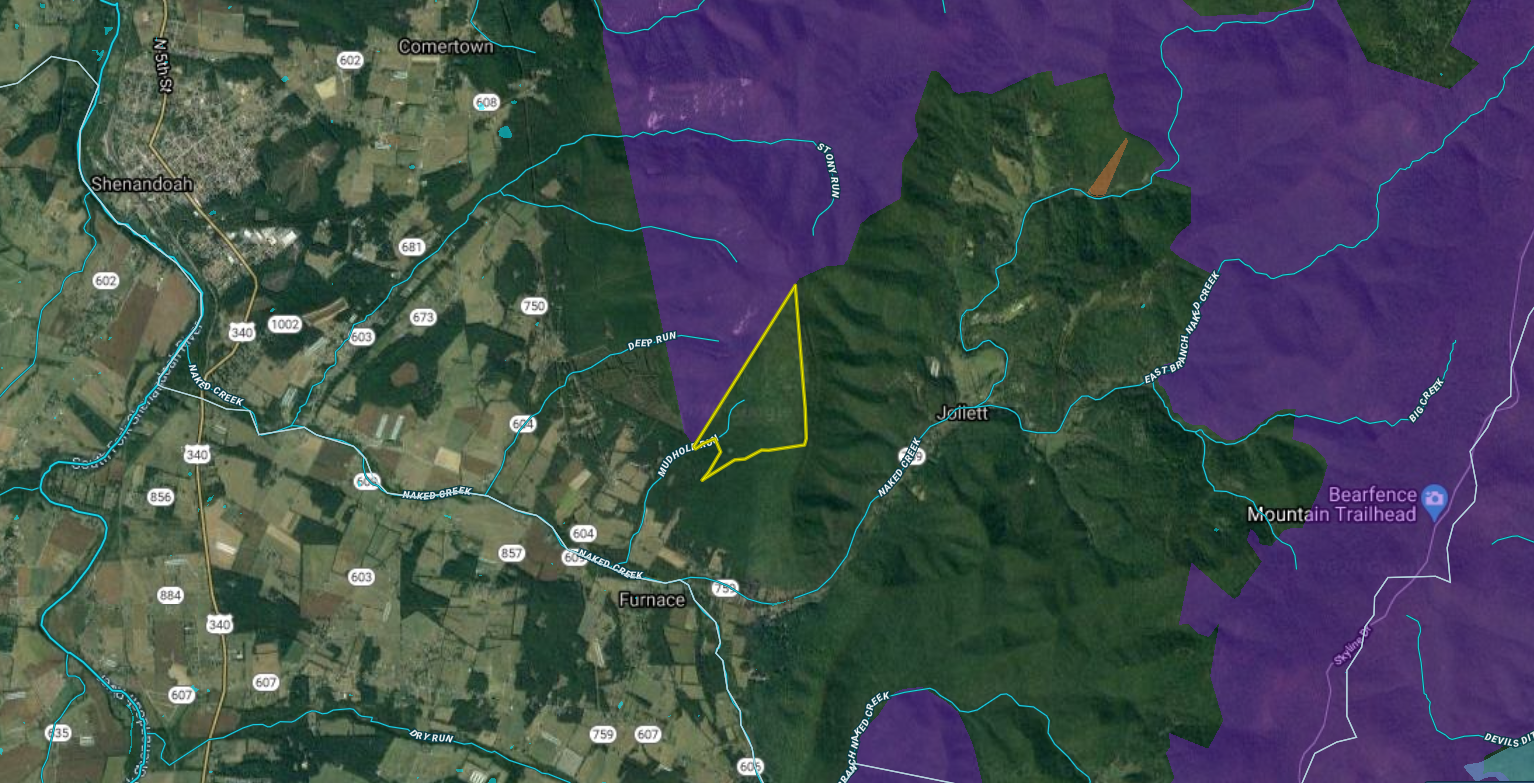 Not many parcels left with this much acreage and even fewer with this amount of Shenandoah National Park frontage at 1-mile +/-. This property would make an excellent hunting camp or investment tract. Access is secured by a deeded 50 ft right of way off Naked Creek Road. Established roads and trails throughout the lower section of the property. Various home sites would be possible on the lower section. The upper section of the property has been undisturbed. Wildlife is abundant and the property offers diverse sections of timber and habitat. There is water year-round and a food plot in place to attract and hold game. Situated just outside the small town of Shenandoah and only a short drive from Harrisonburg. Please contact me for a private showing.