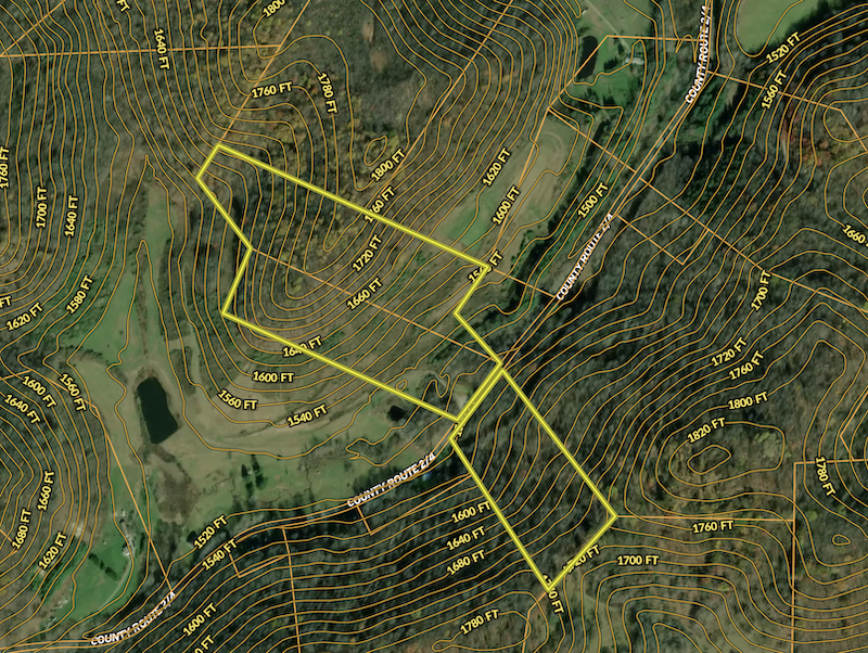 The terrain consists of a blend of open fields and wooded areas. The open portions may be suitable for small-scale farming, pasture, or food plots, while the wooded areas provide cover and habitat for wildlife. The pond offers a water source for wildlife and recreational enjoyment, while the stream adds natural character and drainage benefits. These features contribute to the property’s suitability for outdoor recreation, hunting land use, and rural enjoyment.