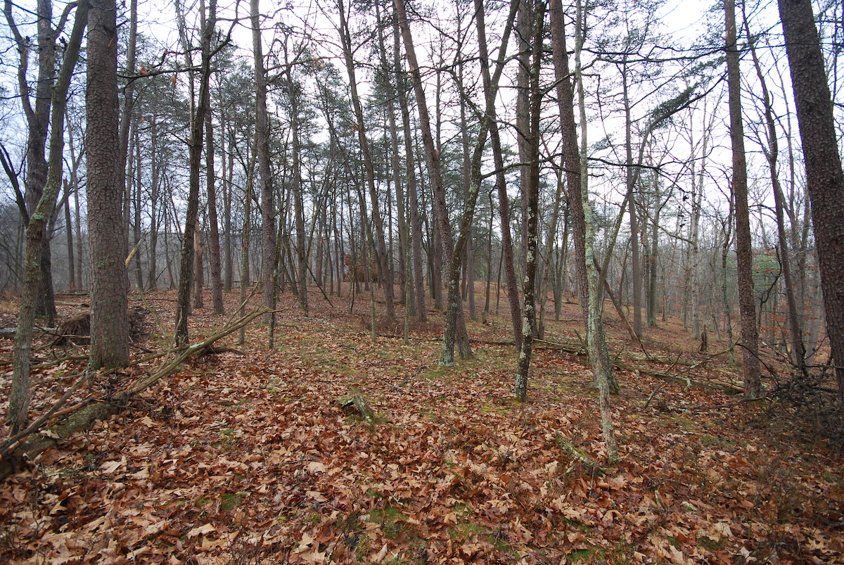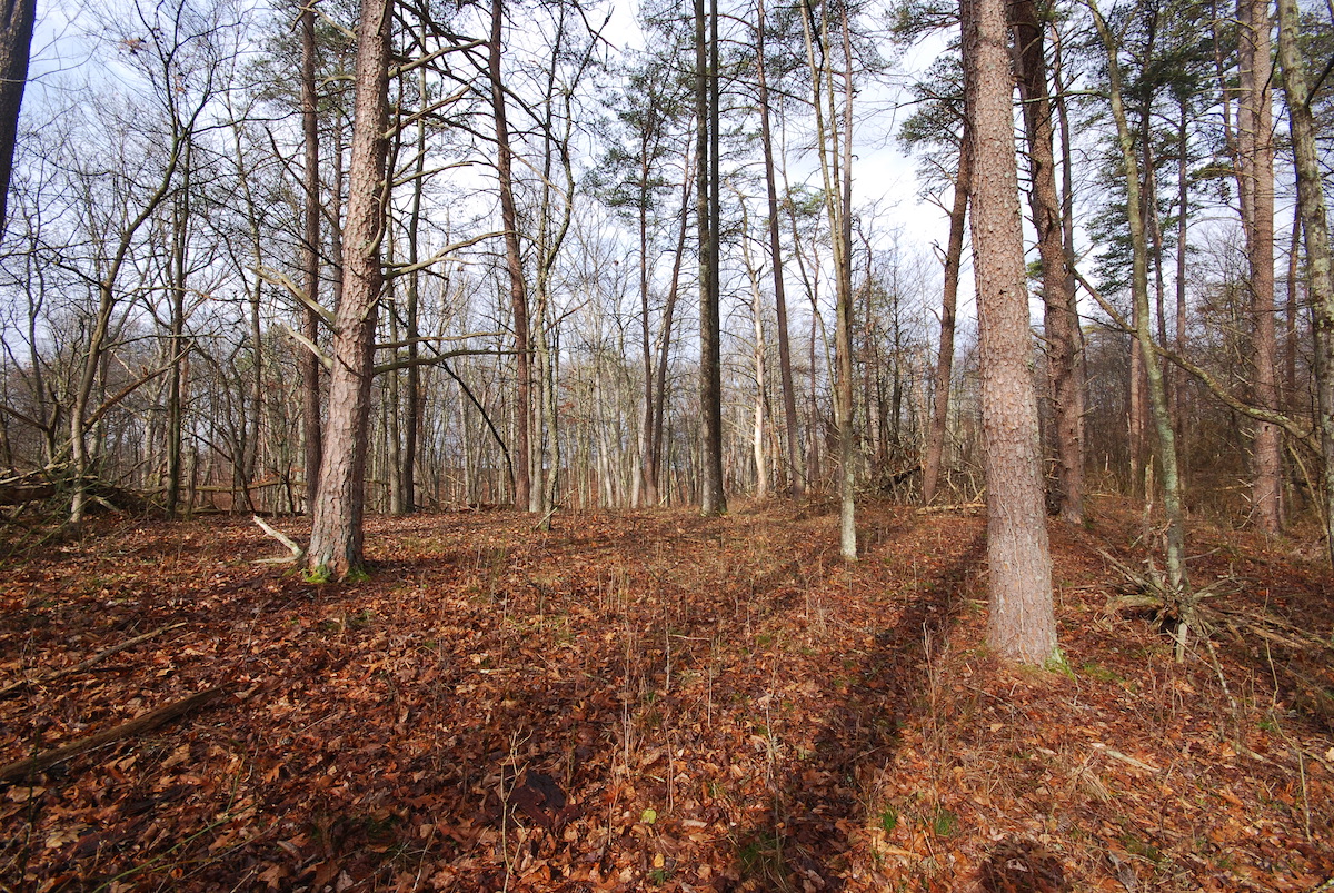 The land is characterized by open hardwoods that create a welcoming forest floor and excellent visibility throughout much of the property. Along the ridge, a mix of pines stretches across the landscape, adding diversity to the timber and enhancing wildlife habitat.