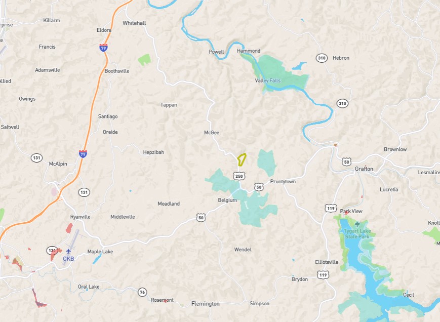 In addition, a permanent easement (to be verified during title work) conveys with the tract for a third access point through the neighbors on the east side of the property to provide a third hunting access point to the ridge. Big oak, maple, and sycamore trees are scattered throughout the property, and there is some timber value. The owner has never logged the property but is unsure when the last time it was logged. There is extensive logging road infrastructure throughout the hillside – making excellent UTV travel corridors and hunting pinch points. Prunty Town State Farm Wildlife Management Area is just a stone's throw to the east and south. Tygart Lake State Park is just a few miles to the southeast and provides incredible fishing opportunities for walleye, musky, crappie, perch, catfish, bass, and panfish. Mineral rights are not included with the sale.