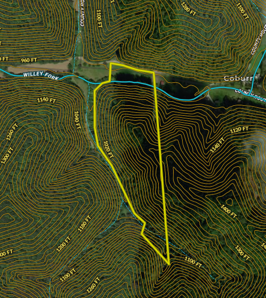 With approximately 650’ of road frontage, stream frontage, hillside timber, a few acres of field, and the top of the ridge, this tract is the full package. If you are looking for a rural getaway or a hunting property, this entry-level property has a lot to offer. Wiley Fork runs through the north side of the property parallel to County Route 1/9. This is an affordable property in a remote part of the hill country outside of Pine Grove. About 2700’ of Wiley Fork tributary runs along the west side of the property and there are approximately 3 acres of field on the north end directly next to the road. Approximately 2/3rds of the field is shown to be in the FEMA floodplain next to the stream. You can build a cabin or house at the field or plant it as a food plot for the wildlife. The hillside timber features hardwoods of varying age, species, and diameter. There is some mature timber and timber value is present on this property. It has not been logged in a long time. The property is located about 23 minutes east of Pine Grove and has excellent road access. The nearby area features Lewis Wetzel Wildlife Management Area. If you are interested in this great hunting property, give the listing agent a call. Mineral rights are not included.