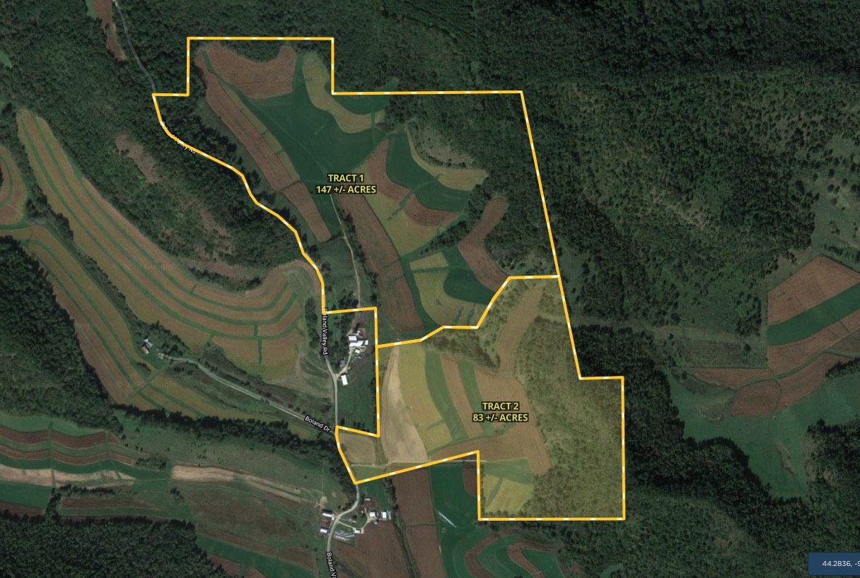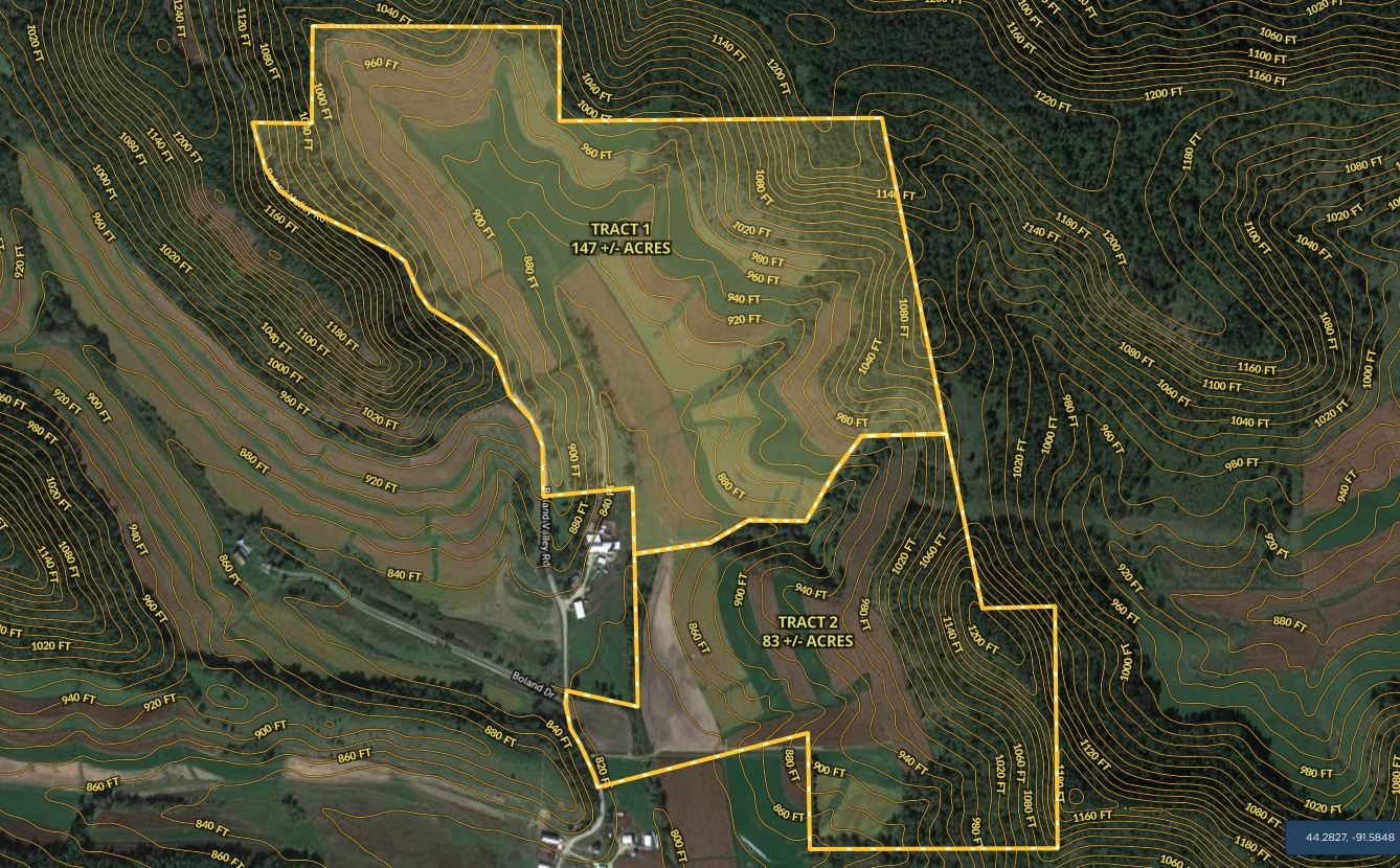 Tract 2 - 83 +/- acres. This is a beautiful family farm in famed Buffalo County Wi that runs about ¾ mile up and down Boland Valley. The entire farm is viewable from Boland Valley Road which runs the entire west edge of the property, so I encourage you to take a look. There is some timber available for hunting and this valley has historically produced bucks up to 170” class. There is 42 +/-ac of tillable land with the remaining balance in thick buck holding timber and brushy hillside. Farm tenancy is open after harvest of the 2020 crops. Great road access.