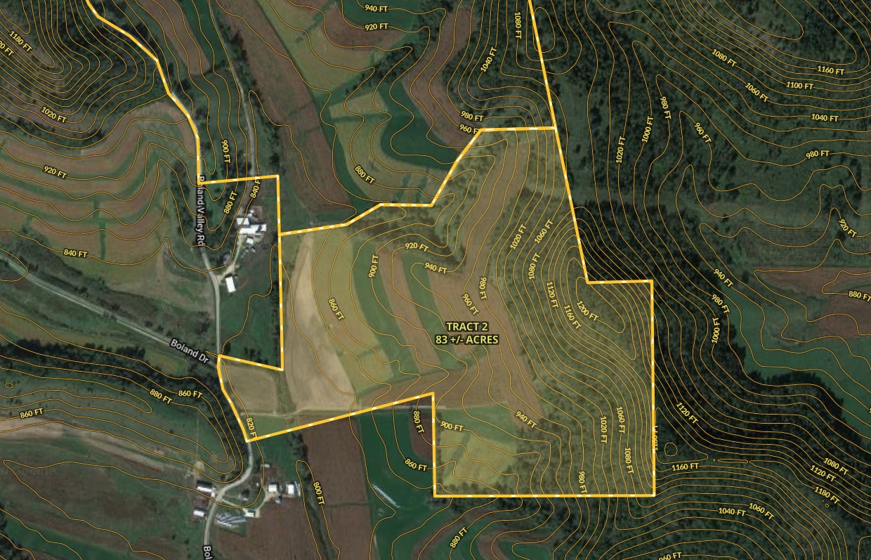 Tract 1 - 147 +/- acres. Located in the northern end of Boland Valley and can be seen by driving the west side of the property on Boland Valley Road. This parcel is comprised of 81 +/- acres productive tillable ground. The balance of the parcel is thick timbered side ridges on the east side that is sure to hold some of those trophy bucks Buffalo County is known for. Access is from the west end of the farm thru a deeded 33-foot easement. There is a small amount of pasture land for cattle on the west side. Farm tenancy is open after harvest of the 2020 crops.