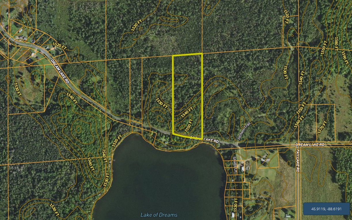 This parcel checks all the boxes if you have been thinking about an affordable lot for your cabin, travel trailer or building a home. Lake of Dreams, a 62-acre gem, is right across the road and the boat landing is only 250 feet east of this parcel. There is power along the road, the land is high and has lots of mature trees, and the Nicolet ATV and Snowmobile trail is just ¾ of a mile to the west, so getting wherever you want just got fast and easy. If you have the desire to own a bit more land, the adjacent 9.4+/- acres are also for sale. Think about owning over 19 acres very close to a lake for a very affordable price. It is ready to provide your Northwoods escape right now. (The seller’s cottage, right across the road, sits high above the Lake of Dreams might still be available, be sure to inquire about it if you want the prettiest spot that overlooks the entire lake.) For the most accurate information about this property, contact Terry Patrick, the listing agent.