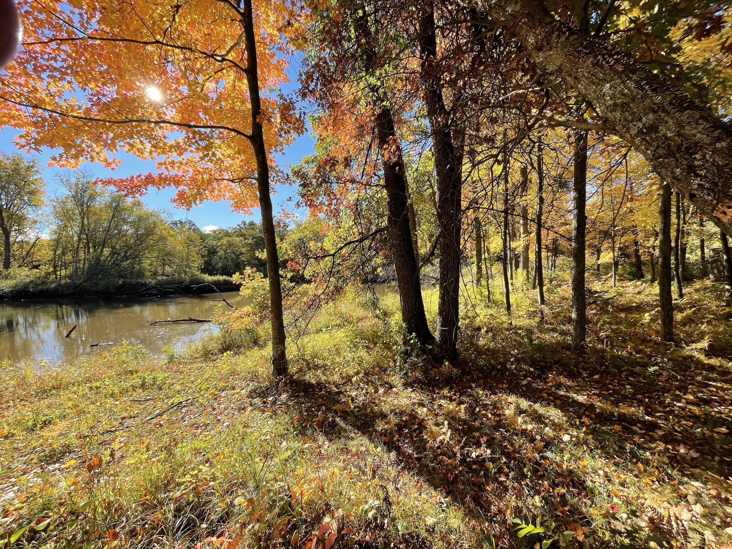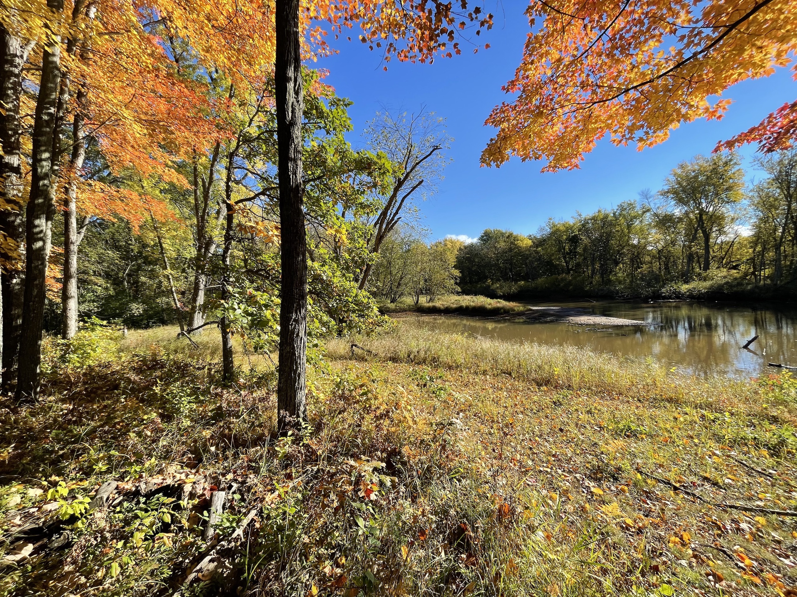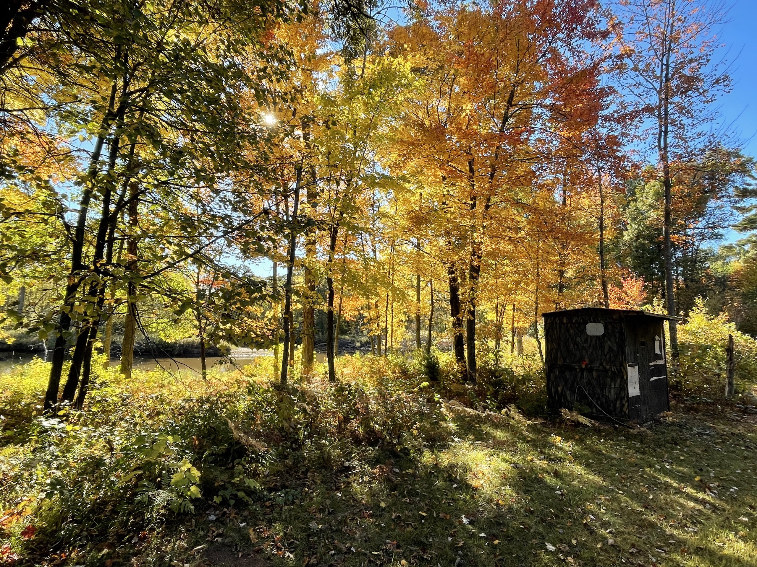 Along with deer and turkey hunting, there is great fishing on the river. Thanks to the main channel running through the property, walleye and Muskie have been caught by the owner. You can easily walk out onto the little peninsulas and cast into the deeper areas from there. Along with the great fishing, there is also some great duck and goose hunting. A duck blind on a raised platform comes with the property overlooking a small backwater pond where ducks regularly come. Situated on the river's main channel is a small decoy shed where you can keep all of your duck and goose decoys. This allows you easy access when getting ready in the morning for hunting. You will enjoy many different seasons on this property thanks to the variety of environments you encounter over the parcel.