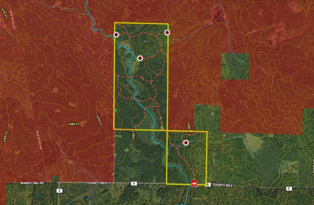 Food plot, Trail network, Tree stand/Blinds, Internal Road Network, Gated entrance