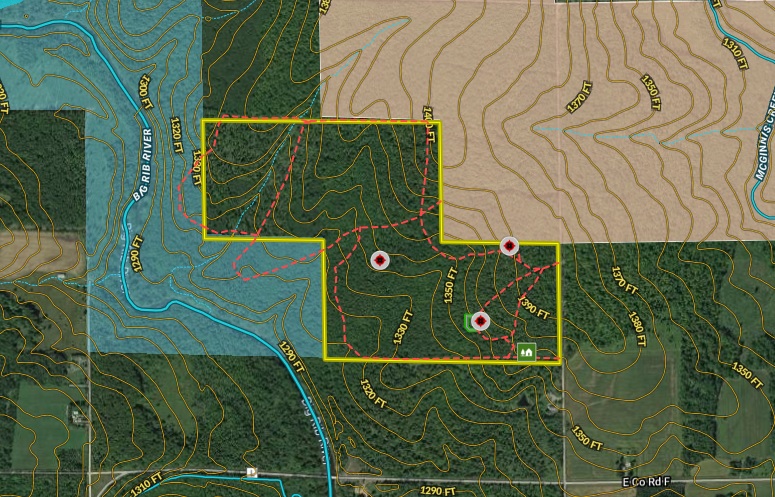 Turn-key hunting camp with tremendous big buck history featuring hardwood timber, a food plot, blinds, and trails adjoining the Big Rib River Fishery Area. This very nice off-the-grid cabin awaits your stay with comfortable accommodations including a large bunkroom with built-in bunk beds. Share stories of the day’s hunt and warm up in the cabin as a wood fire crackles in the background. From the cabin, take to the extensive trail system through stands of beautiful hardwood timber to access the elevated box blinds that were strategically placed in productive locations. The well-manicured food plot is a deer magnet that tilts the odds in your favor to fill your tag come hunting season. This property has yielded many big bucks over the years and trail camera pictures from after the 2020 gun season show several nice bucks still running around! Additionally, the property adjoins the Big Rib River Fishery Area with the Big Rib River flowing through just a short distance across the boundary line. The Big Rib contains brook trout, brown trout, and smallmouth bass. This state land is open for you to expand your huntable area, and the public access point for the block to the west is across the river, so this portion is not easily accessed by the public. You do not want to miss out on this tremendous opportunity! Contact listing agent Luke Gliniecki today to schedule a tour of this exceptional property!