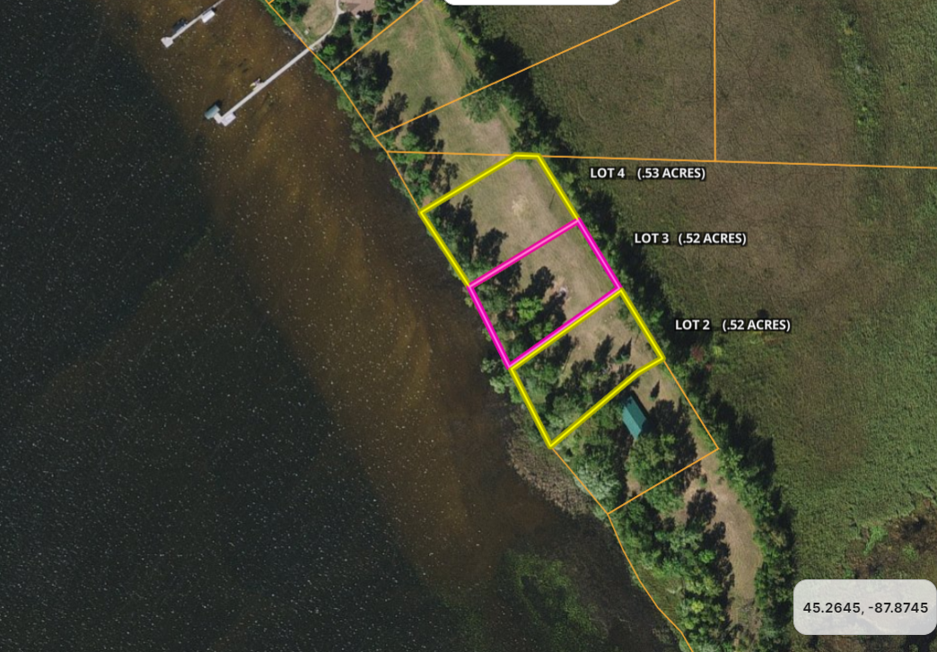 Lot #3 provides 122.80 feet of shoreline on Lake Noquebay’s northeast corner, likely the premier location on the lake. This lake is 2,398 acres of fun that lasts all year long. The shoreline is sandy and allows for water sports of all kinds as kids wade, swim and play in the safety of a gradual sloping lakebed. Just east of this parcel is a 1,300 acre section of property under WI DNR control referred to as the Lake Noquebay Wildlife area. The area is open to the public for activities such as hunting, trapping, hiking, snowmobiling, cross-country skiing, wildlife viewing, fishing and bird watching. This is the quiet end of the lake, a more natural feel exists here. It is 3 1⁄4 miles across the lake from inlet to outlet and 1 3⁄4 miles across from north to south. The fishing here is fabulous with multiple species available but it is best known for an abundance of large Bluegill and Crappie. The Fish-O-Rama, held each February, brings fishers from all over the region as the ice fishing is tremendous. If you feel that you would like just a bit more privacy please be sure to inquire if lots #2 and #4 are still available (both have over 120 feet of shoreline). You will find it difficult to locate a parcel like this one almost anywhere in the north and when you visit the property you will feel a sense of peace. The snowmobile trail is just down the shore, resort owners are waiting for you to introduce yourself and if you like to ATV or UTV you came to the right place. Tried sailing yet? This lake is big enough for a good breeze. In the evening you will enjoy sitting on your dock or in the yard watching the sun set in the west over the glistening lake while fish hit the surface and waterfowl fly overhead. Maybe just jump on the pontoon for a long cruise, this lake offers it all. The pictures tell the story, look them over once more and give me a call. This is a flat buildable lot with just a few feet of drop to the water. There is no HOA in place either. I look forward to meeting you to show you one of the best lake properties in the northeast corner of the state. For the best description of what this property can provide for you and your family be sure to contact Terry Patrick, the listing agent.