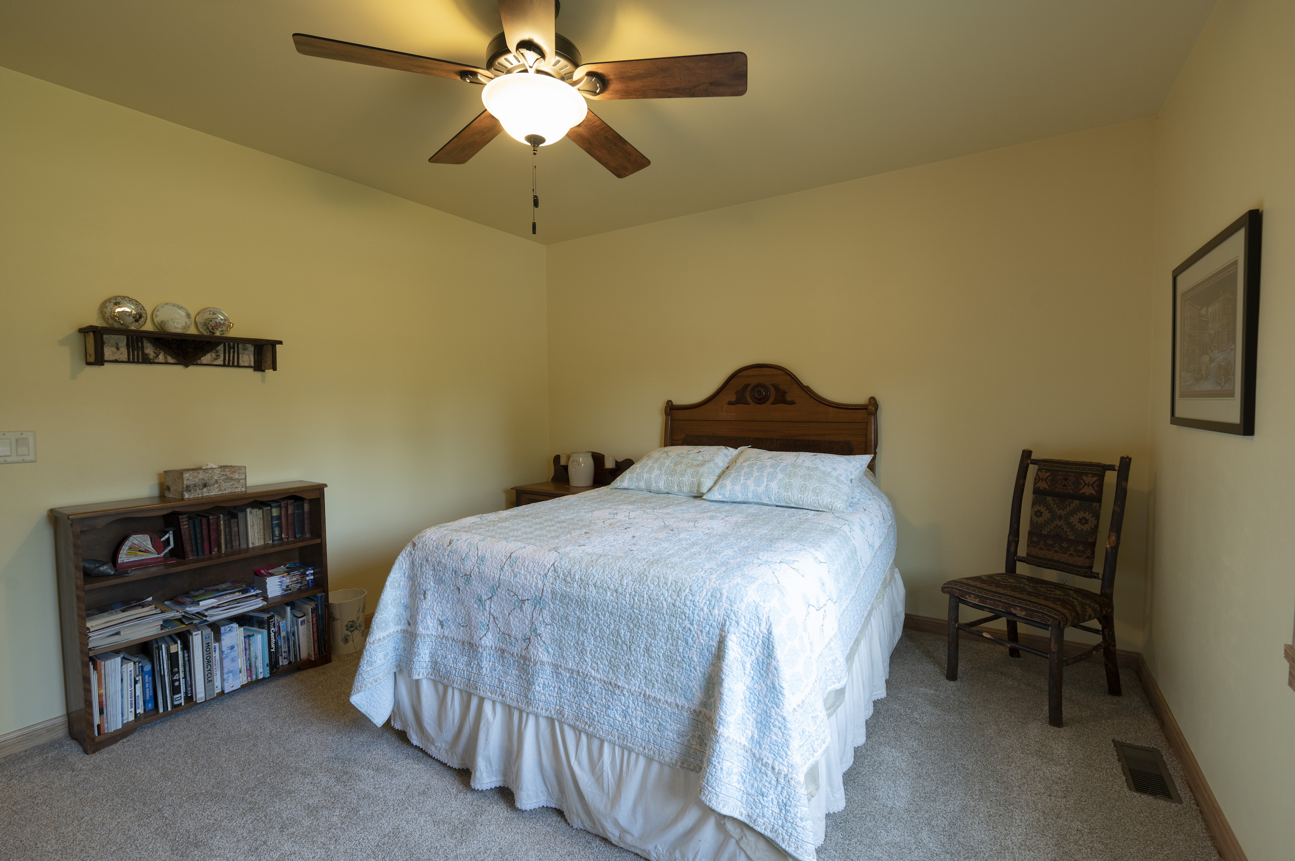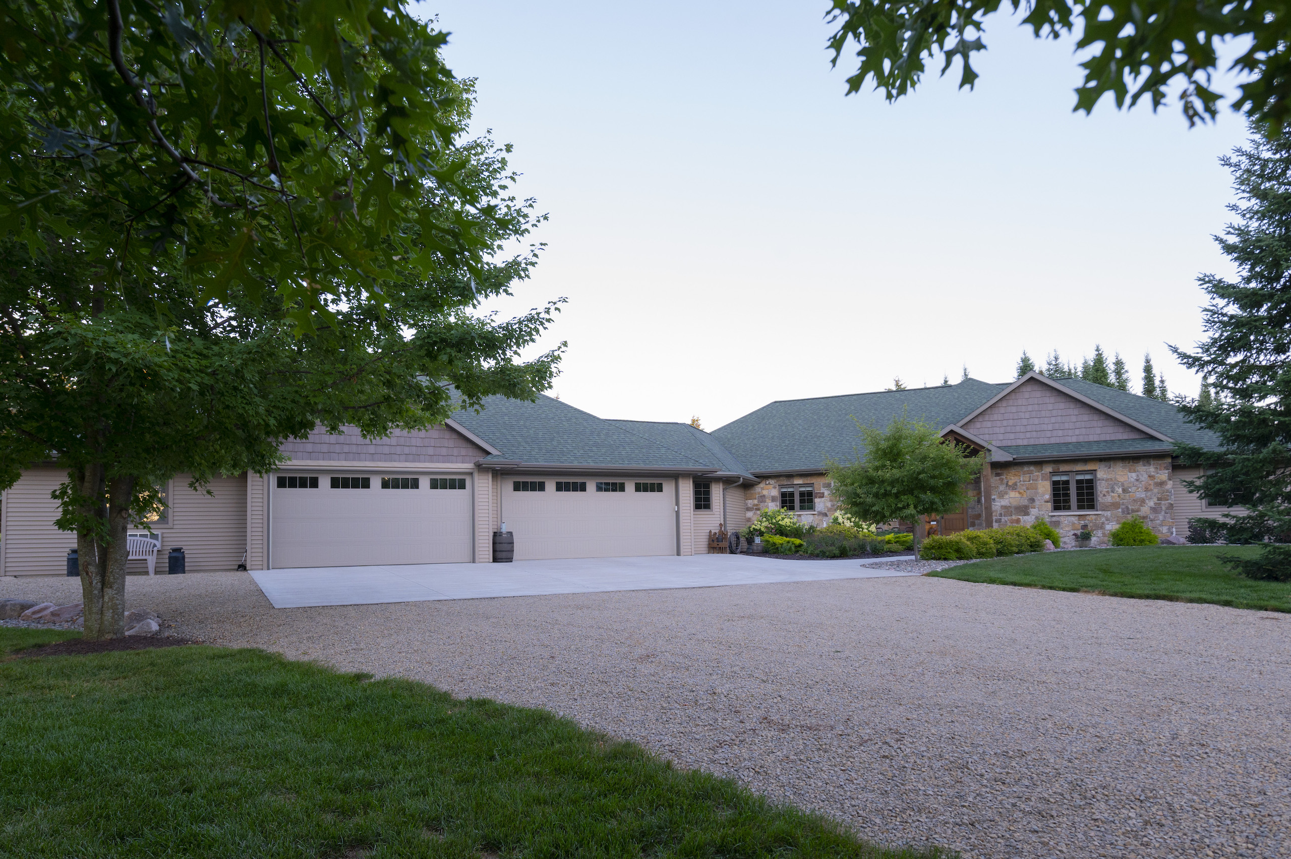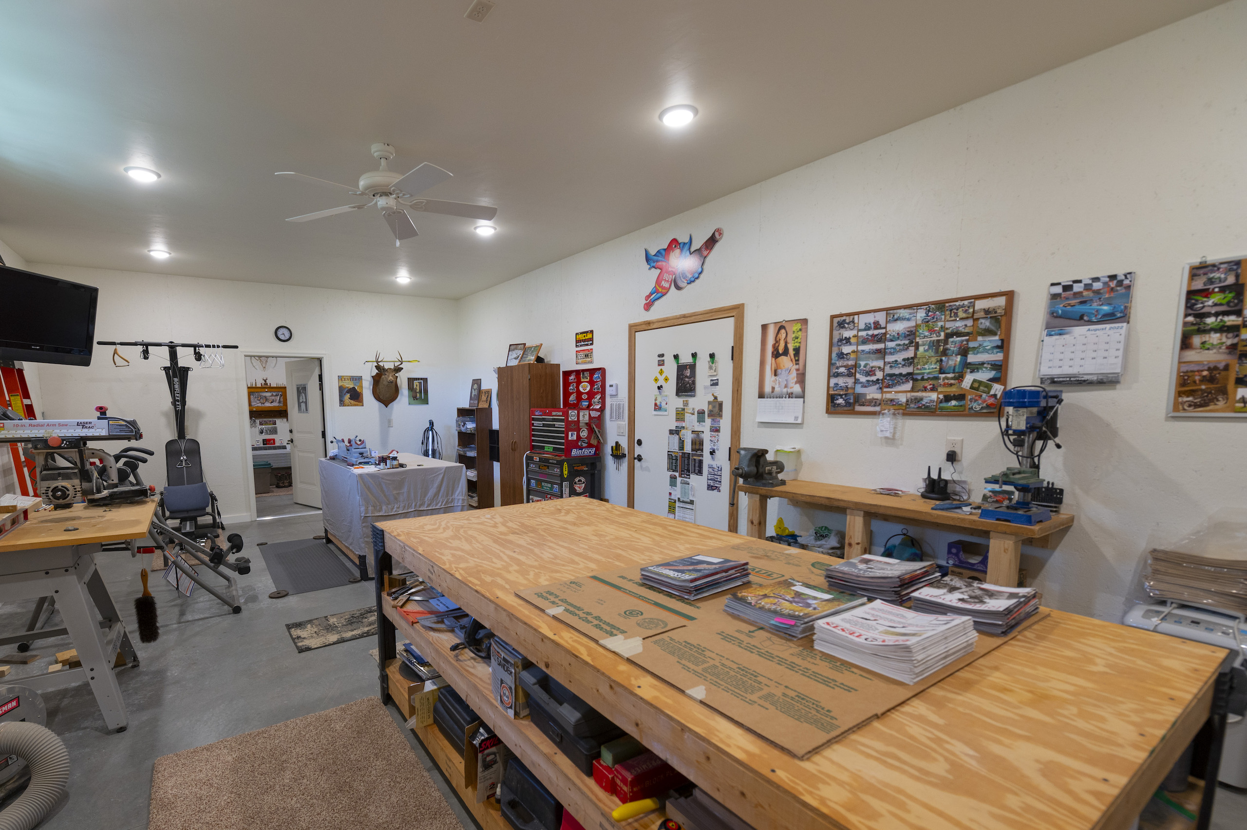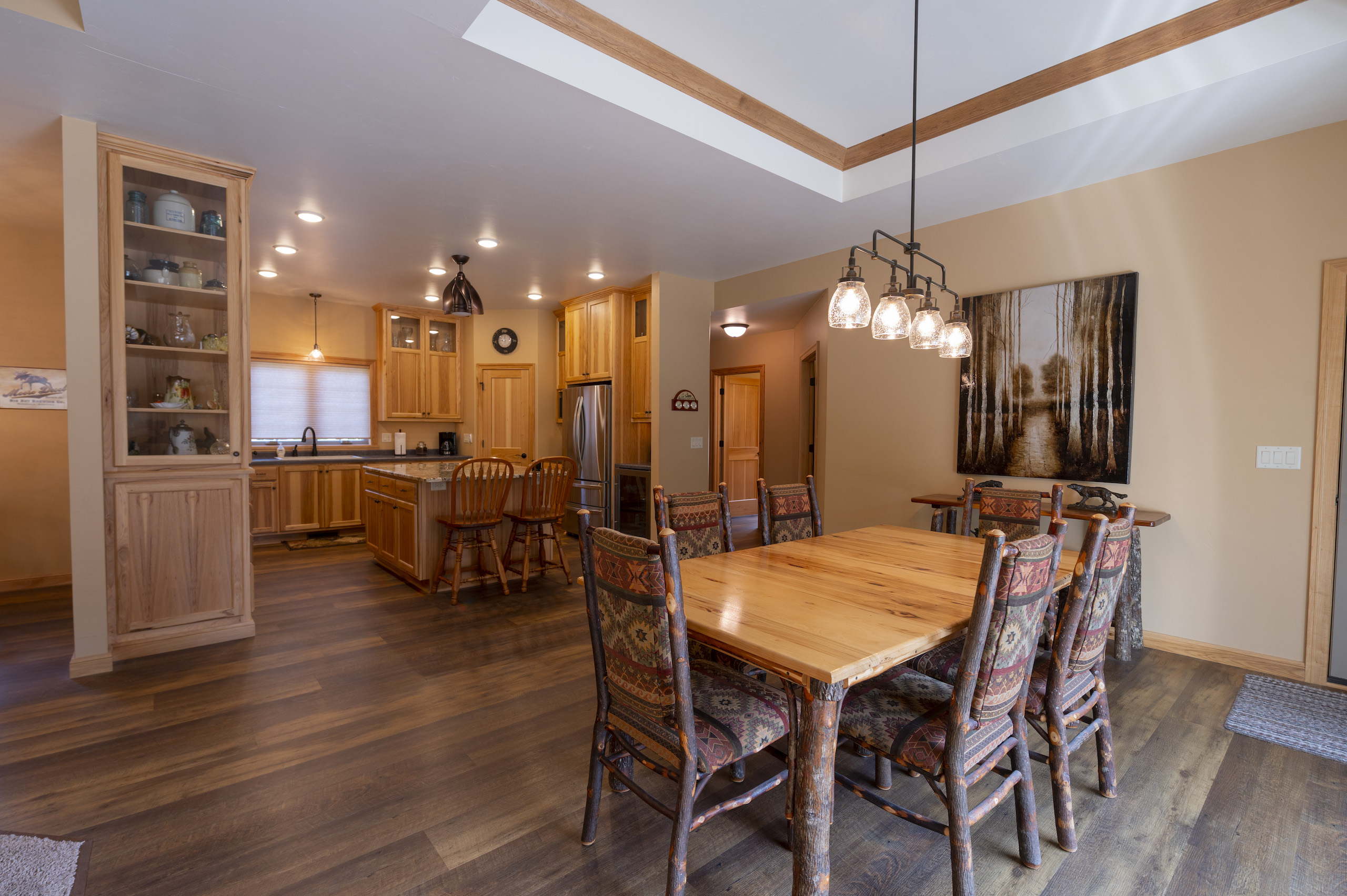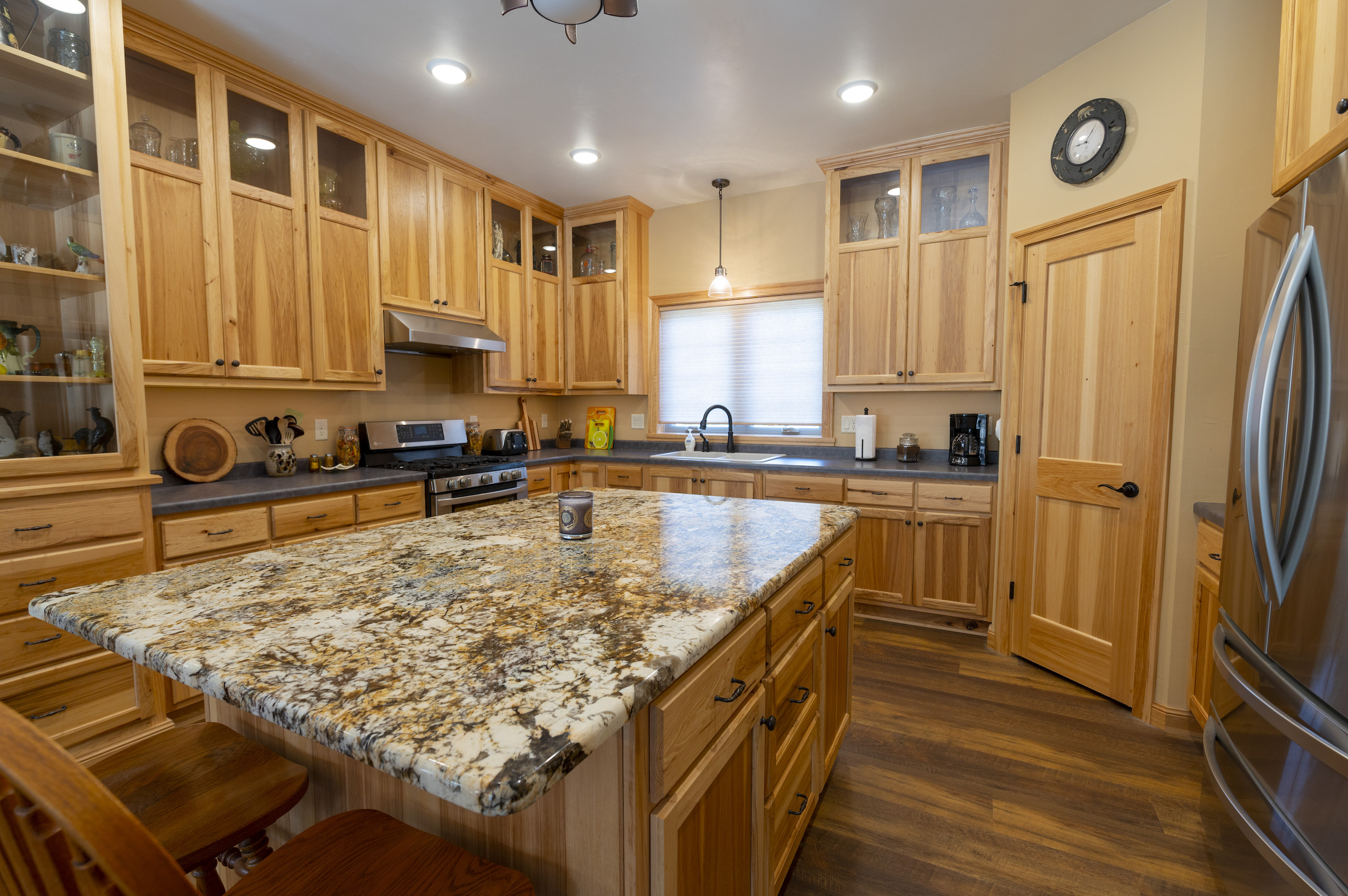 The heated garage includes a dog wash, a large closet, a 195 square foot “she-cave” (climate controlled) for quilting, sewing or painting , and enough room for 4 vehicles. The bays are served by 16’ wide overhead doors and there is also additional storage area for other toys like ATVs or snowmobiles, all of which is heated. A workshop measuring 460 square feet is attached to a reloading room that provides an added 160 square feet. In all, the garage and attached rooms measure 2,307 square feet and every bit is heated year-round. Add this to the living area and your new home provides 4,967 square feet of custom heated space specifically designed to accommodate a good-sized family, all of which is on the same level. But since the entire home is heated, no need to put on an additional layer to enjoy the rest of the home when heading to the garage or the work areas.