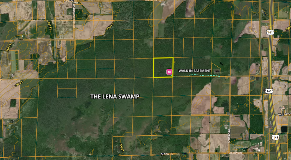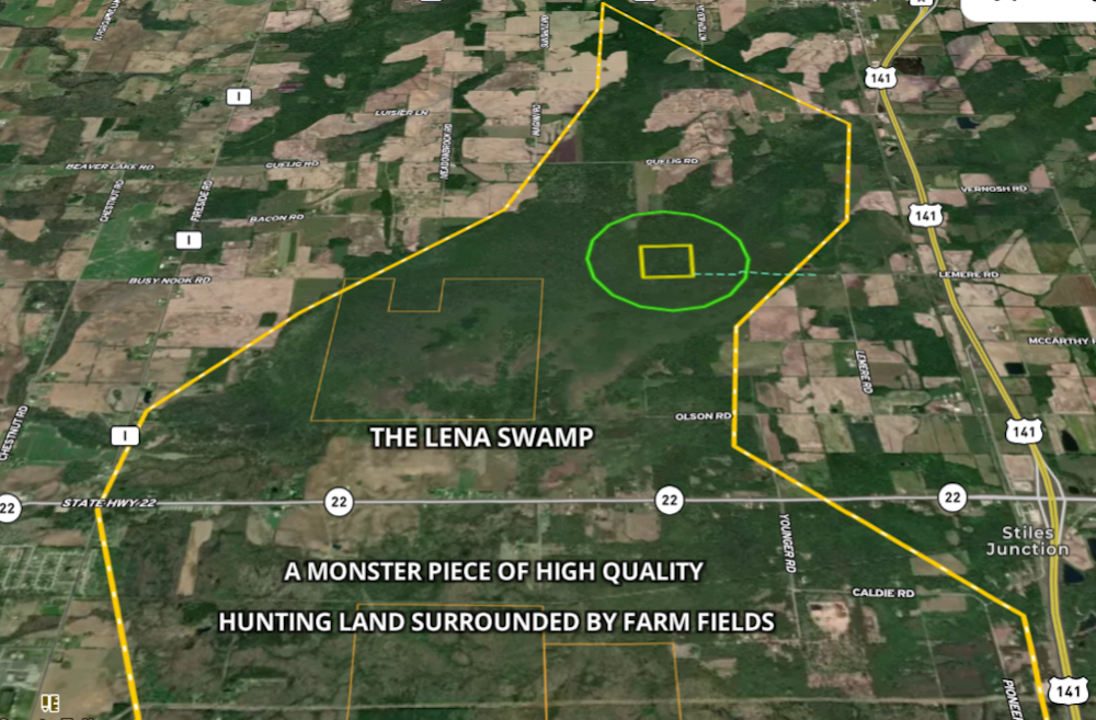 The famous Lena Swamp, just north of Green Bay, is renowned for its Monster bucks and this rare opportunity provides the chance for you to be a part of it. A really nice off-grid cabin is found in the southeast corner of the property along with a storage building to keep your possessions clean and dry. Getting to this parcel is done entirely on foot, and that is the principle reason why the deer grow so big and their numbers are so strong, they are always at peace in the swamp. Area farm fields provide the feed, the swamp provides the rest. As you know, most hunting in the mountains of the Western States is done on foot, this property is no different. The cabin is already in place, all you need to do is pack your food and put on your boots. A nice LP gas wall-heater provides heat, as does a small wood heater if that is your desire. The porch on the cabin will keep your clothes smelling fresh and your possessions dry. There are scrapes and rubs found within 100 feet of the cabin, remember the deer won’t hear you coming and you will be in your stand within minutes of getting up for the day. Take the time to study the small sample of the deer and bear seen on these 40 acres over the past few years, there are many, many more. Dominant bucks are continuing to spread their high quality genes throughout the entire swamp so don’t be surprised that the 140, 150, or 160 class buck you shoot this year will look a bit like the one you take next year or the year after. If you have patience to sit quietly you cannot sit in a better place. The rut provides lots of entertainment as bucks from all over the swamp look for a doe to spend a little time with, and it will happen right in front of you. Most of the deer in these pictures were taken from a favored stand or two quite close to the cabin. Instead of chasing your dream buck, let him come to you. The cover is heavy throughout the swamp with lots of cedars, aspen, maple and ash but it really opens up on the high ground near the cabin. If you have been looking for a fantastic big buck area, you found it. This property suits hard-core hunters to the bone, hunters who dream of hanging large racks on their walls year after year. Put just a bit of effort into walking to your cabin and live out that dream, the dream of holding bragging rights among your friends. Own this property and count on having more friends. It won’t last long, so be sure to call Terry Patrick, the listing agent. Own this dandy and harvest what the Lena Swamp continues to provide year after year for those willing to put in the time. If you don't believe your eyes, take the time to call one of the great sport shops in the Lena area, they will tell you all about your potential in the famous "Lena Swamp".