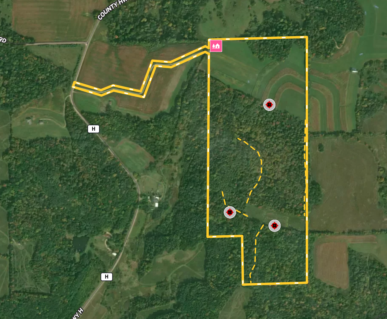 Trail network, Tree stand/Blinds, Internal Road Network, Gated entrance, Food plot