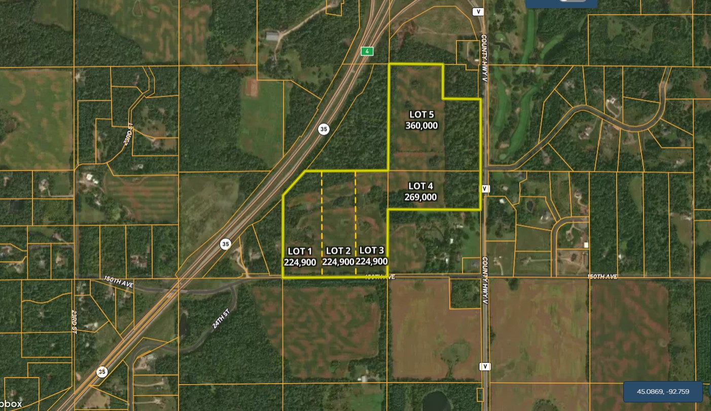 Land in Western WI is being developed at a rapid pace so this lot will be highly coveted. This lot #1 is part of a larger agricultural farm, the owner is now offering the land in 5 separate parcels. Lot 1 is the westernmost lot of three on the southern part of the farm. The buyer will survey the lots for accuracy prior to sale. Access is off 150th Street which is a low traffic dead-end road. Another major benefit is the parcel is located within a half-mile of the freeway entrance for an easy commute to the Twin Cities. Add in White Eagle golf course 2 miles south and St. Croix National Golf Course right across the street and you will agree this is a rare find indeed! Drive-by the property and if you are interested and give Neil A. Hauger a call today.