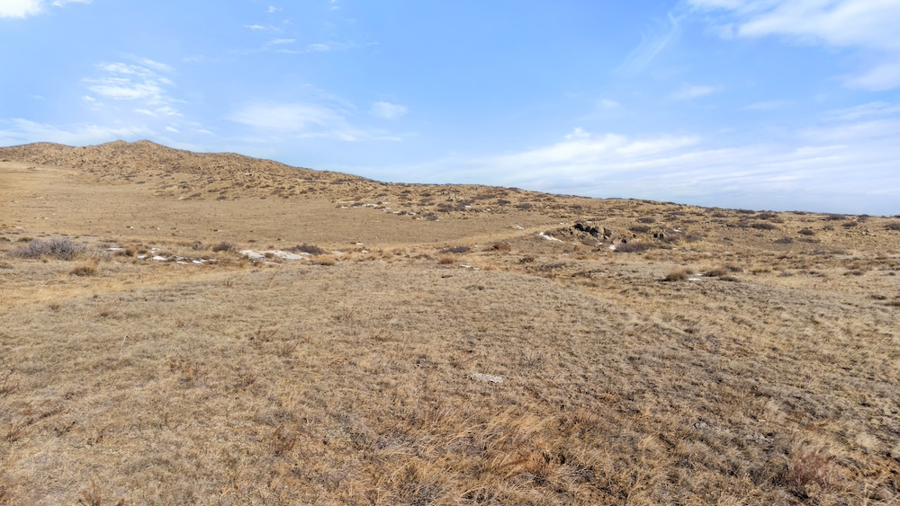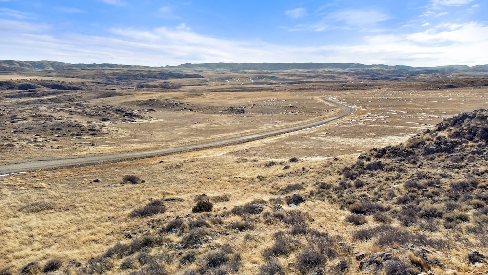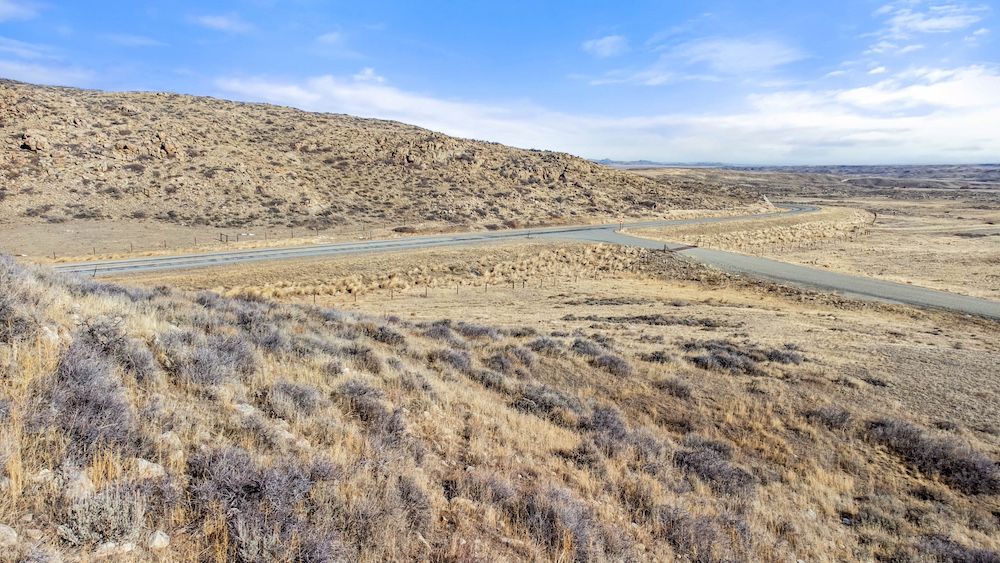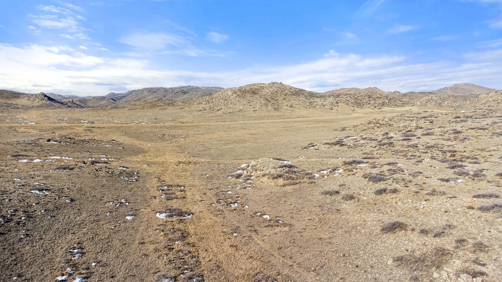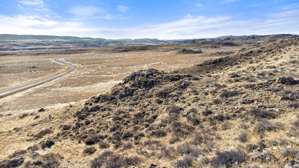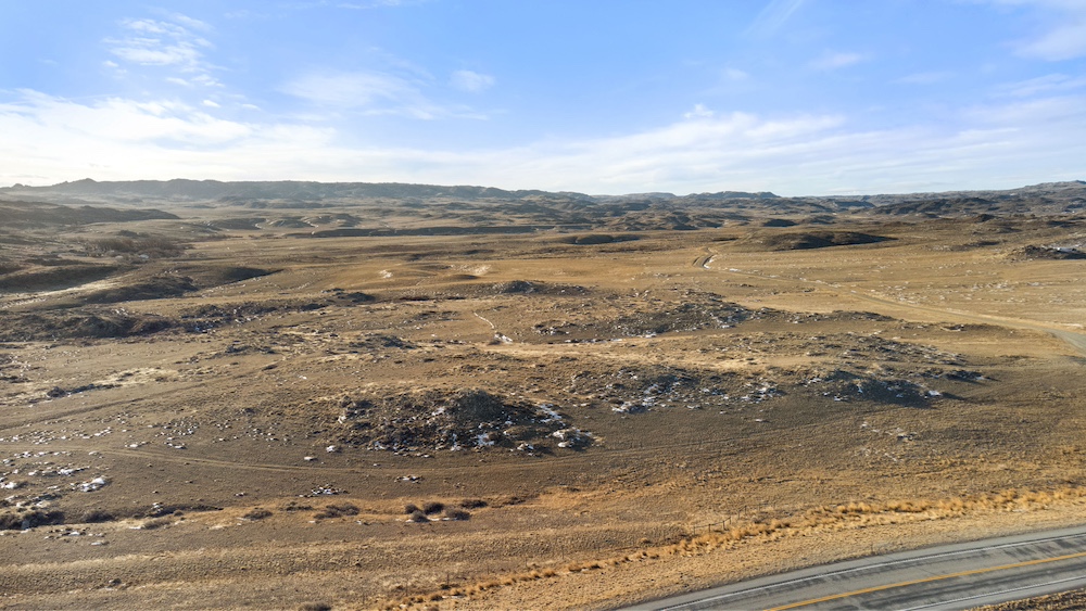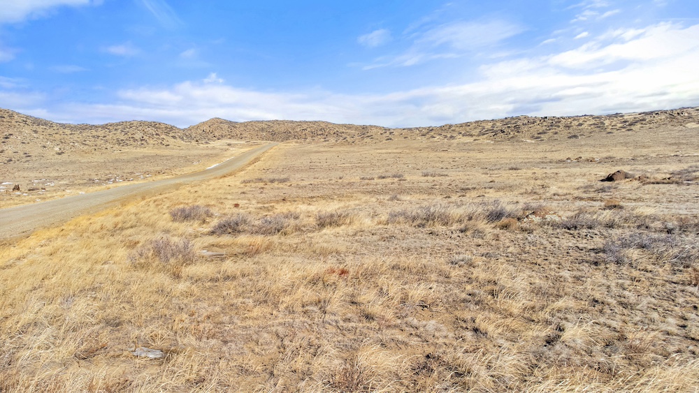 The land itself consists of rolling hills typical of the Sybille Canyon region. This terrain provides a mixture of elevated vantage points, gentle slopes, and natural breaks in the topography. The elevation variation creates multiple possible building areas, each with its own view orientation and landscape character. The rolling nature of the property also allows for natural drainage patterns and provides visual interest across the acreage.